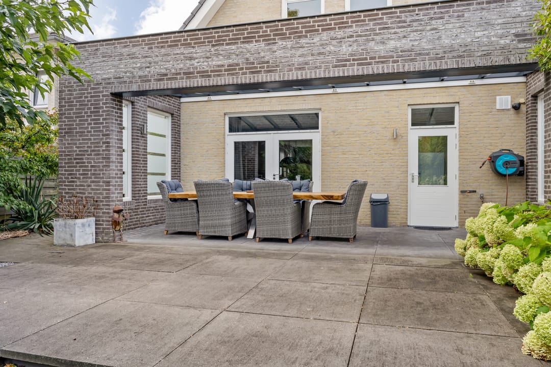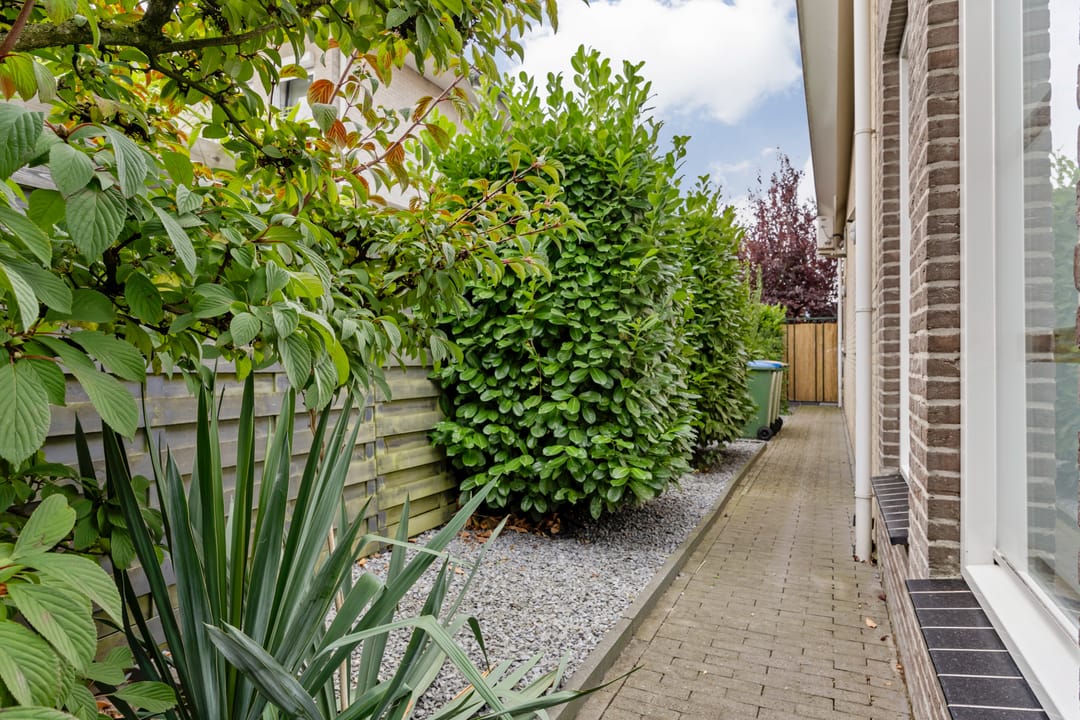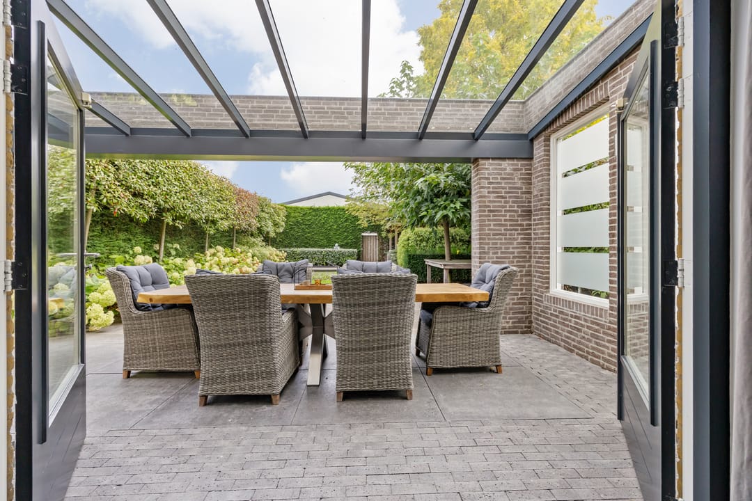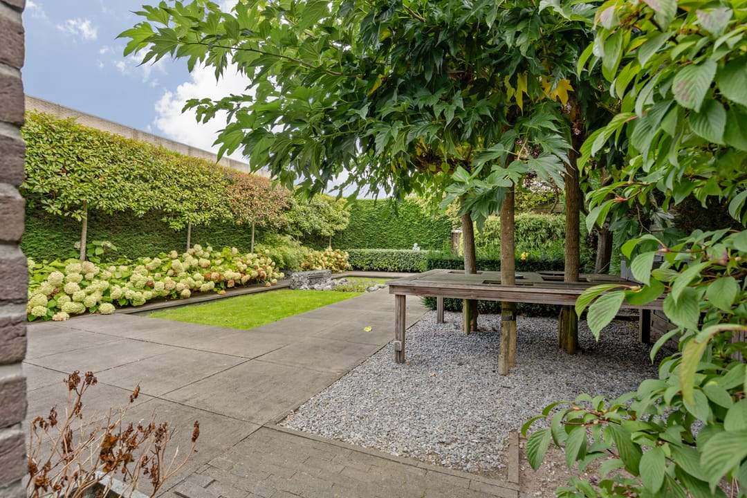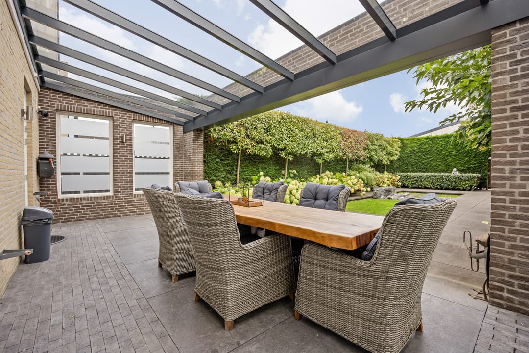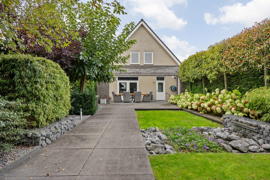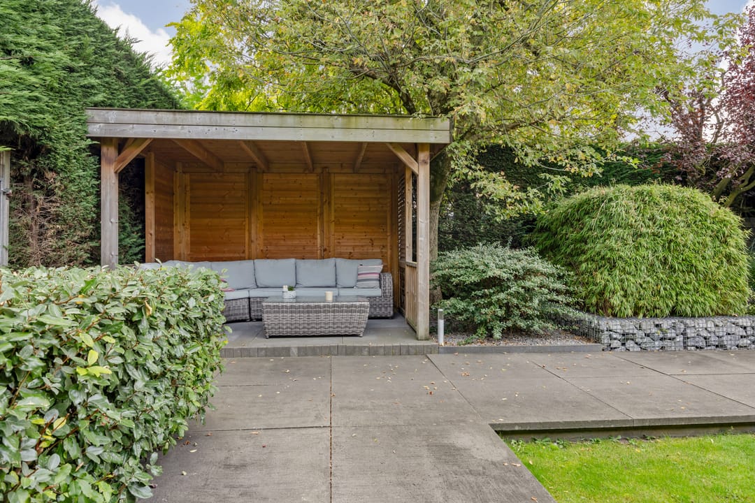 Fraai aangelegde tuin met veel privacy, diverse zonnige terrassen en een overkapping. Vanuit de tuin kan middels een poort toegang worden verkregen tot het terrein met de bedrijfshal.