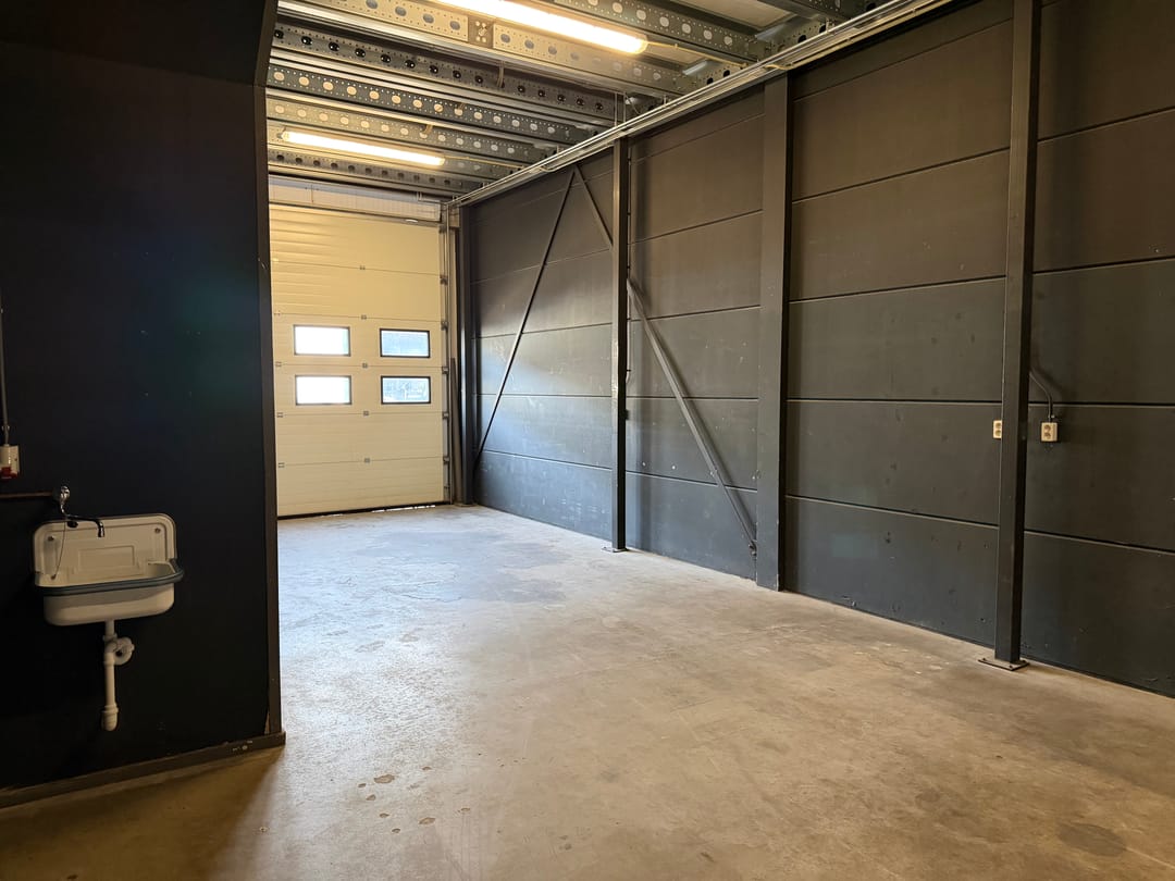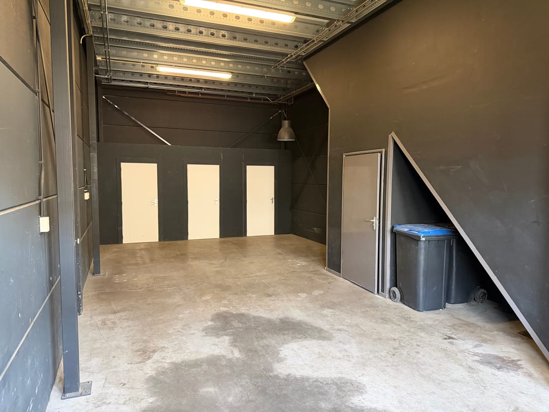 De aangeboden bedrijfsruimte is opgetrokken in staalconstructie en voorzien van een betonvloer op de begane grond en van een verdiepingsvloer op staal, toegankelijk middels een stalen trap. Onder de trap is een toilet ingericht, verder bestaat de begane grond uit een open vloer/werkruimte met drie bergkasten.
