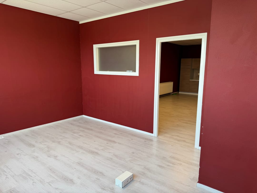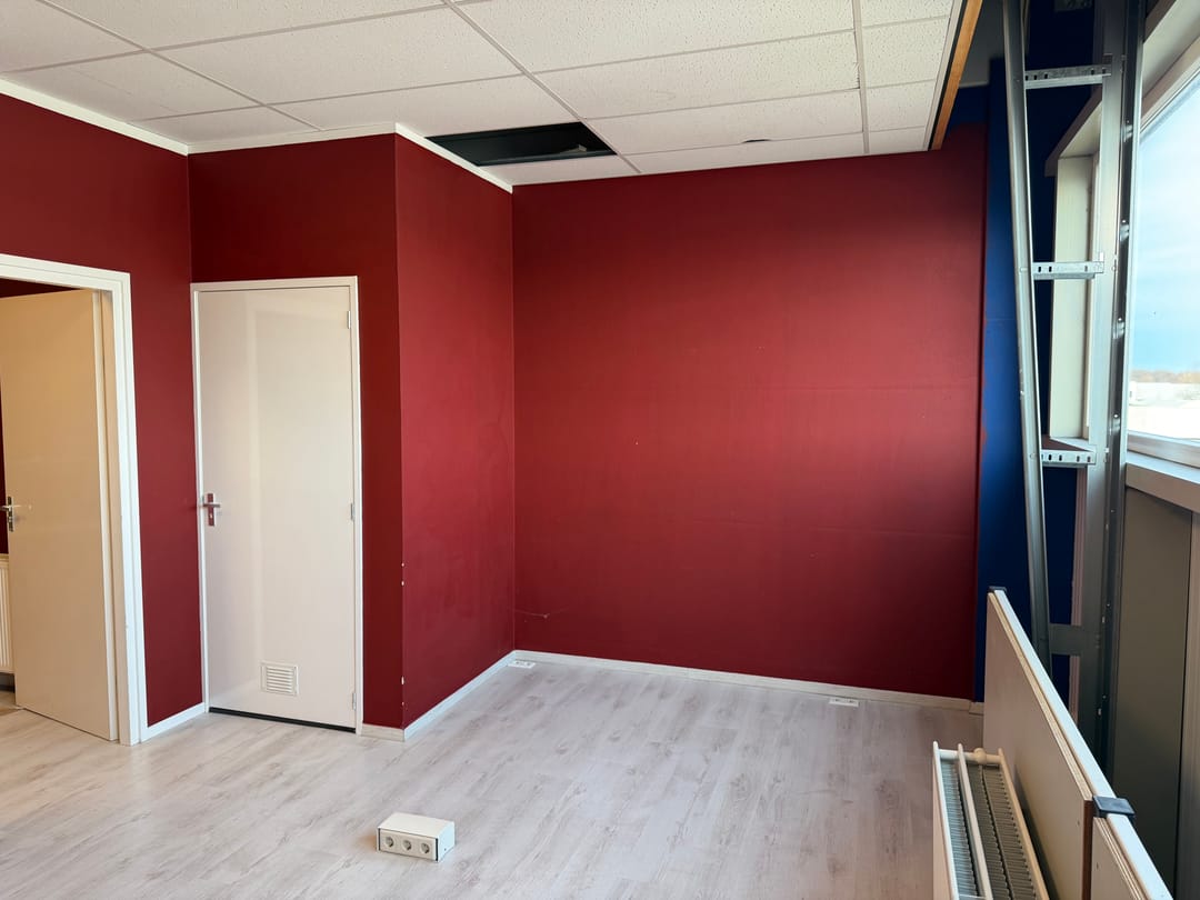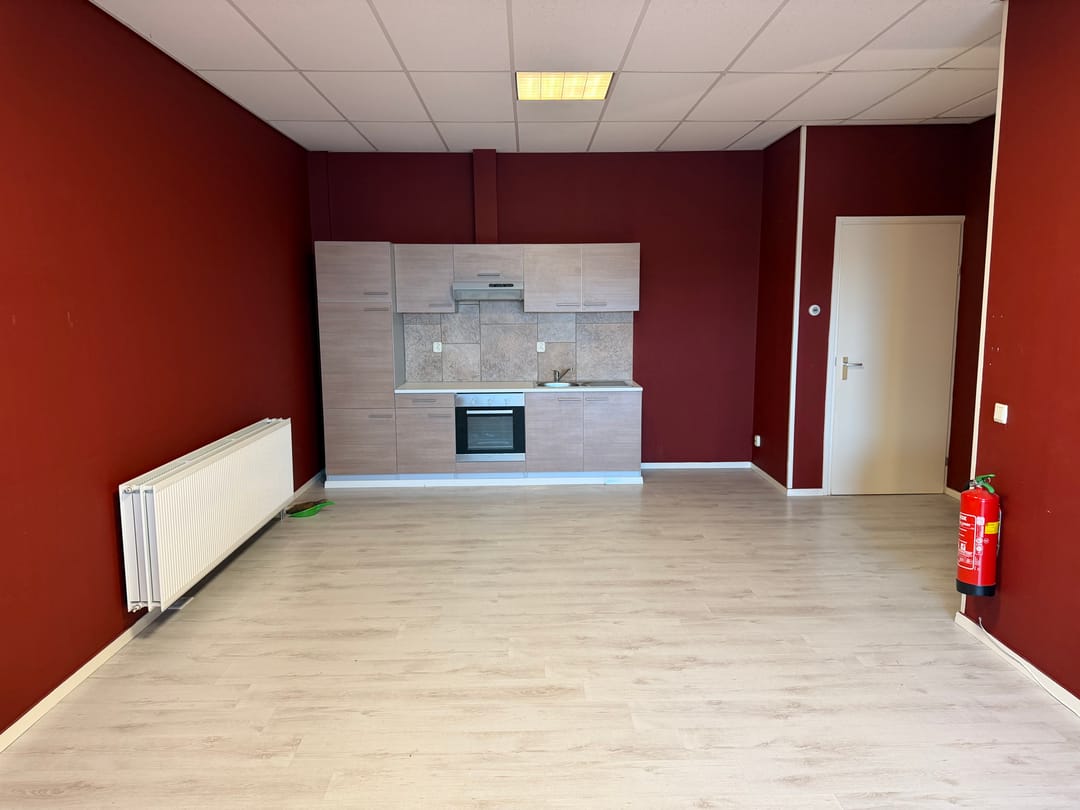 De eerste verdieping bestaat uit een open kantoorvloer met keukenopstelling, een cv-kast en een bergkast met doucheaansluiting.