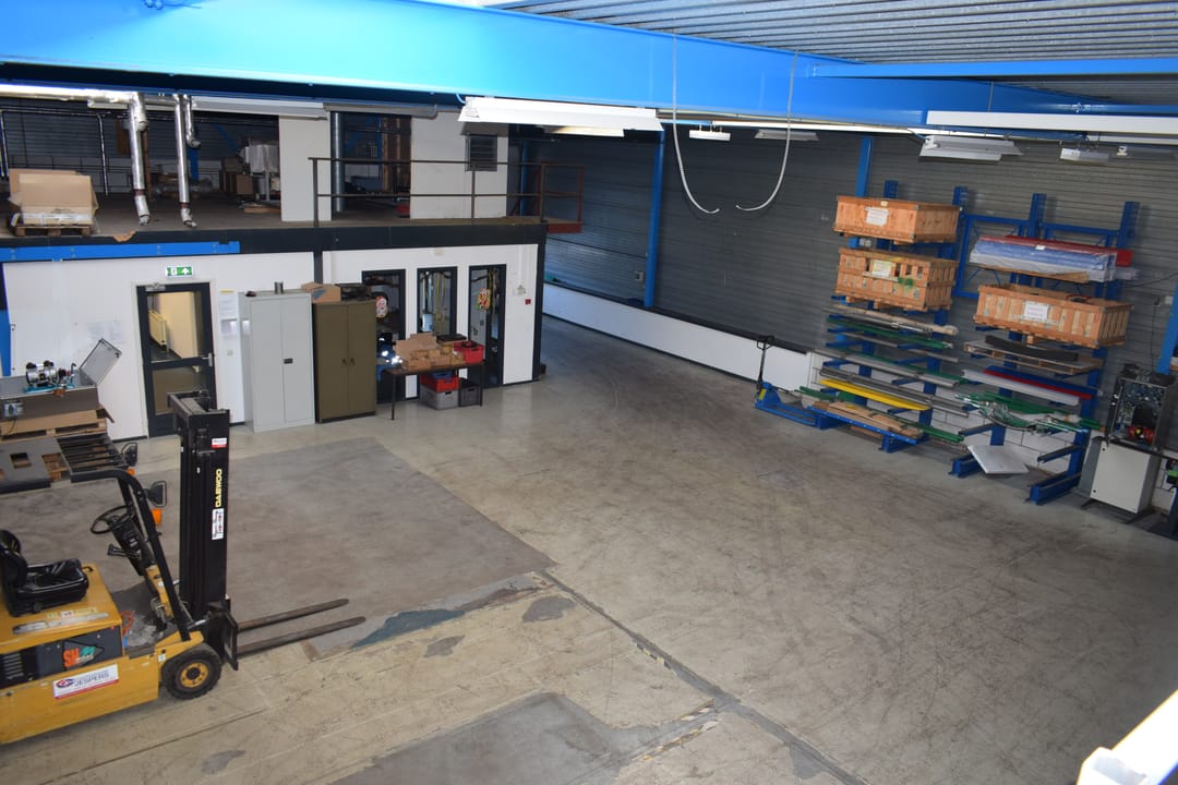 Bedrijfshal met overheaddeur met een vrije hoogte van circa 5 meter. Aan de achterzijde van de hal is een conferentie/presentatieruimte gerealiseerd. Middels een vast trap is de entresol te bereiken ten behoeve van opslag.