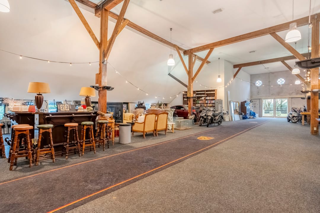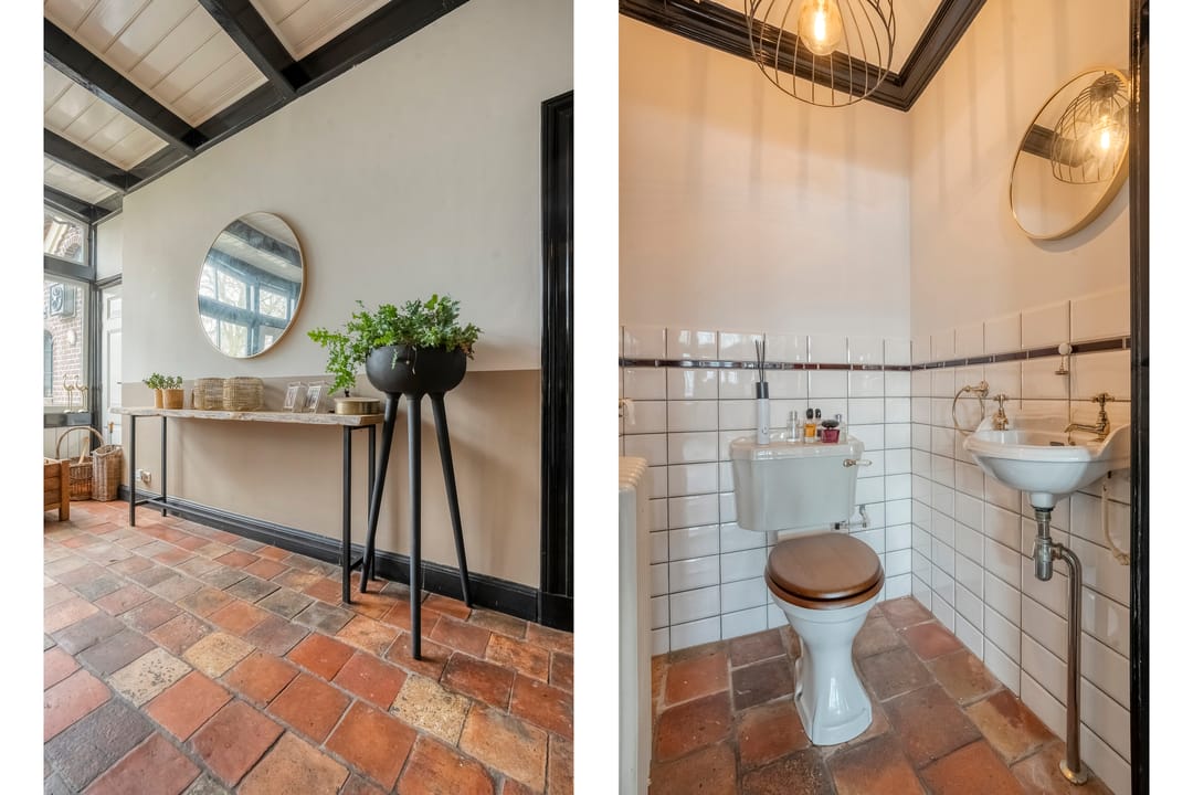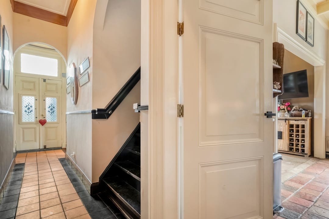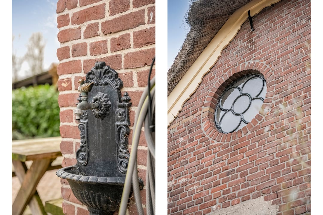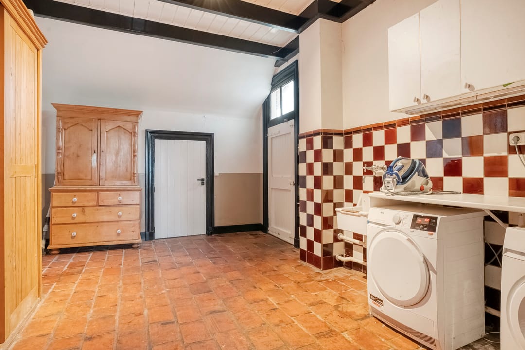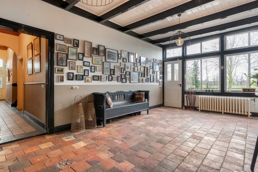 De boerderij ademt karakter dankzij prachtige originele details zoals glas-in-loodramen, paneeldeuren en massief houten vloerdelen. De imposante entree vormt het hart van de woning en geeft toegang tot zowel het voorhuis als de riante deelruimte.