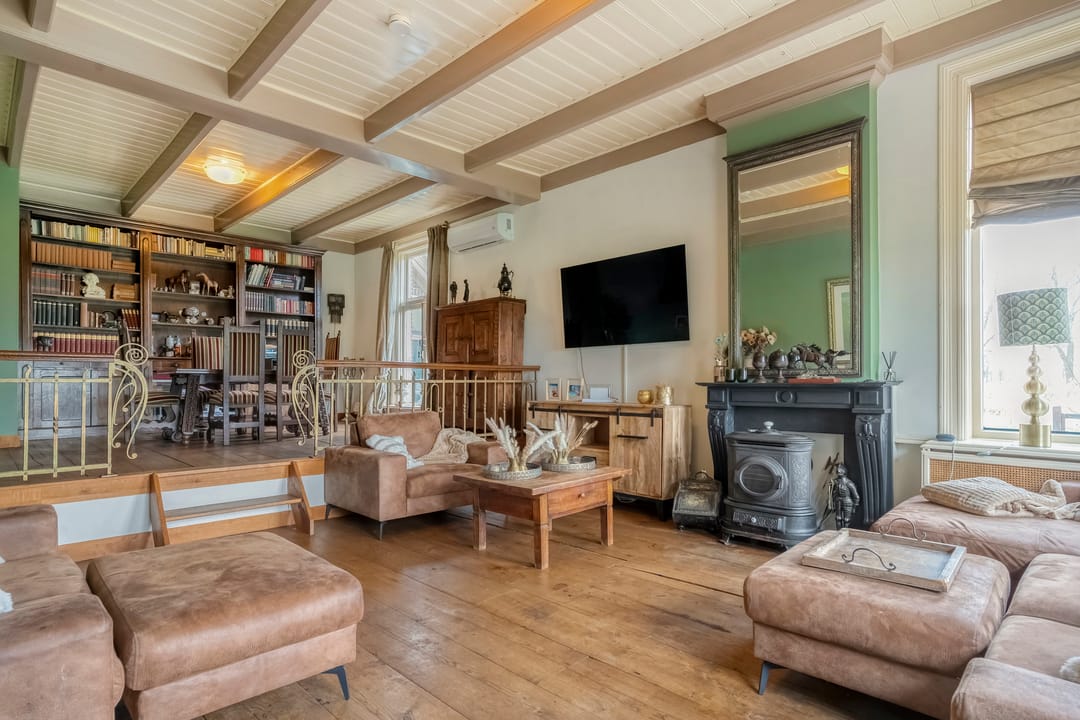Via de riante entree met toiletruimte (toilet en fontein) bereikt u het voorhuis, dat door de hal in tweeën is verdeeld: De woonkamer met verhoogd eetgedeelte/bibliotheek en massief houten vloerdelen – een sfeervolle ruimte met volop licht en vrij uitzicht.