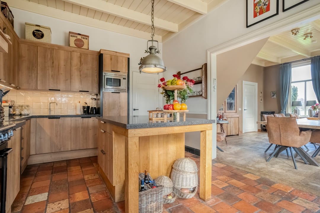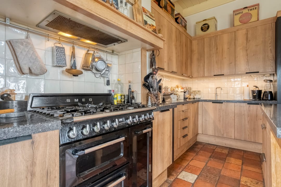 Gezellige woonkeuken met openslaande deuren naar buiten, werkeiland, granieten werkbladen en uitgebreide inbouwapparatuur, waaronder een Smeg-fornuis met maar liefst drie ovens en een afzuigschouw. Hier vindt u deels massief houten vloerdelen en deels een karakteristieke estriken vloer.