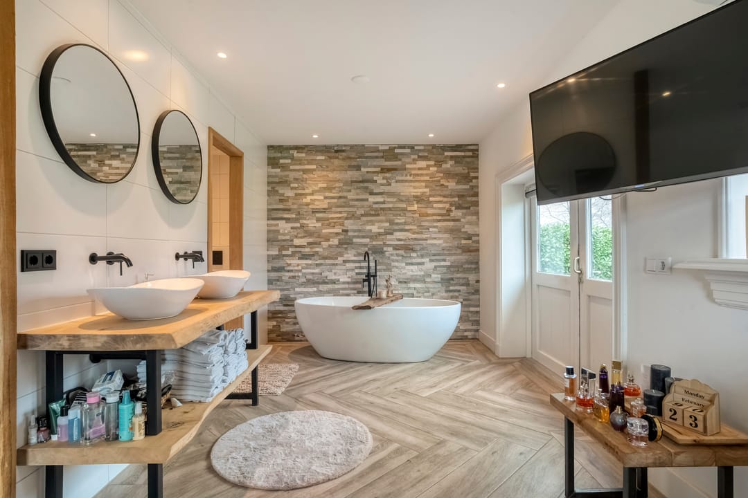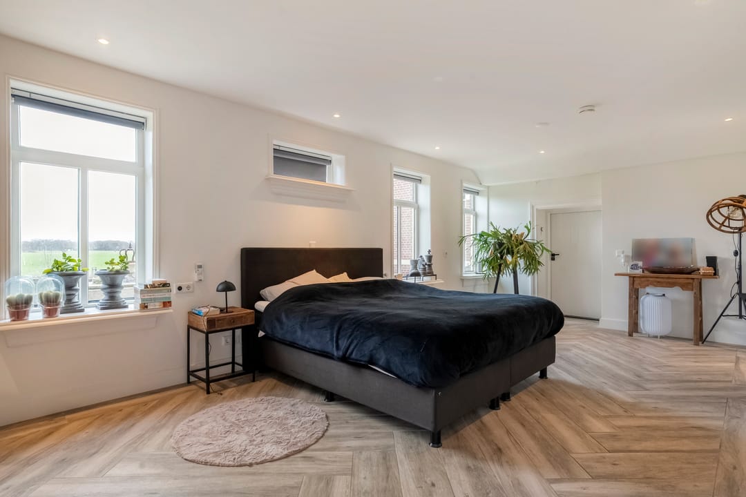 Via een vaste trap in het voorhuis komt u op de overloop met karakteristieke dakkapellen en prachtig uitzicht over de omliggende landerijen. Hier bevinden zich 2 slaapkamers (meer kamers mogelijk) en een badkamer met vrijstaand ligbad, douchehoek, dubbel wastafelmeubel en toilet.