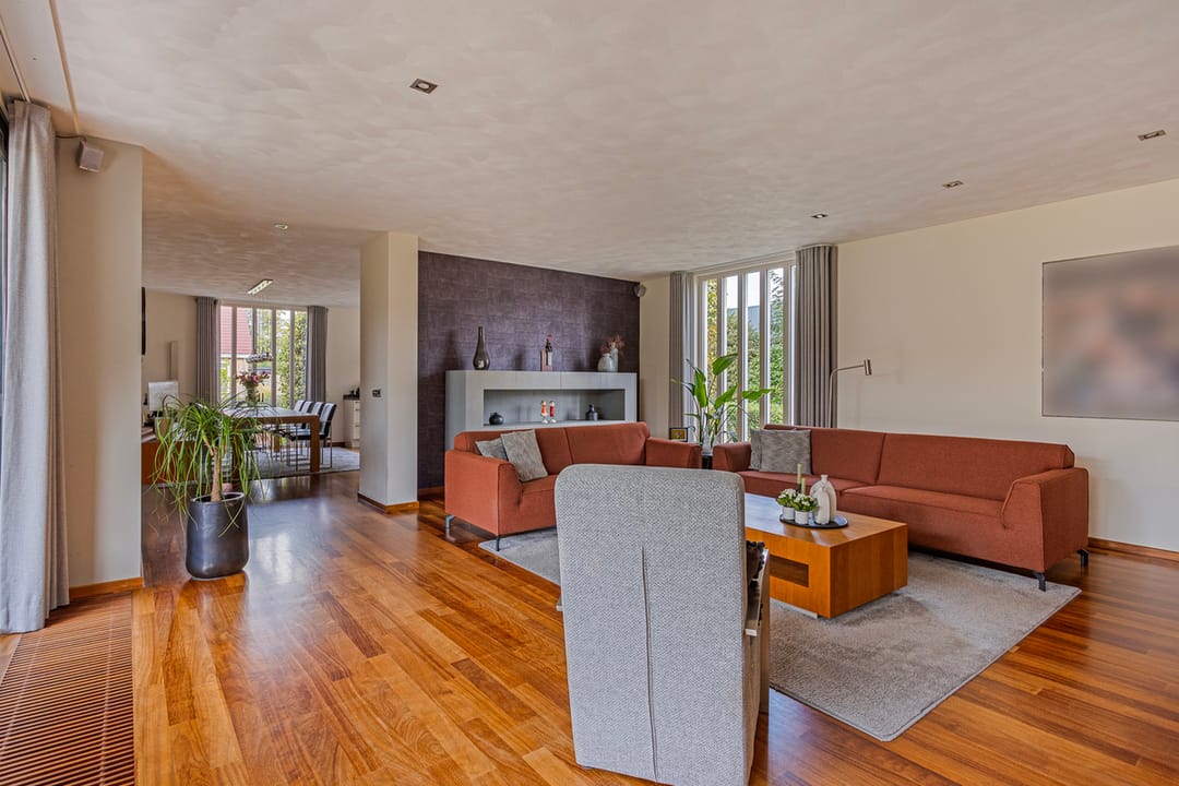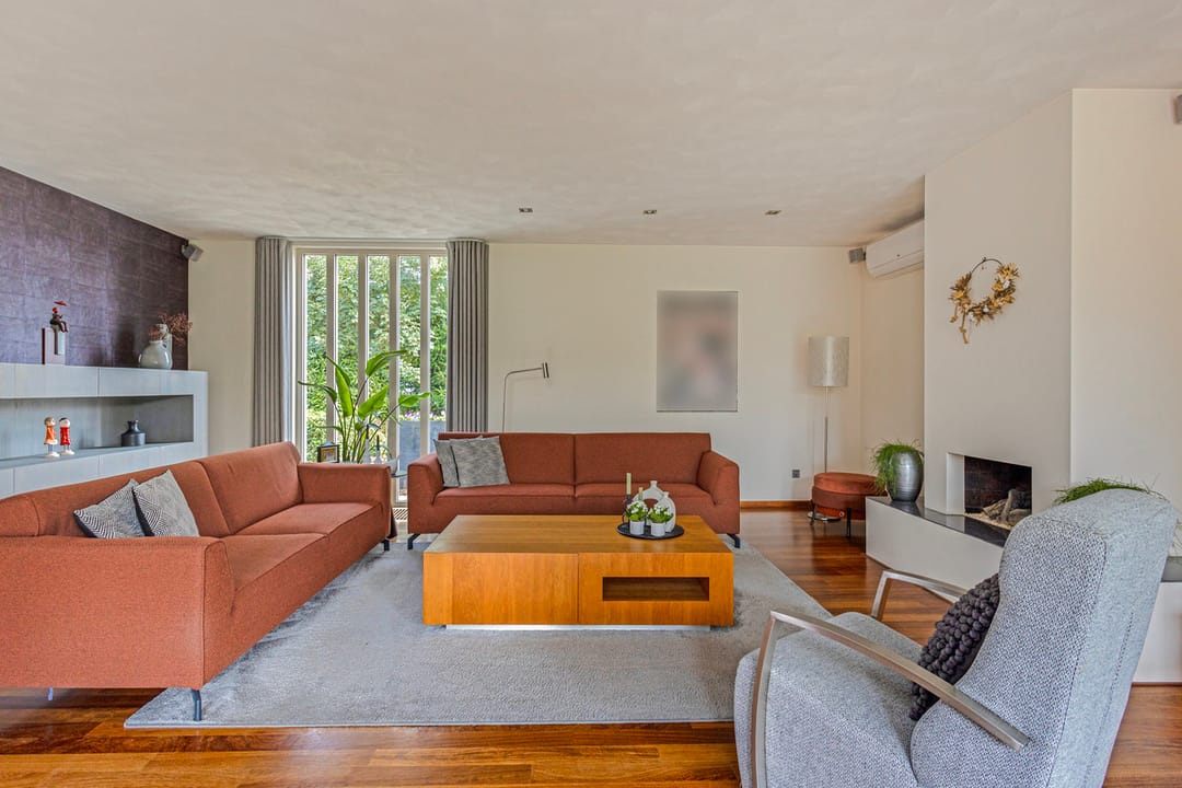 Ruime woonkamer met parketvloer, stucwerkwanden, stucwerkplafond met op diverse plaatsen inbouwspots, grote schuifpui naar achtertuin/terras, schouw met gashaard en een airco ten behoeve van verwarmen en koelen.