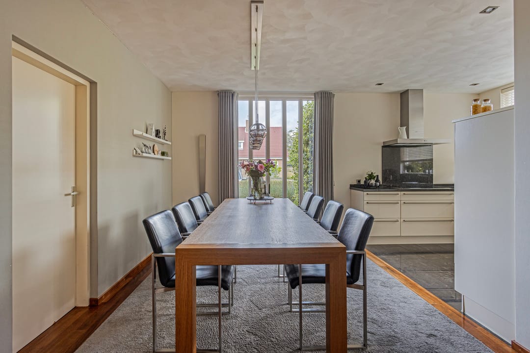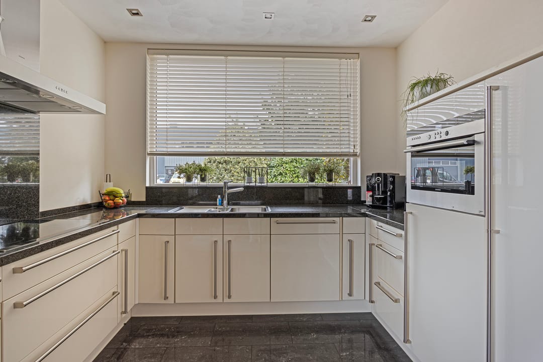 Ruime eetkeuken met deels parketvloer, deels tegelvloer, stucwerkwanden, stucwerkplafond met op diverse plaatsen inbouwspots en een U opgestelde keukeninrichting onder andere voorzien van 5 pits inductiekookplaat, design afzuigkap, vaatwasser met topbediening, koelkast, vrieskast, combi oven/magnetron, granieten werkblad met RVS spoelbak en 360 graden draaicarrousel.