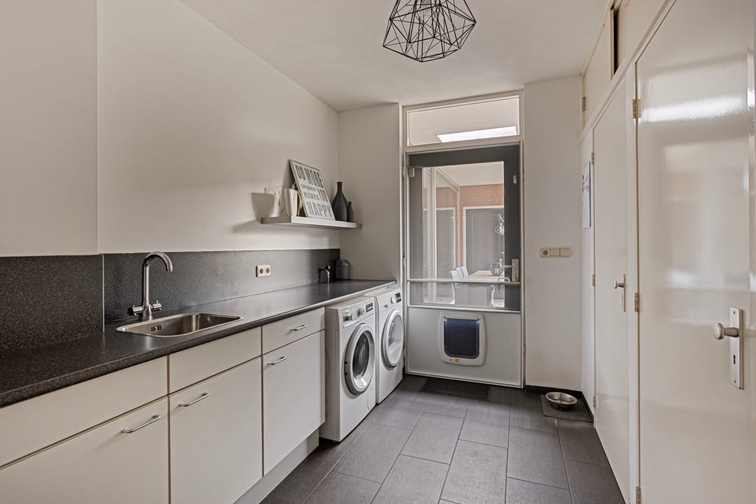 Gang met tegelvloer, volledig betegelde toiletruimte met vrijhangend toilet en fonteintje. Achterportaal / bijkeuken met tegelvloer, aansluiting wasapparatuur, werkblad met spoelbak en 3 inbouwkasten.