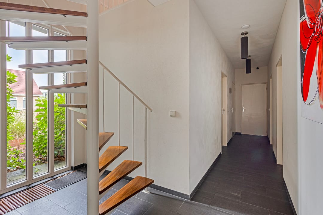 Een tussenhal met spiltrap naar de eerste verdieping.
