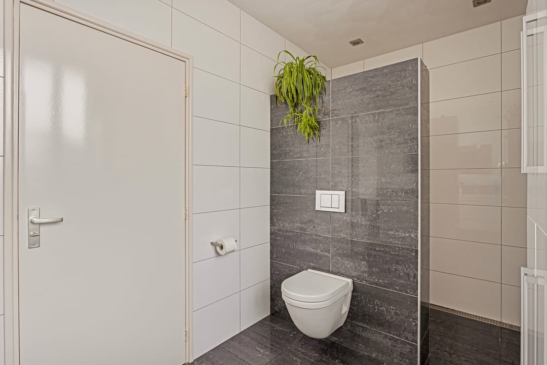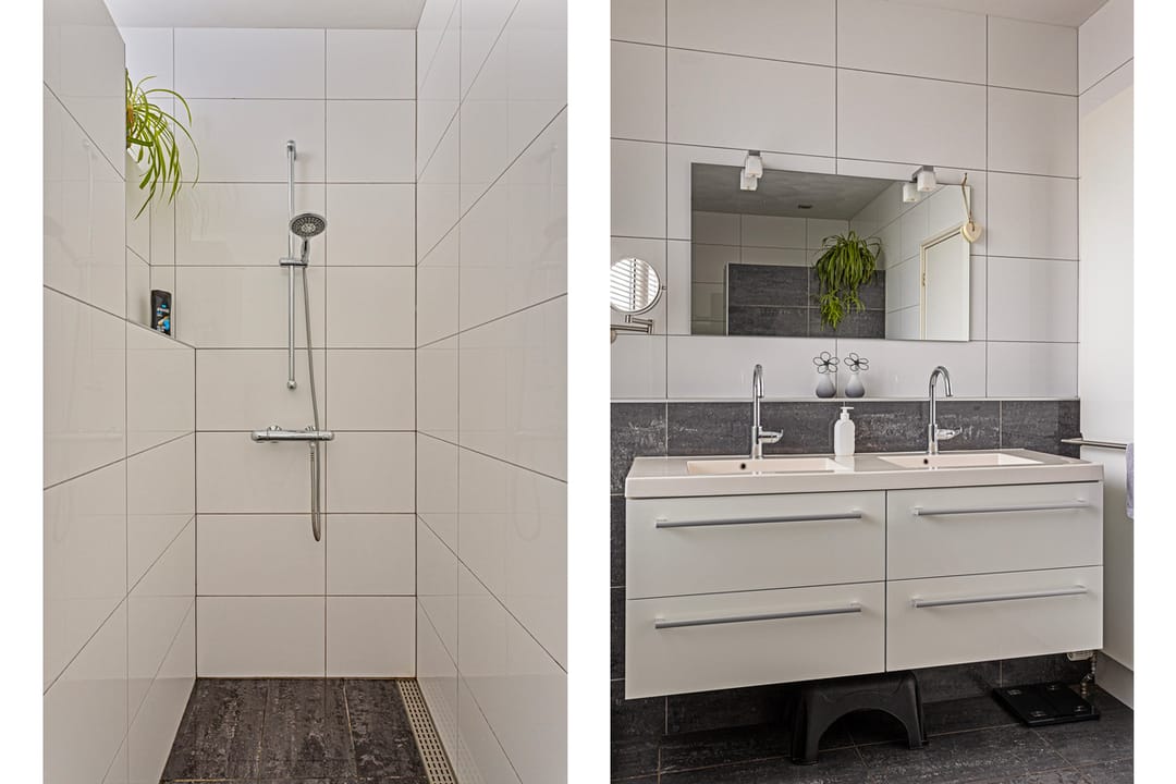 Volledig betegelde badkamer onder andere voorzien van ruime inloopdouche met thermostaatkraan, vrijhangend toilet, dubbele vaste wastafel in badmeubel en stucwerkplafond met inbouwspots. Vanuit de gang door middel van vaste trap toegang tot verdieping.
