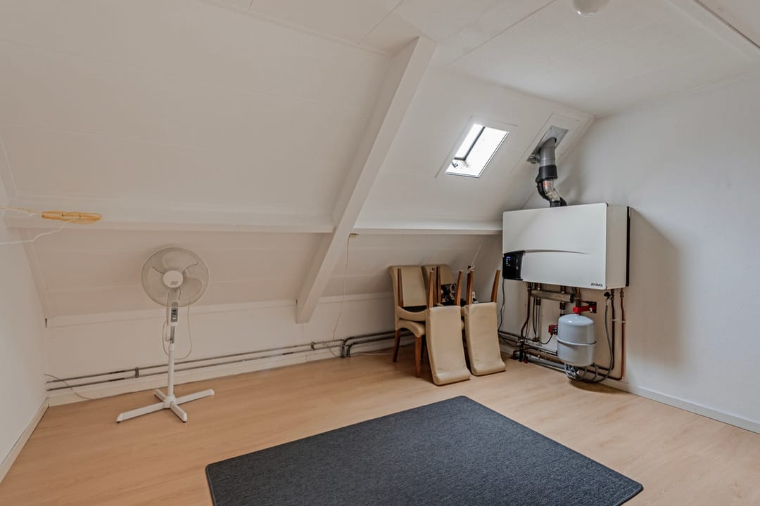 CV / bergruimte met laminaatvloer, opstelling CV ketel (Atag - 2007) en uitzetraam. Vanuit deze ruimte luik met vlizotrap naar bergzolder.