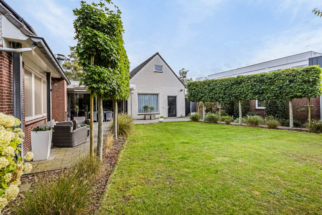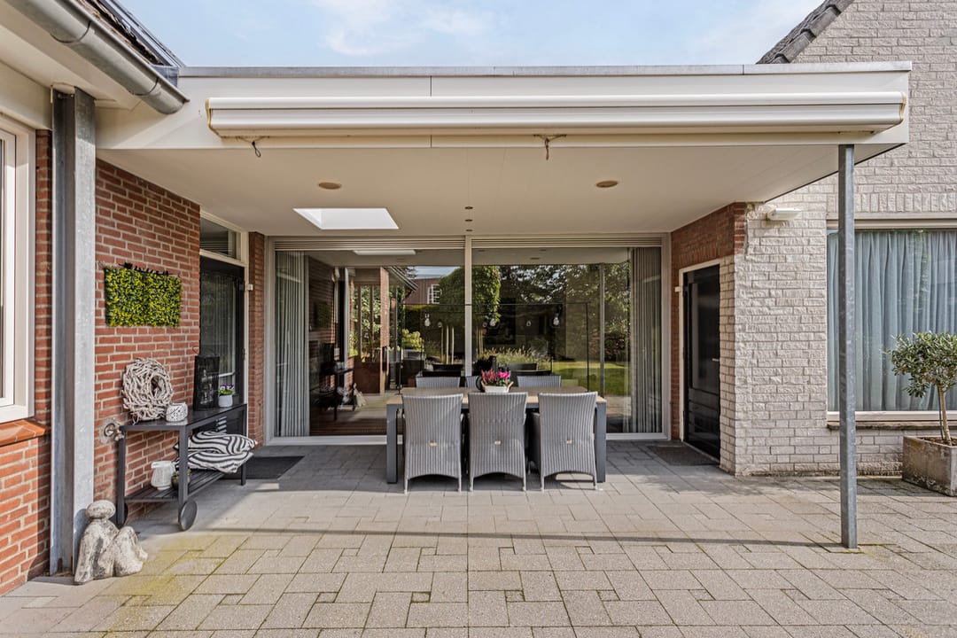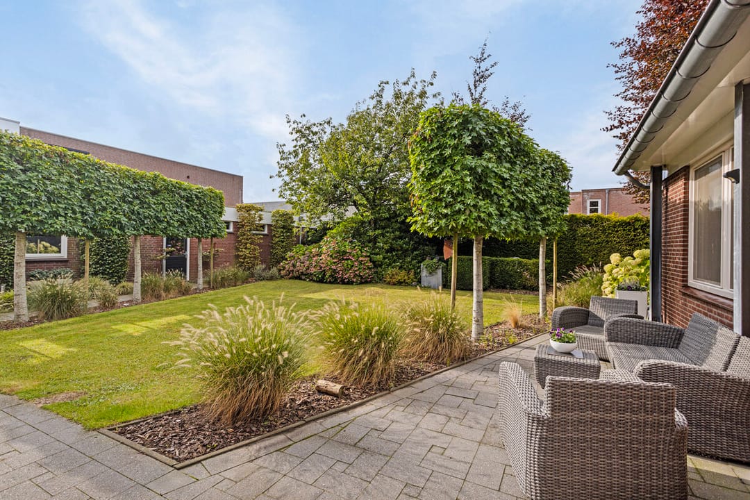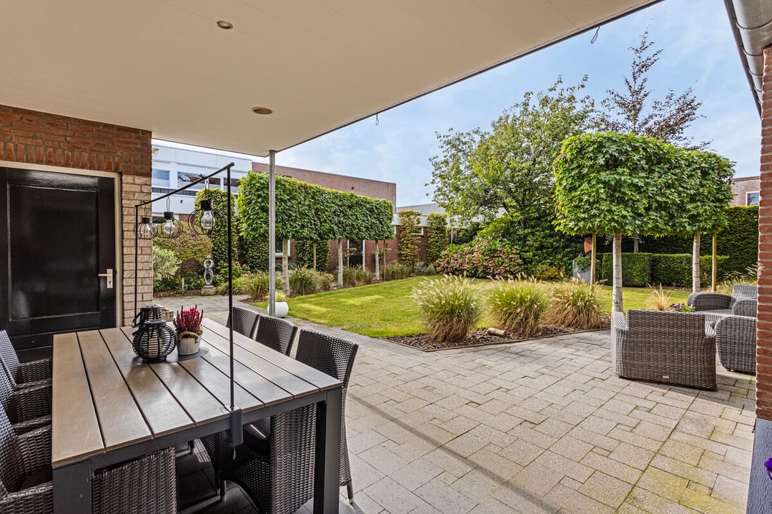 Aangelegde achtertuin met overdekt sierstraatwerk terras met inbouwspots, lichtkoepel en ingebouwde speakers. Buiten open haard en een knikarm zonwering, elektrisch te bedienen. Gazon, diverse borders. Tuin is omheind met een haag.