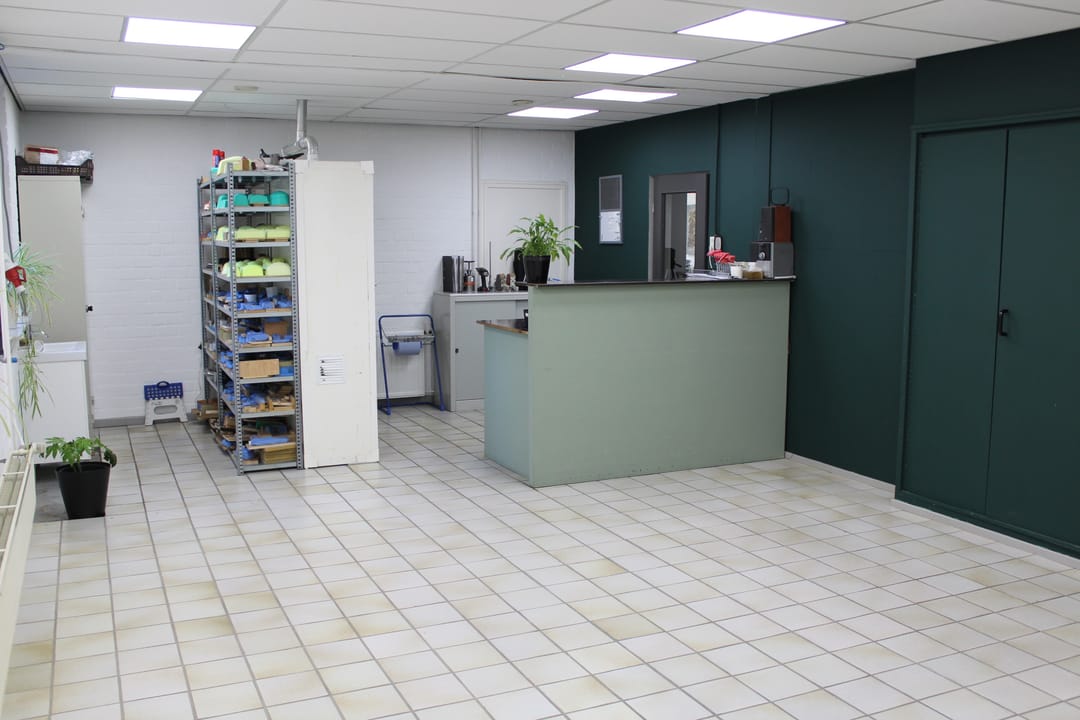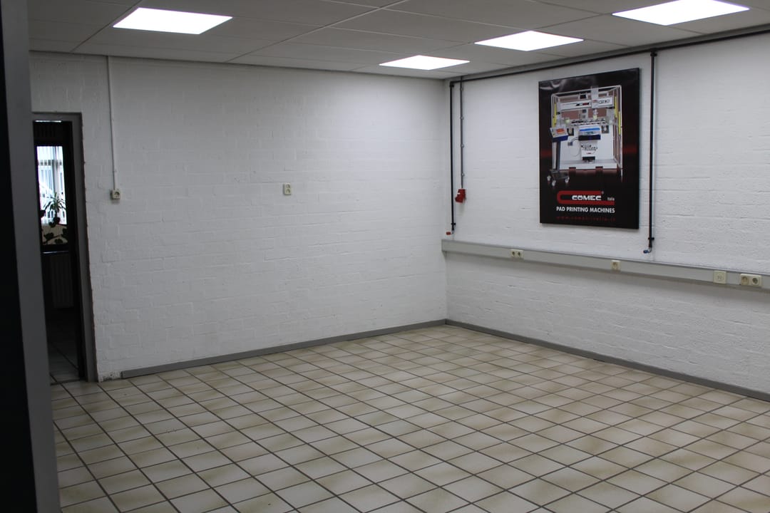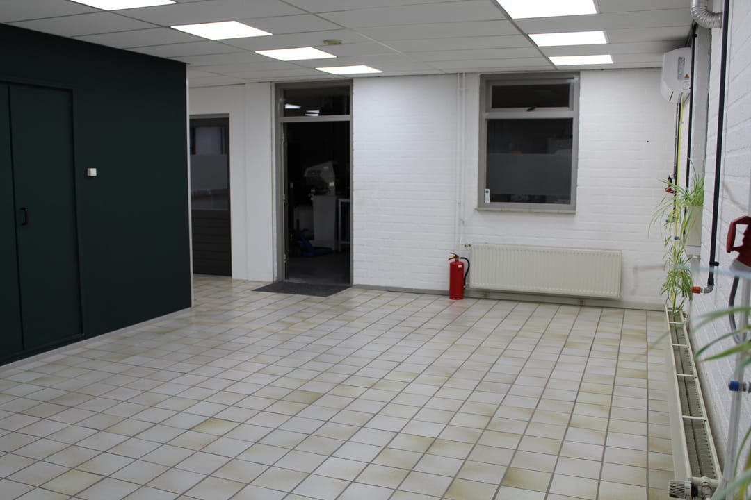 Bedrijfsruimte met tegelvloer, systeemplafond met inbouwverlichting en elektra met krachtstroom.