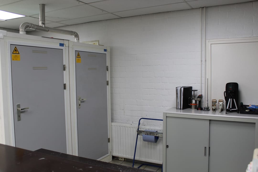Vanuit de kantine toegang tot een archiefruimte met opstelling CV ketel (Nefit turbo HR) ten behoeve van verwarming van de bedrijfsruimte.