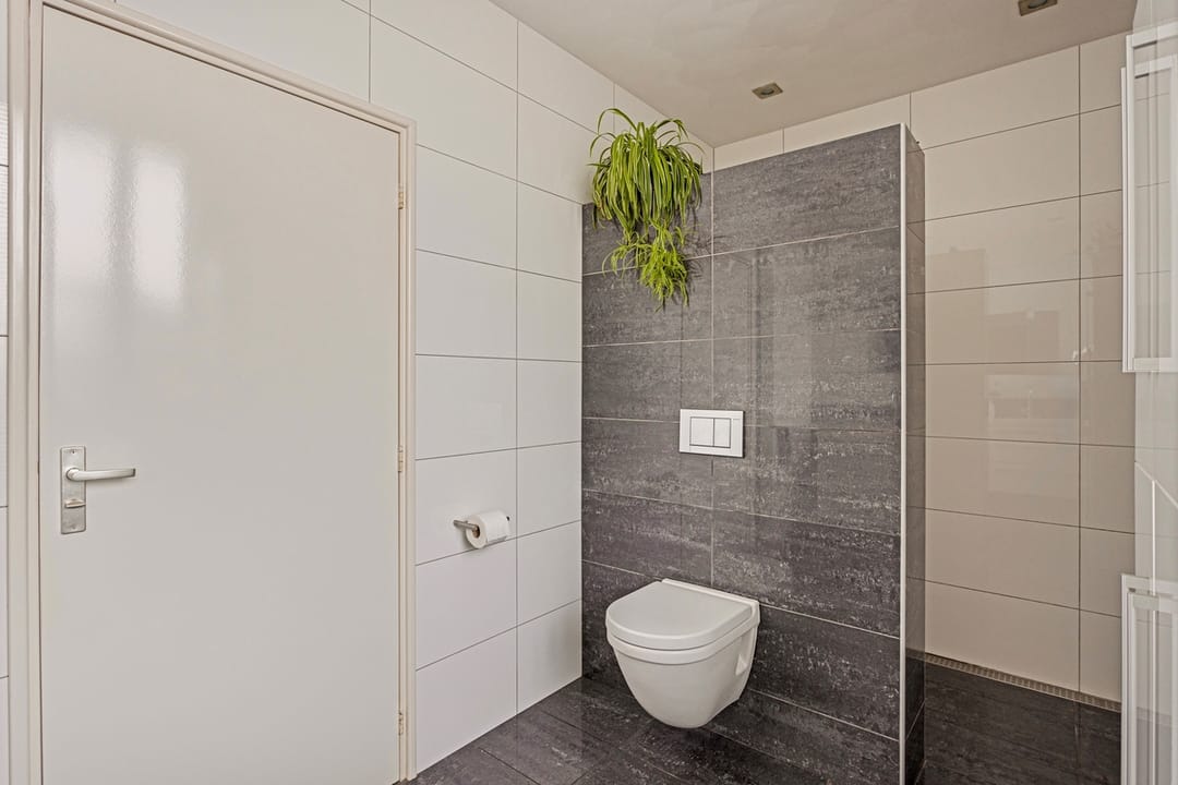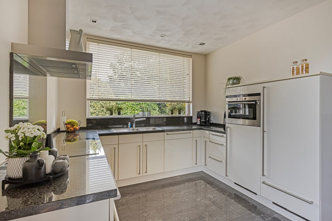 Entree / portaal met toegang tot de eetkeuken, met een tegelvloer en een luxe keukeninrichting in carré-opstelling voorzien van een granieten aanrechtblad met RVS spoelbak, een brede inductiekookplaat, een combimagnetron, een koelkast, een vriezer (4-laden) en een vaatwasser. Gezellige woonkamer met een parketvloer en een strakke schouw met een sfeervolle gashaard en een wandairco. Via een schuifpui toegang tot een overdekt terras. Vanuit de keuken naar een gang met toegang tot het toilet, badkamer, bijkeuken en twee slaapkamers en werkkamer. Volledig betegelde badkamer met een dubbele wastafel met spiegel, een wandcloset, een inloopdouche met thermostaatkraan en mechanische ventilatie. Praktische bijkeuken met o.a. een keukenmeubel, een vaste kastenwand en de aansluiting voor de wasapparatuur. Drie slaapkamers, waarvan twee slaapkamers met een laminaatvloer en één slaap-/werkkamer met een tegelvloer. Alle