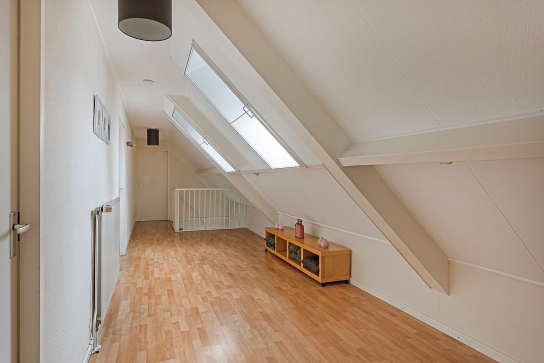 Vanuit de entree met een spiltrap naar de overloop, met een laminaatvloer. Drie slaapkamers met een laminaatvloer, waarvan twee slaapkamers met kunststof raamkozijnen (draai-/kiep) met HR++ beglazing en één slaapkamer met twee Velux dakramen. Aparte berg-/CV-ruimte met de Atag HR combiketel (2007). Vanuit deze ruimte is een volledig begaanbare zolderberging te bereiken middels een vlizotrap.