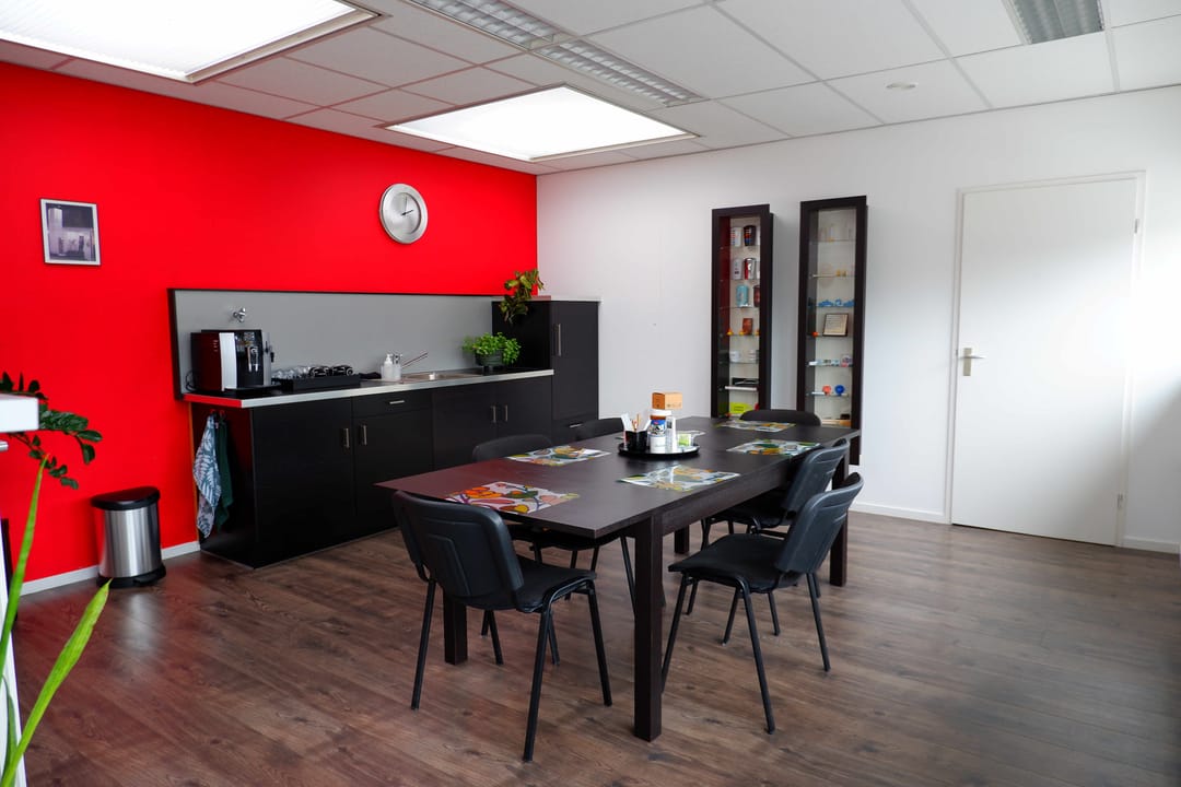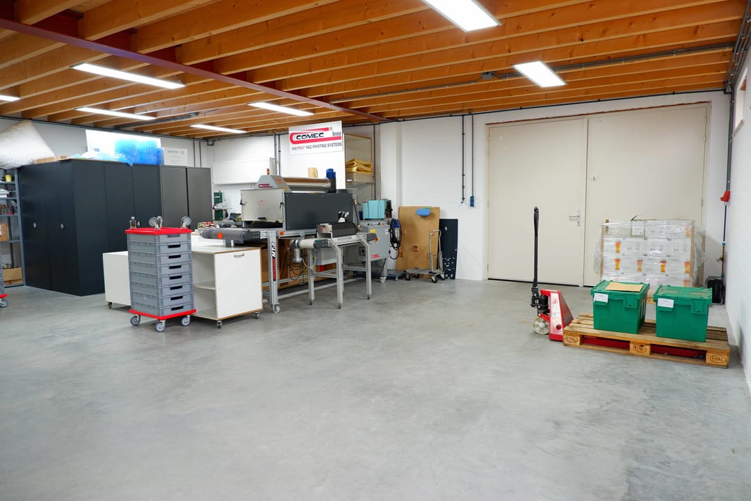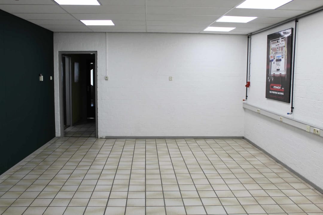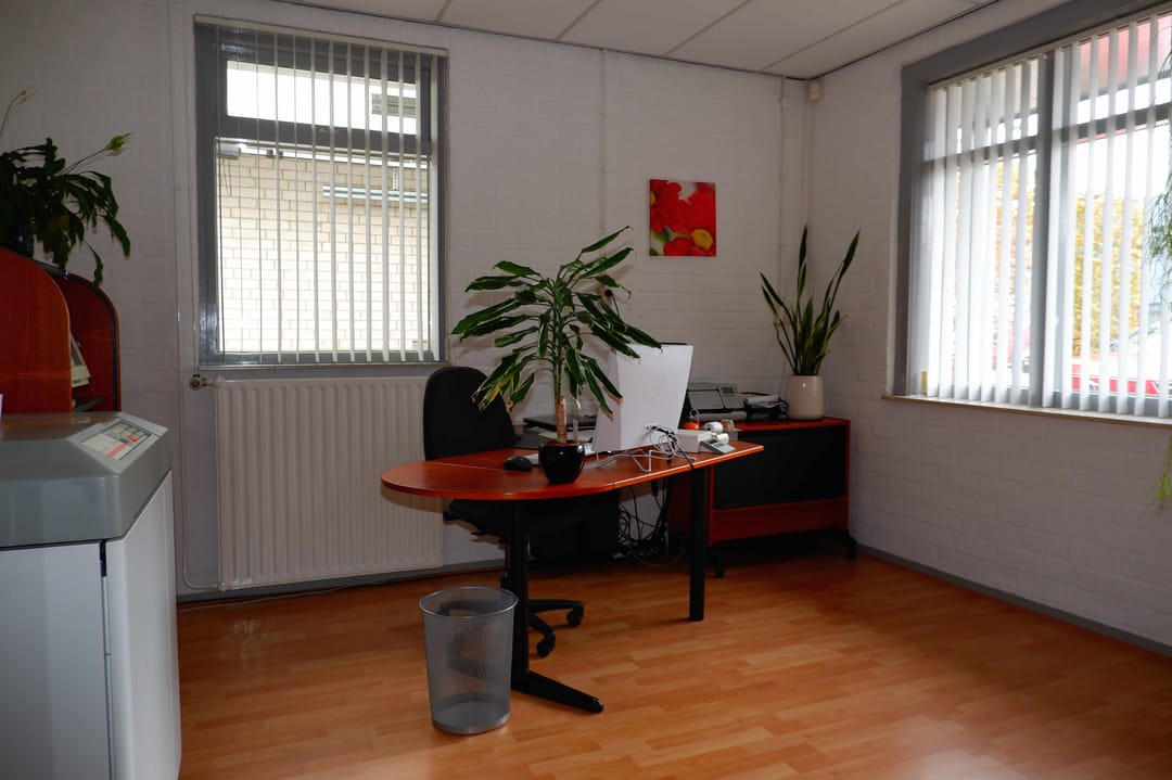Via een afsluitbaar tochtportaal naar de ontvangstruimte met toegang tot de receptie en een kantoorruimte. Afgewerkt met een laminaatvloer en MBI wanden. De kantoorruimte is voorzien van een wandairco. Een volledig betegelde toiletgroep (heren/dames). Via een portaal toegang tot de werkruimten, met een tegelvloer, wandairco en moderne groepenkast. Vanuit deze ruimte naar de aangebouwde werkruimte, met een gevlinderde betonvloer. Via een dubbele deur naar een dichte carport. Tussen de dubbele garage en het bedrijf bevindt zich een overdekte stalling met een lichtstraat.