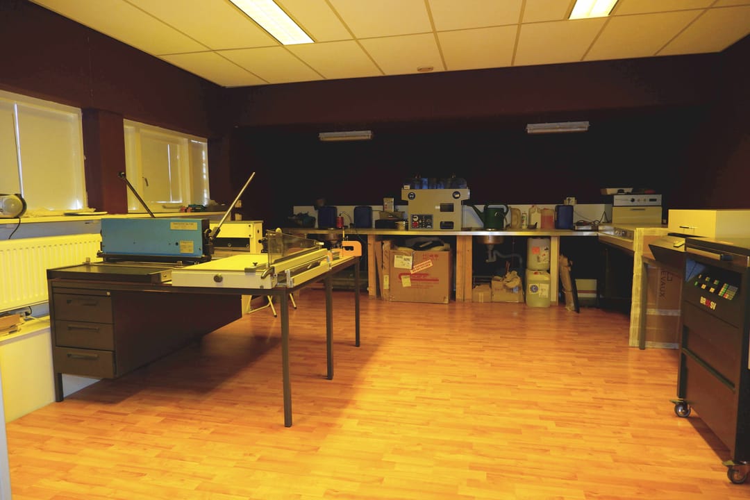 Bereikbaar via een spiltrap in het portaal. Overloop met laminaatvloer en een lichtkoepel. Grote ruimte met een laminaatvloer en een wandairco. Kantine met laminaatvloer, lichtkoepels en een wandairco. Met een keukenblok met koelkast. Via een deur in de kantine naar de archief-/cv-ruimte met de Nefit Ecomline HR combiketel (2000).