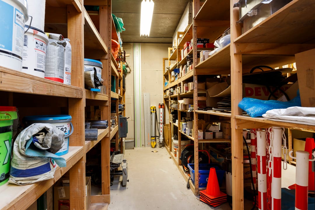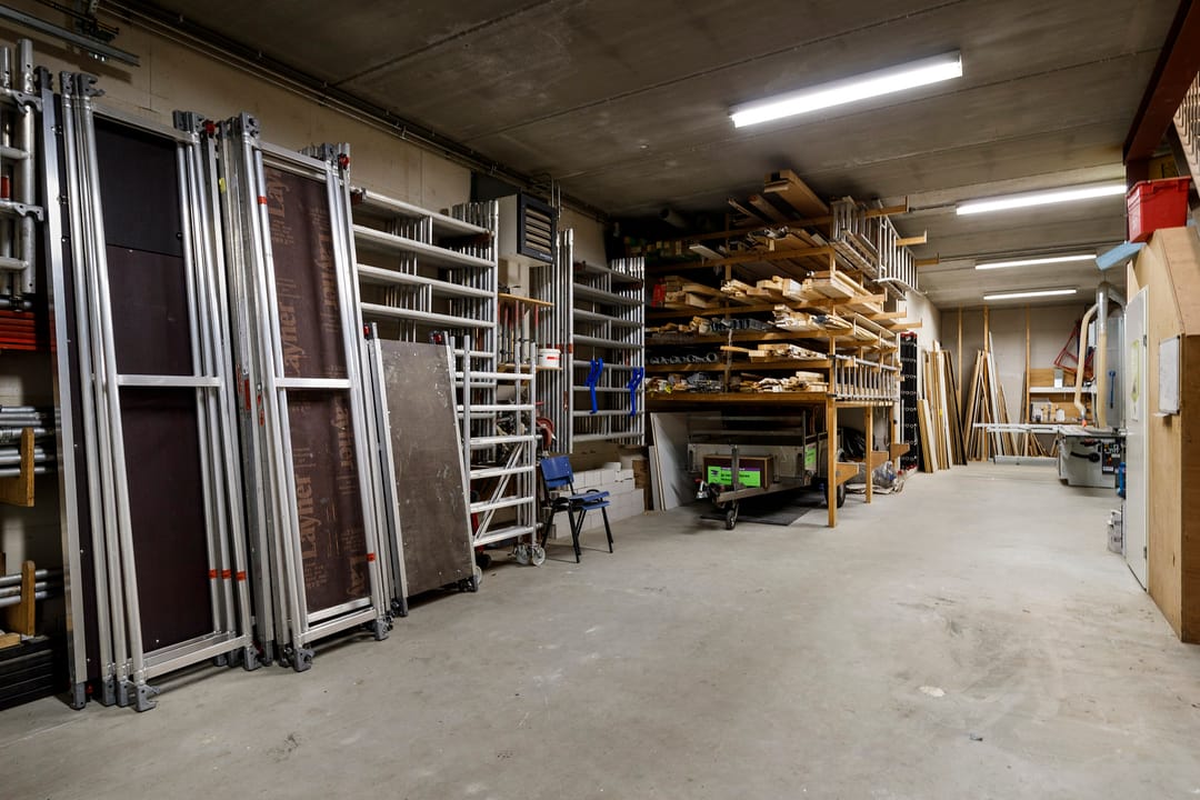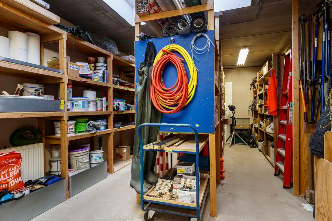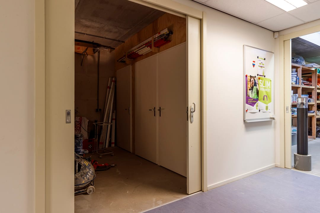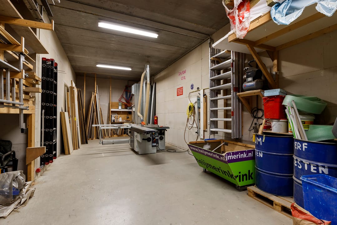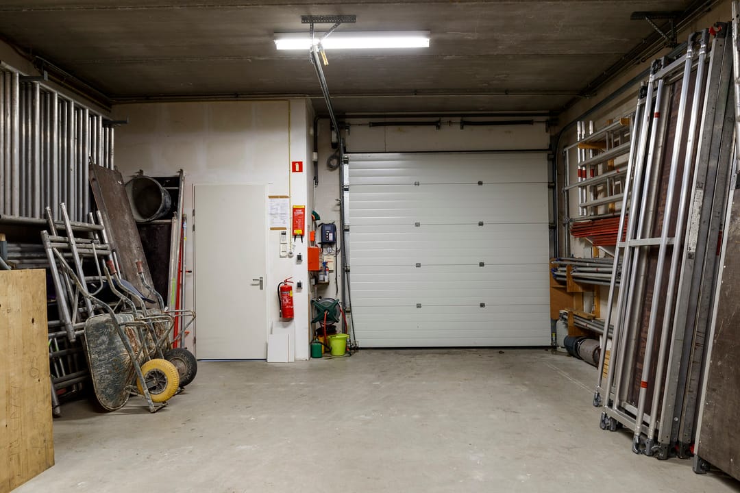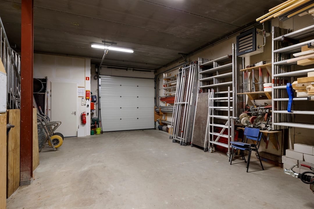 - Overheaddeuren, betonvloer, heater, toilet, pantry en te openen ramen