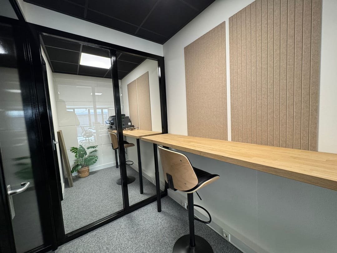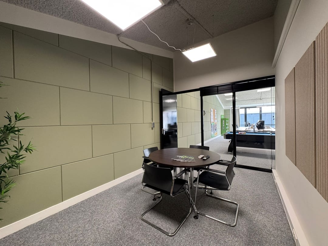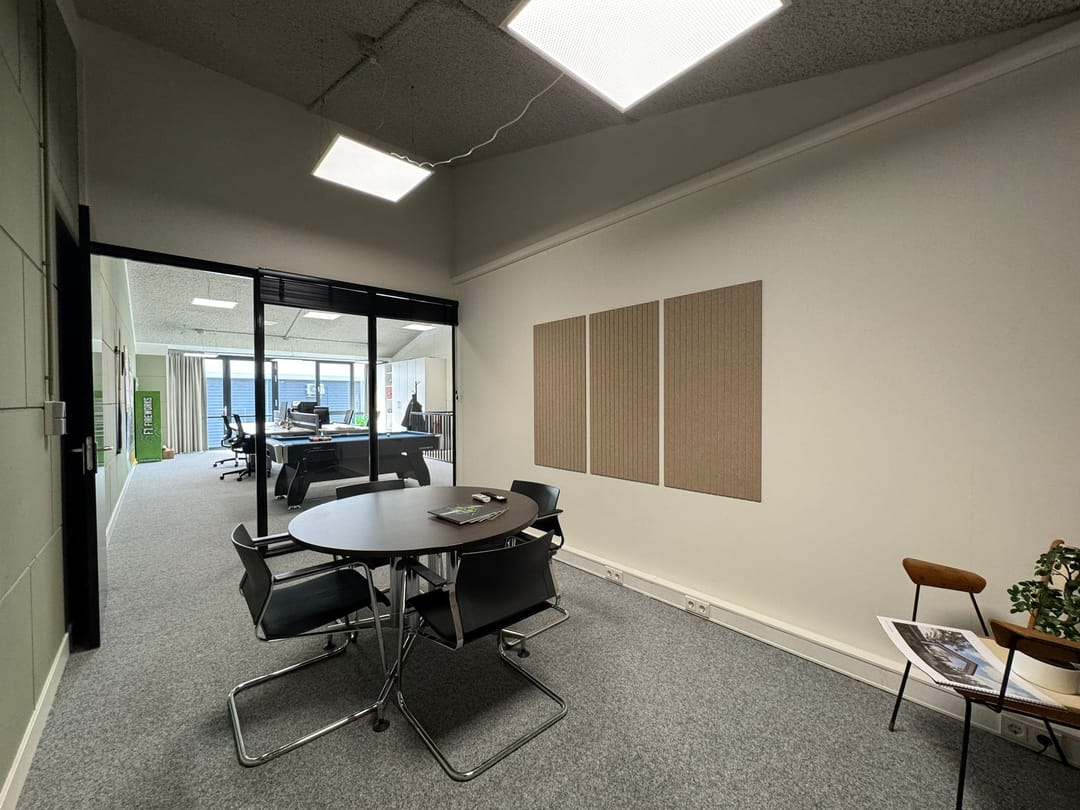 - Akoestisch gespoten plafond in kantoor en spreekruimte
