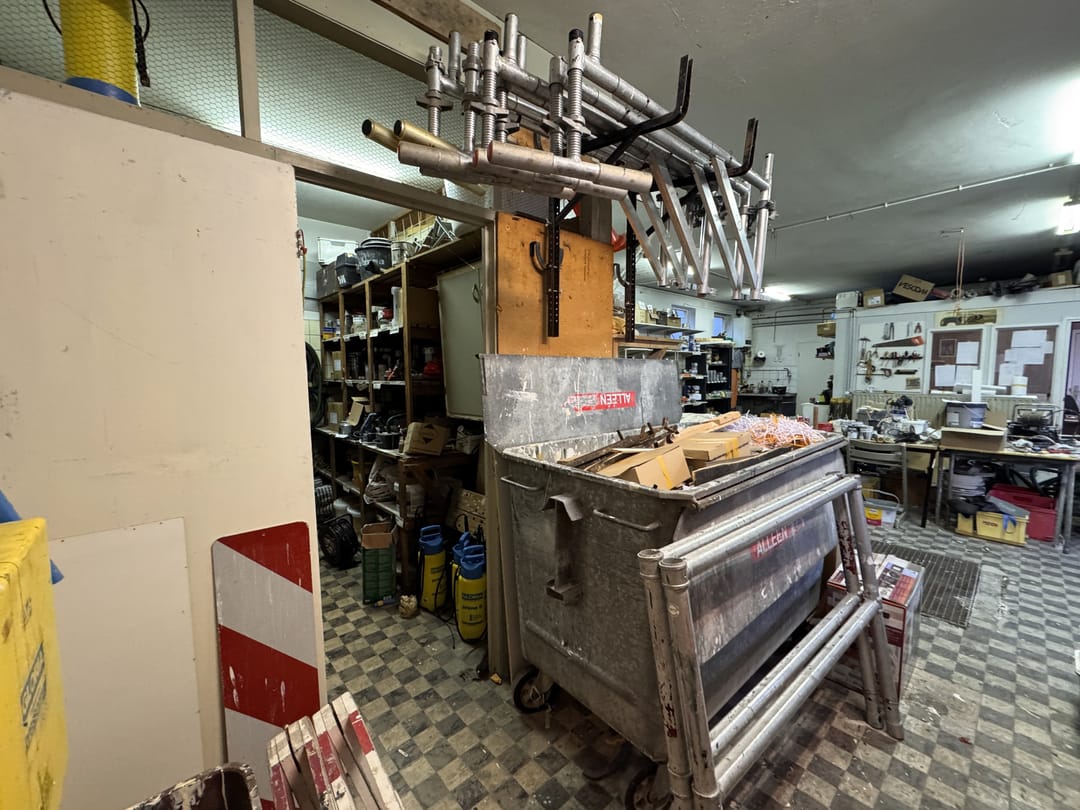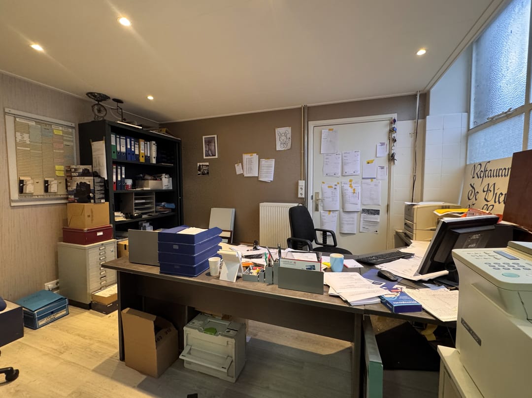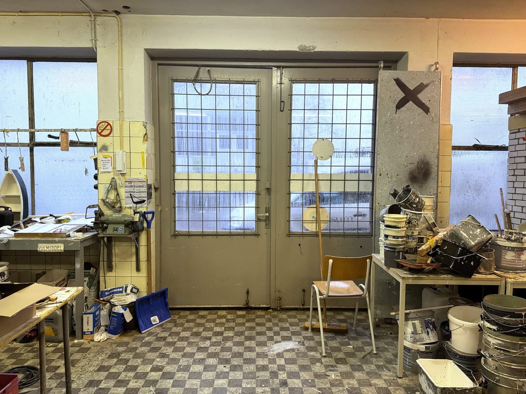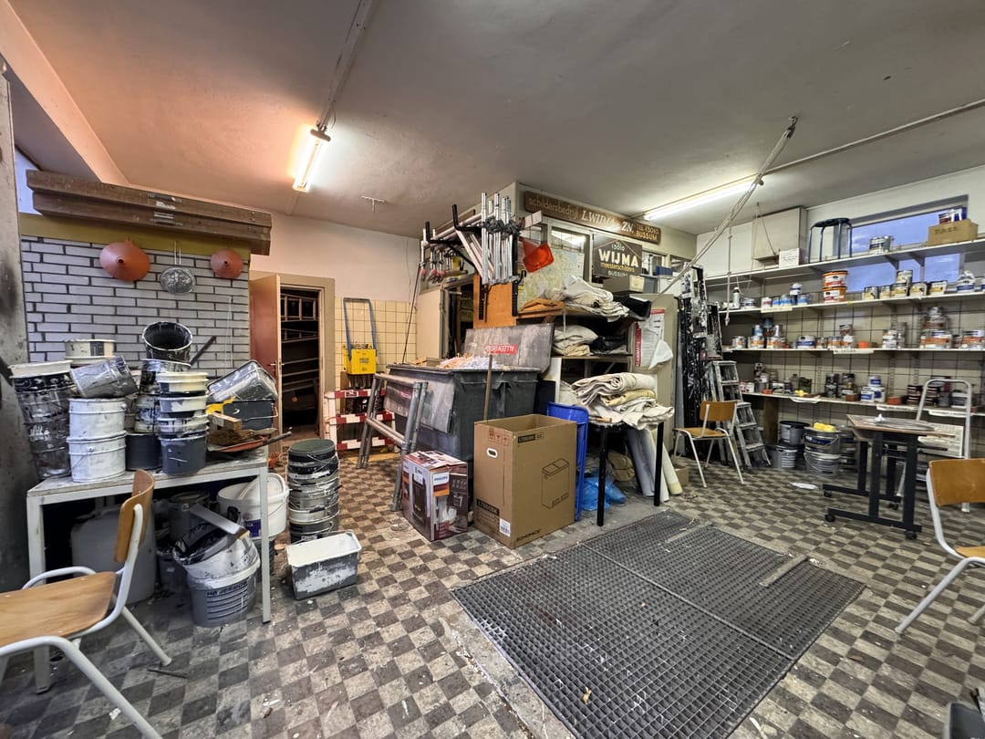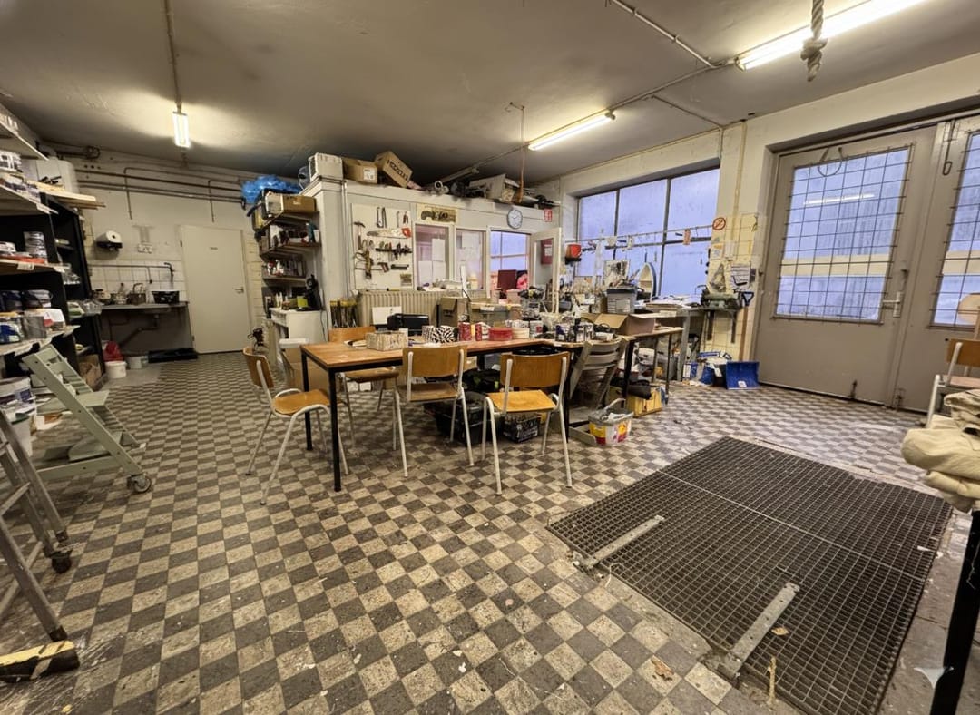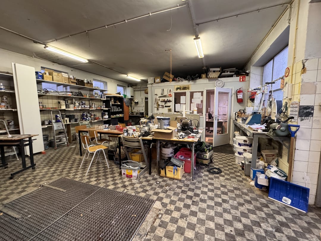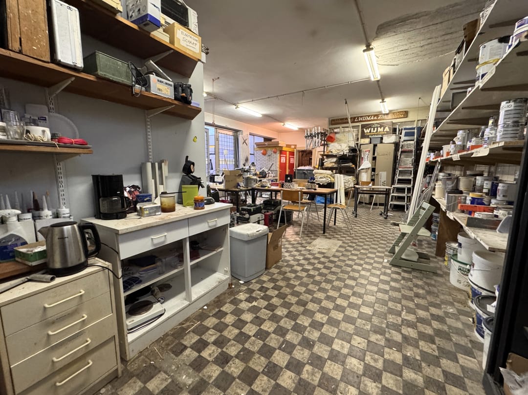 De ruimte kom je binnen vide de voordeur of via de twee grote openslaande deuren. De ruimte binnen is in totaal ca. 100 m² en bestaat vooral uit een werkplaats/atelierruimte/opslagruimte met een klein kantoor (welke verwijderd kan worden) en een extra opslagruimte links van het pand. Verder is er een toilet en stromend water. Tevens is er een kelder, te bereiken via een metalen rooster, voor extra opslagruimte.