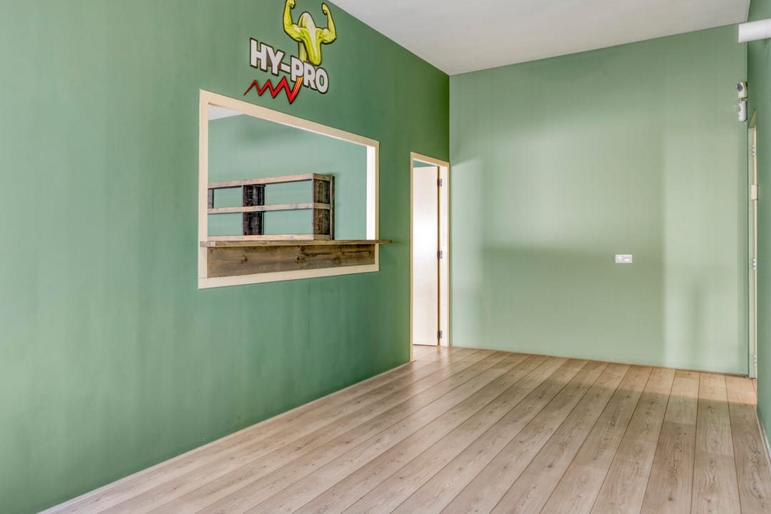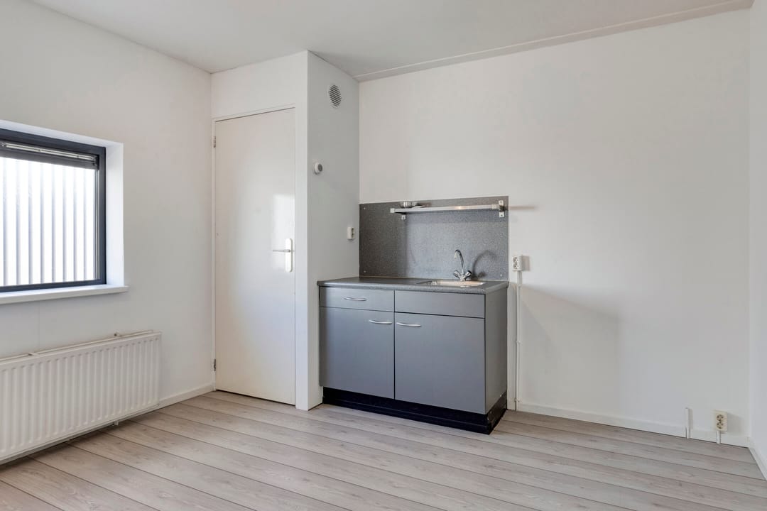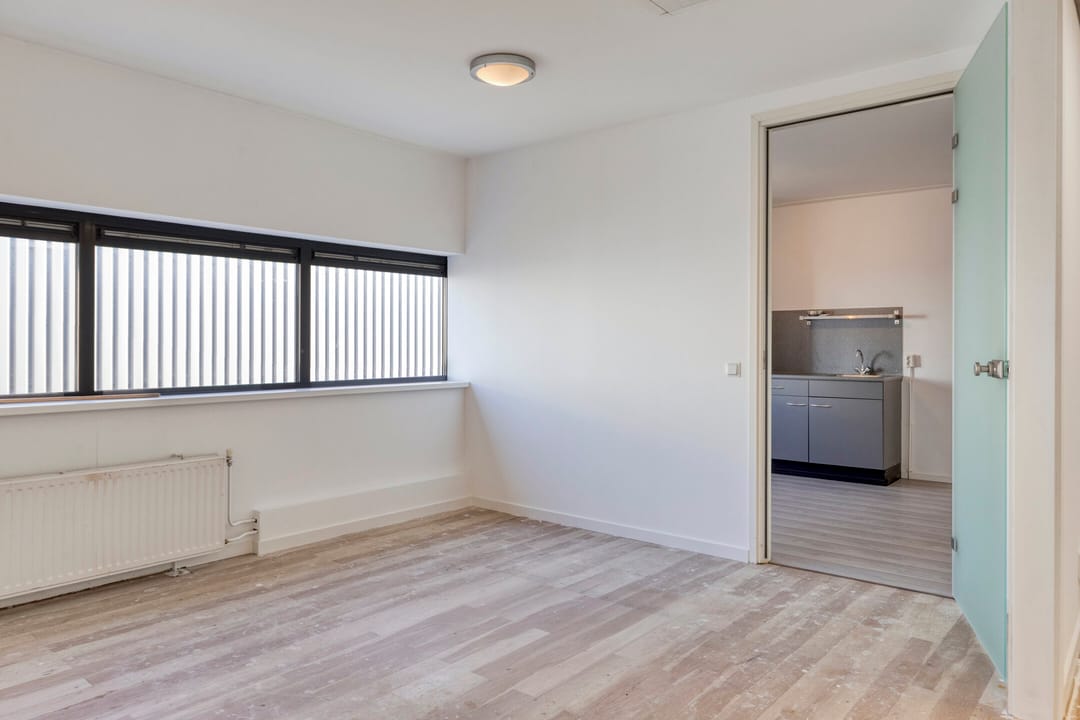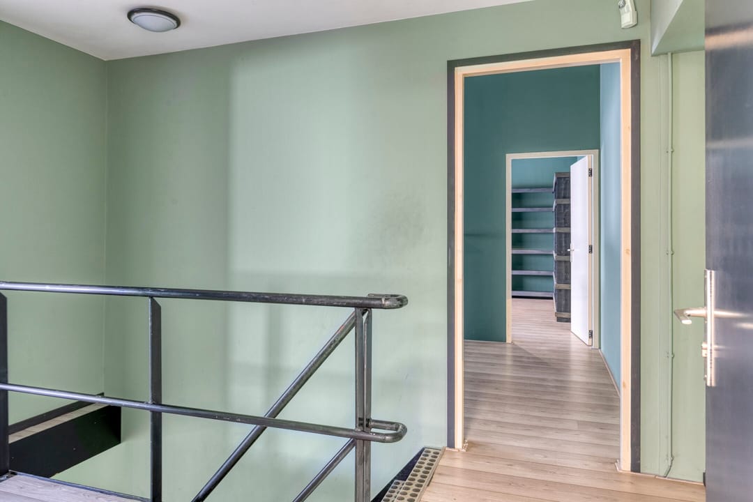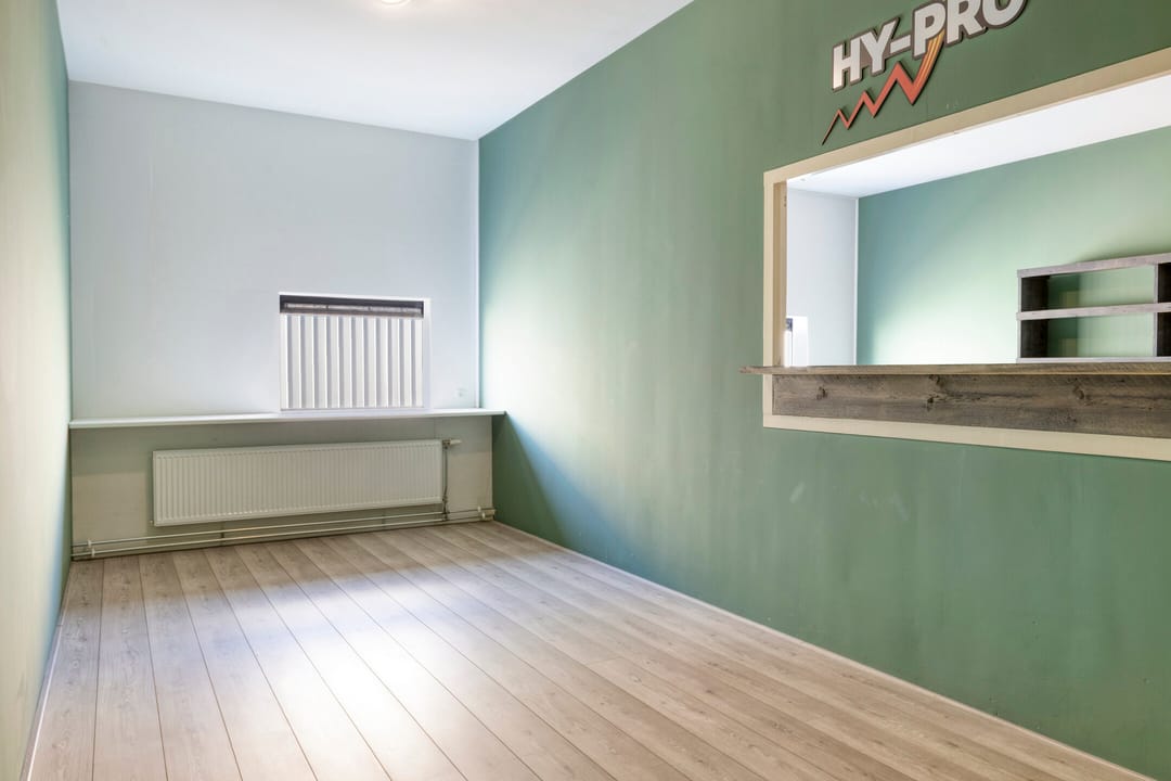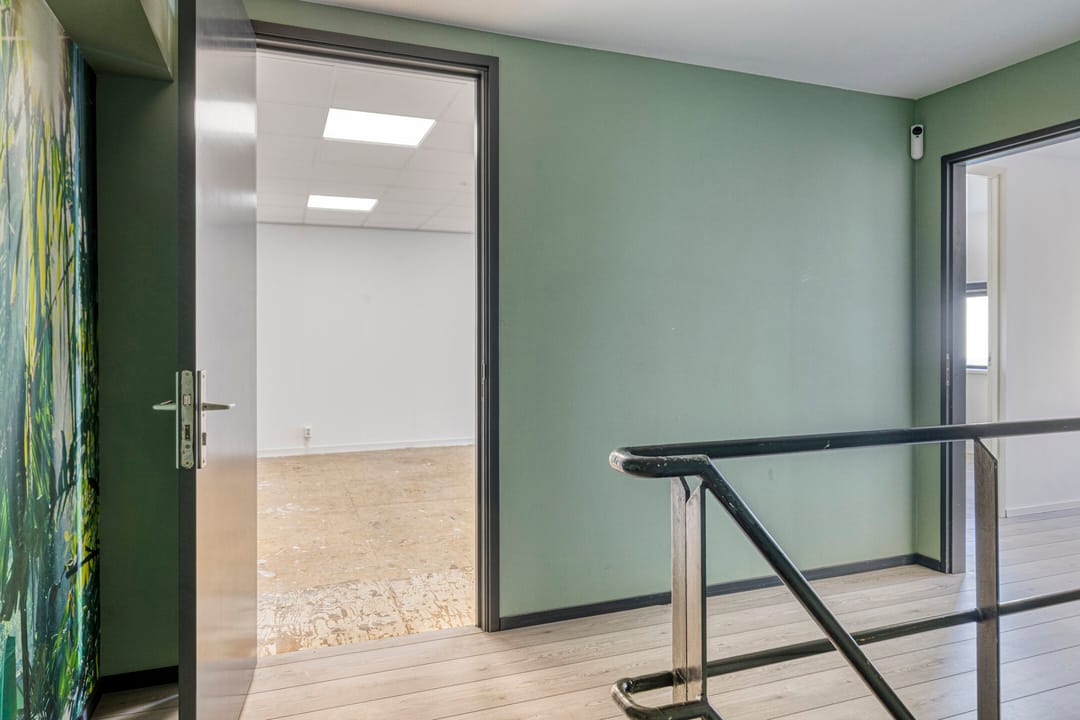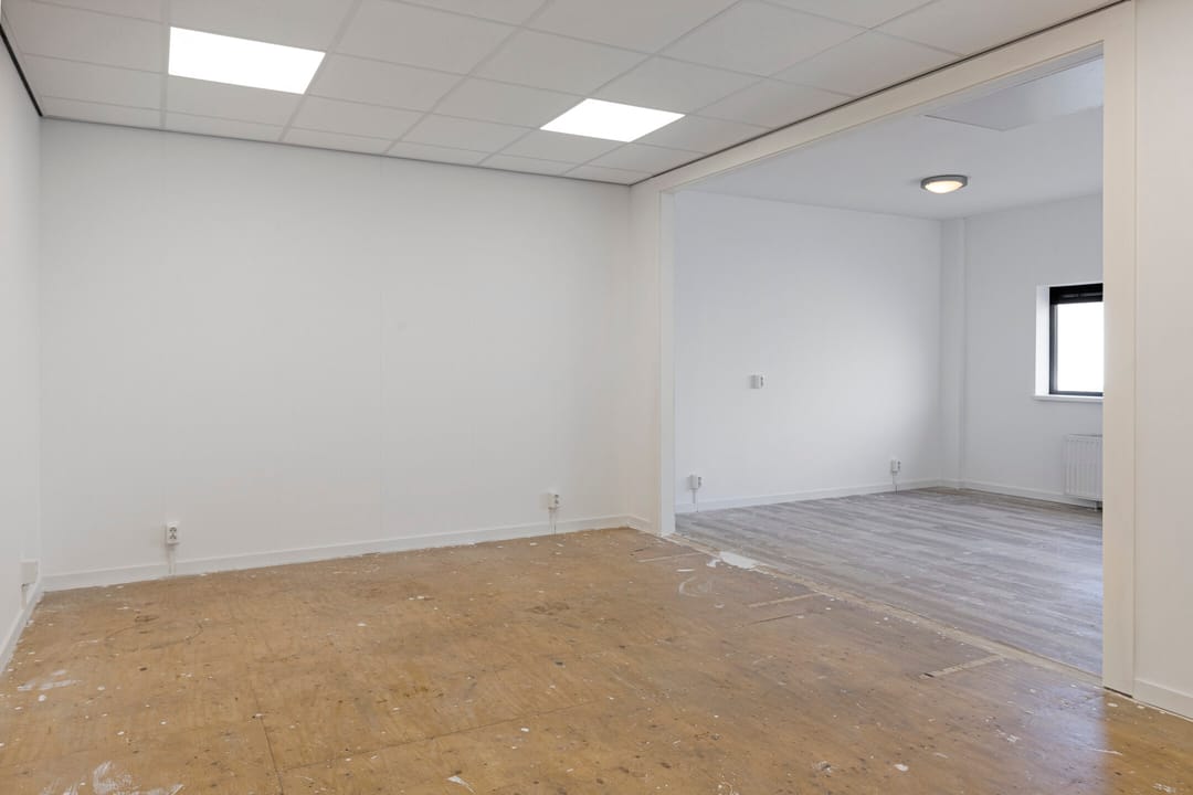 Overloop met toegang tot twee ruime kantoorruimtes en toegang tot pantry. De kantoorruimtes beschikken over een systeemplafond met verlichtingsarmaturen, kabelgoten en een nette vloerafwerking. Zeer veel lichtinval door de grote raampartijen.