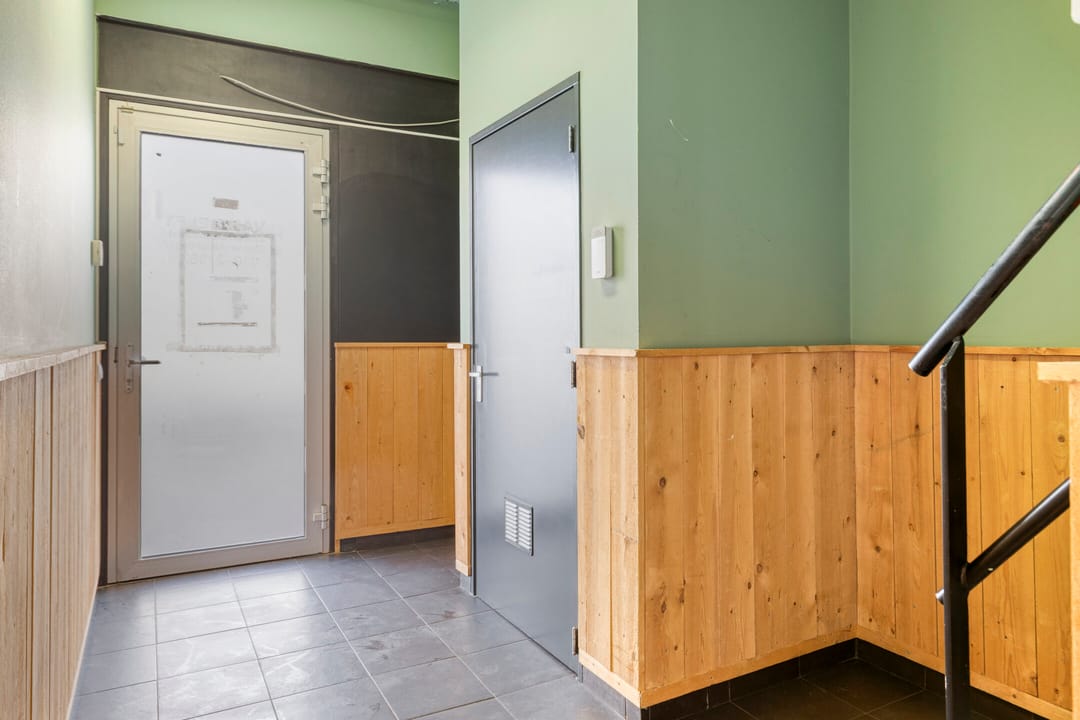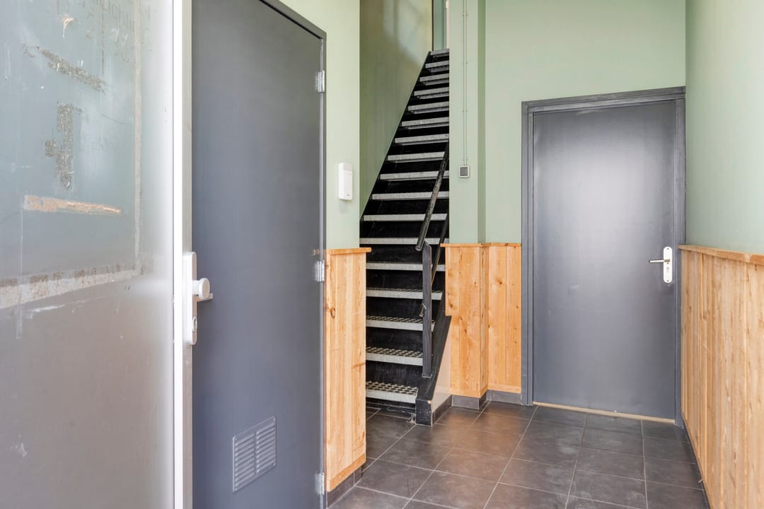 Middels handmatig bedienbare overheaddeur en algemene entreedeur toegang tot de bedrijfsruimte met opslagruimte onder de trap. Vanuit de hal toegang tot het toilet en de trap naar de eerste verdieping.