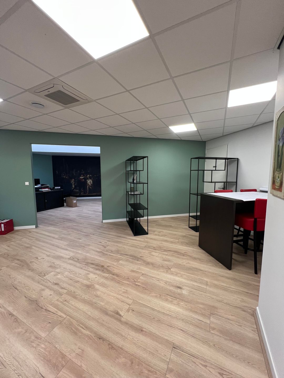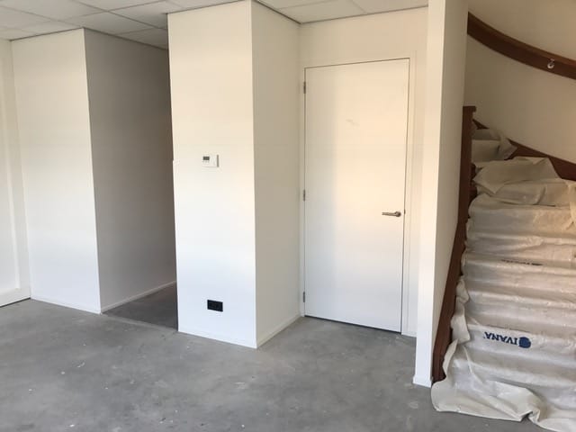 Kantoren voorzien van metalstudwanden en houten binnendeurkozijnen met stompe deuren;