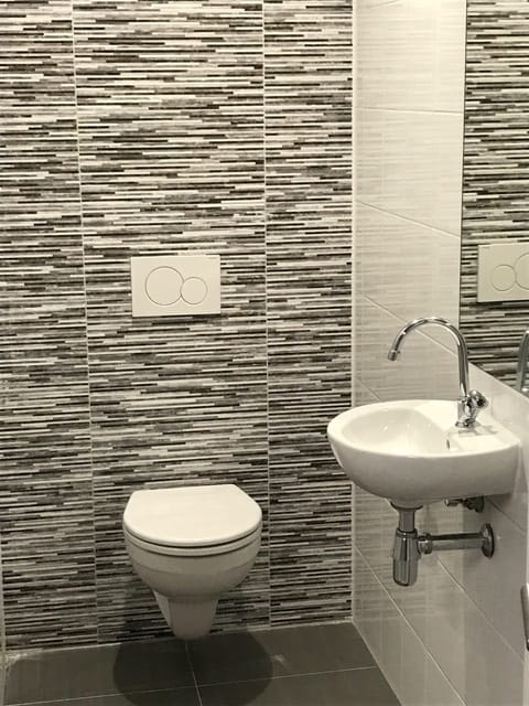 Luxe betegelde toiletruimte met wandcloset en fonteintje.