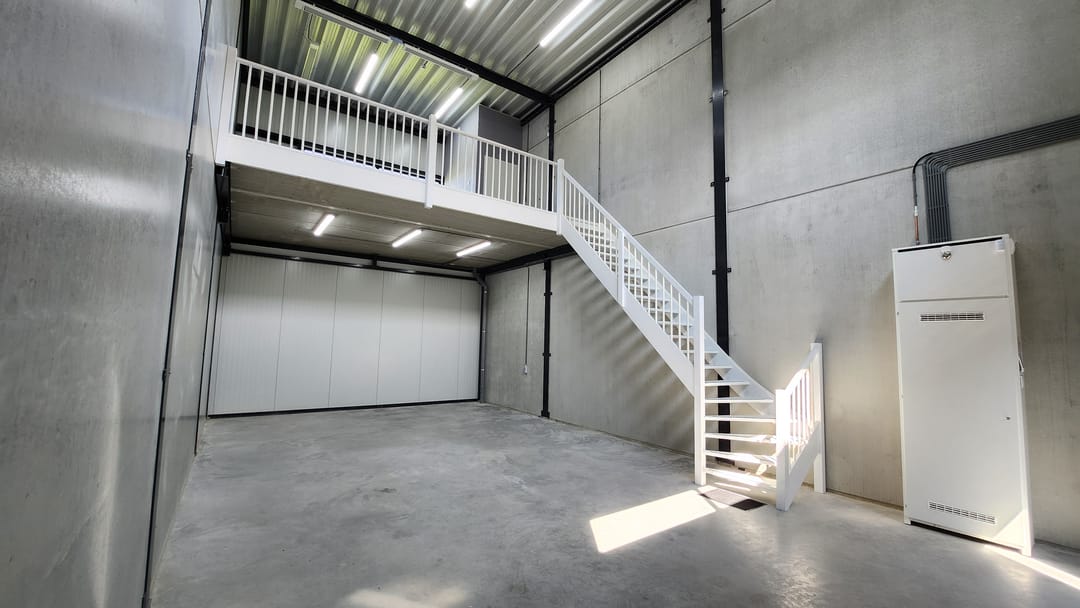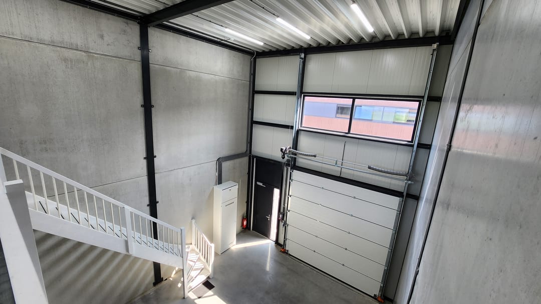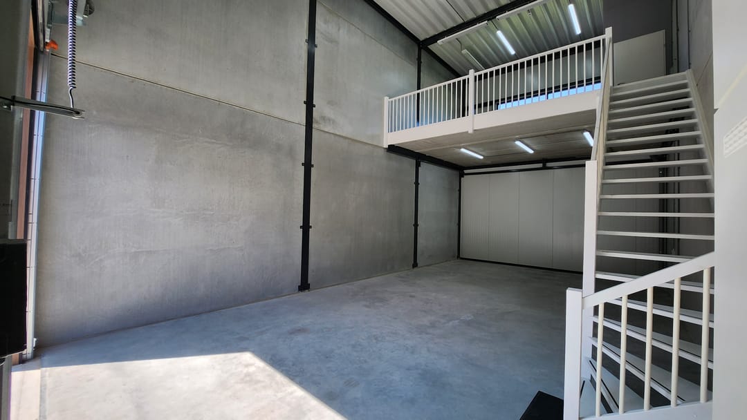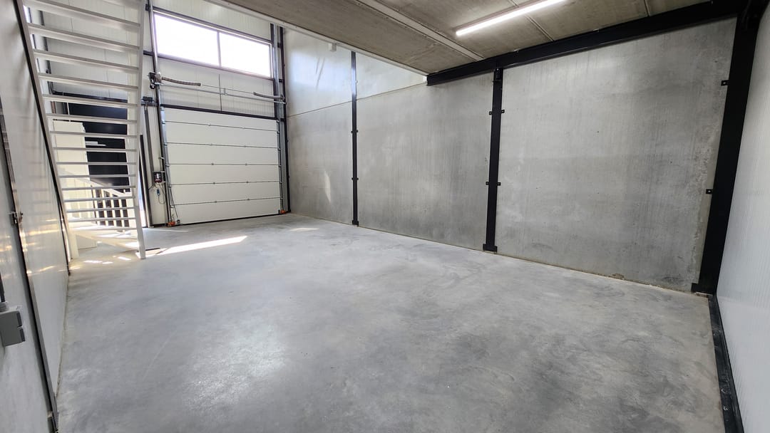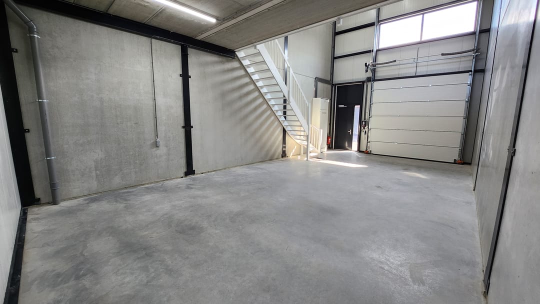 - Overheaddeuren, betonvloer, toilet en pantry