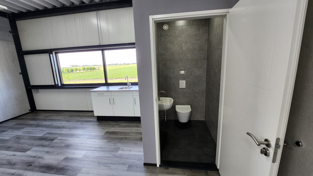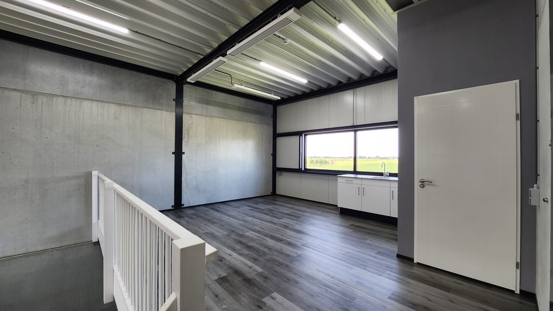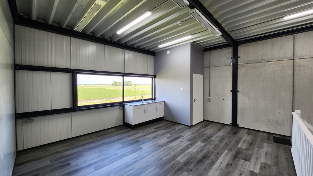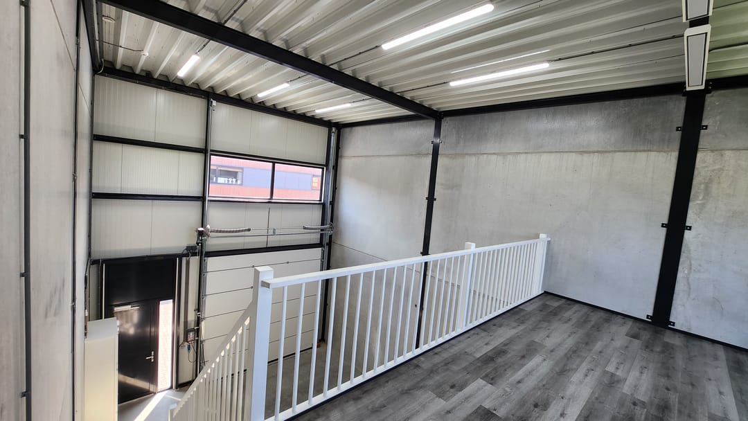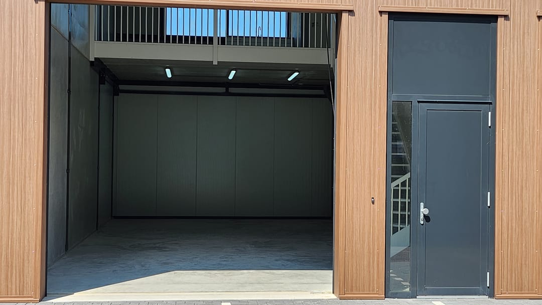 - Overheaddeuren, betonvloer, toilet en pantry