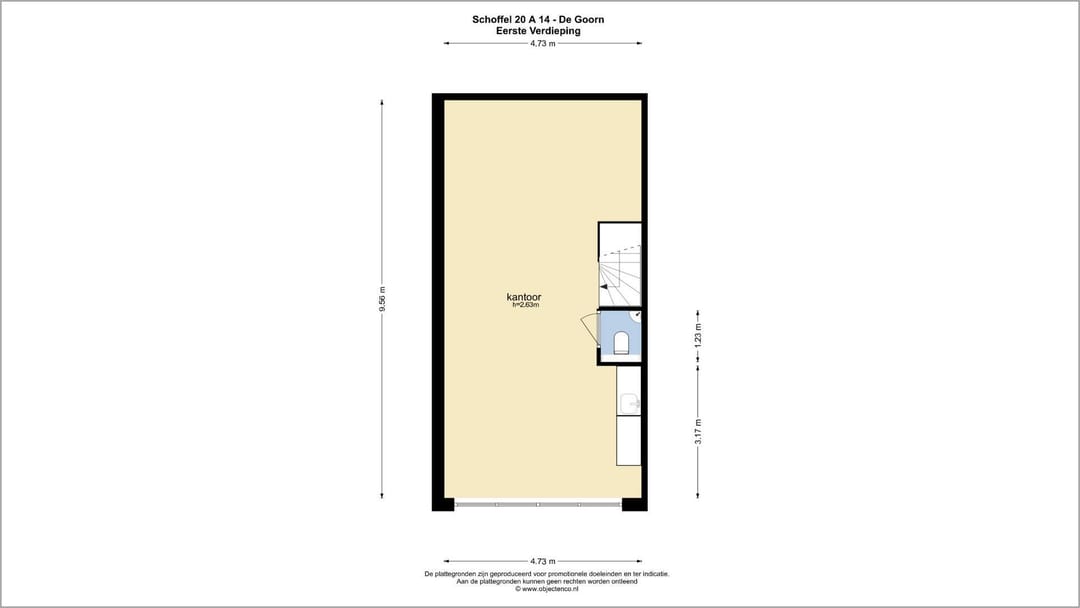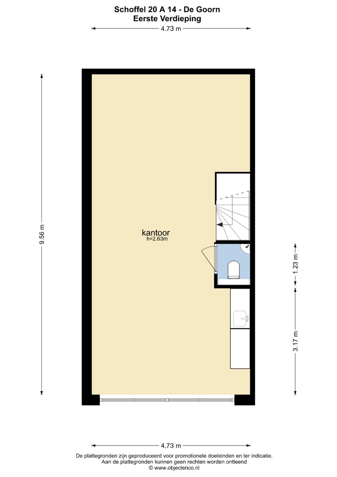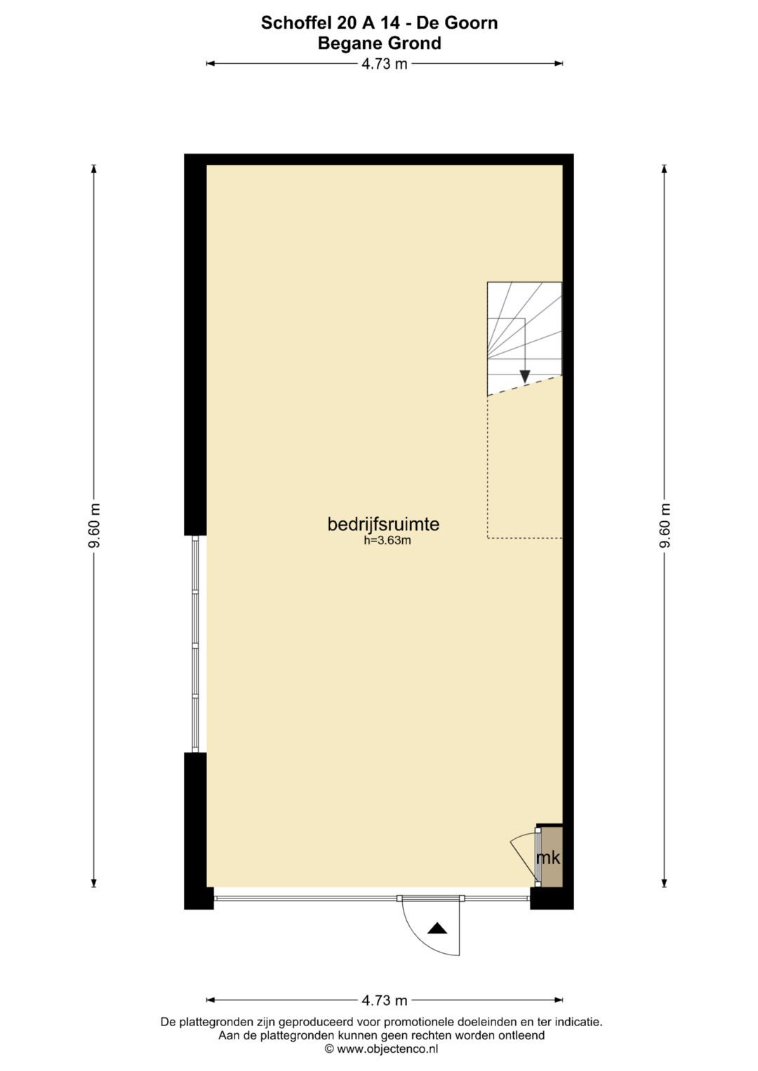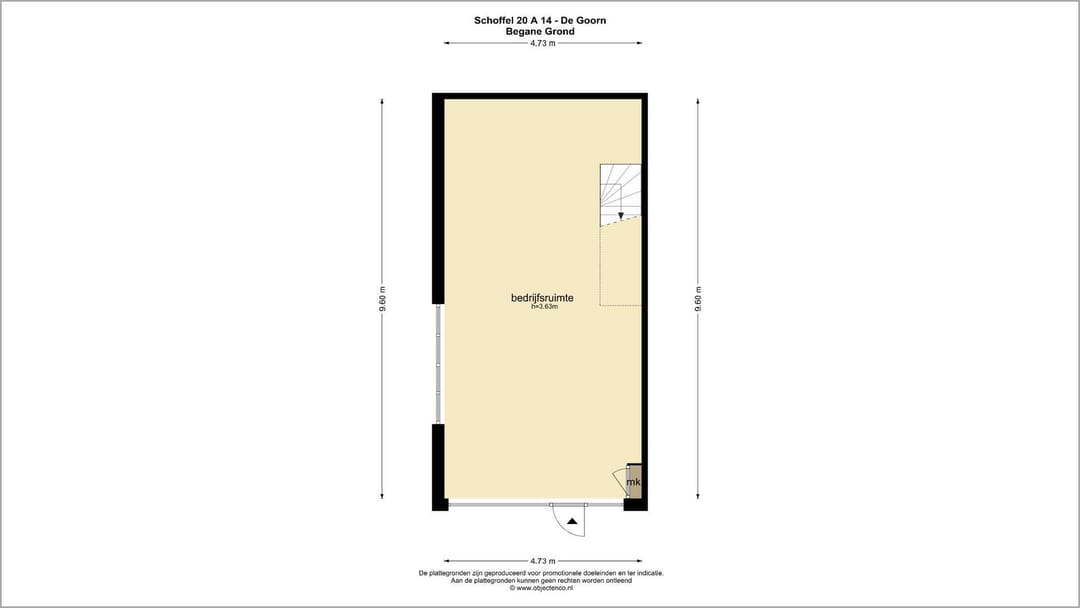 Bruto vloeroppervlakte is 104m2. De unit is inwendig 9.60 meter diep en 4.6 breed (zowel begane grond als verdieping)