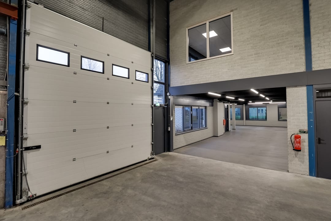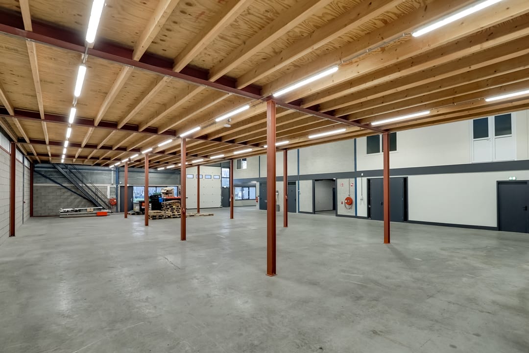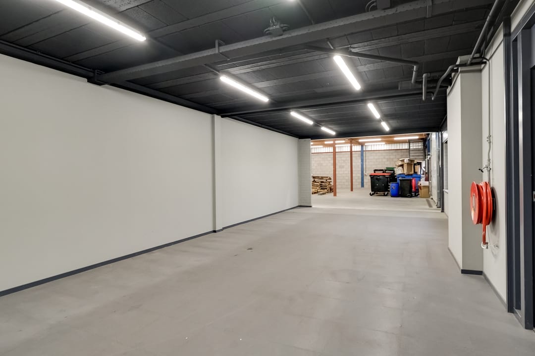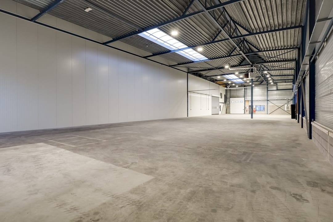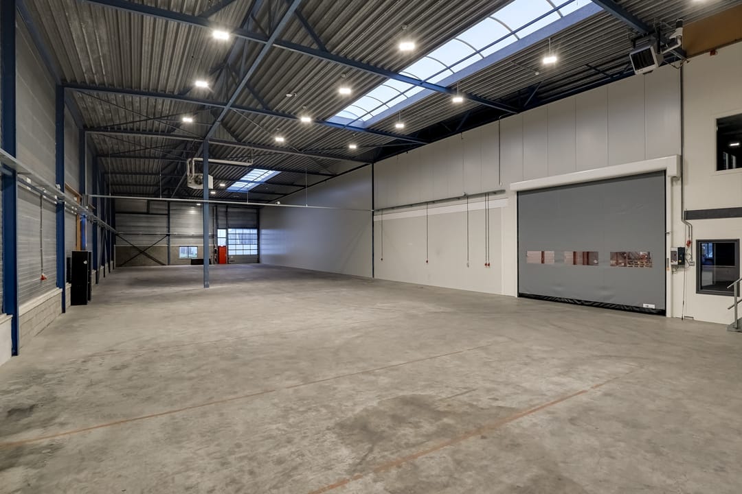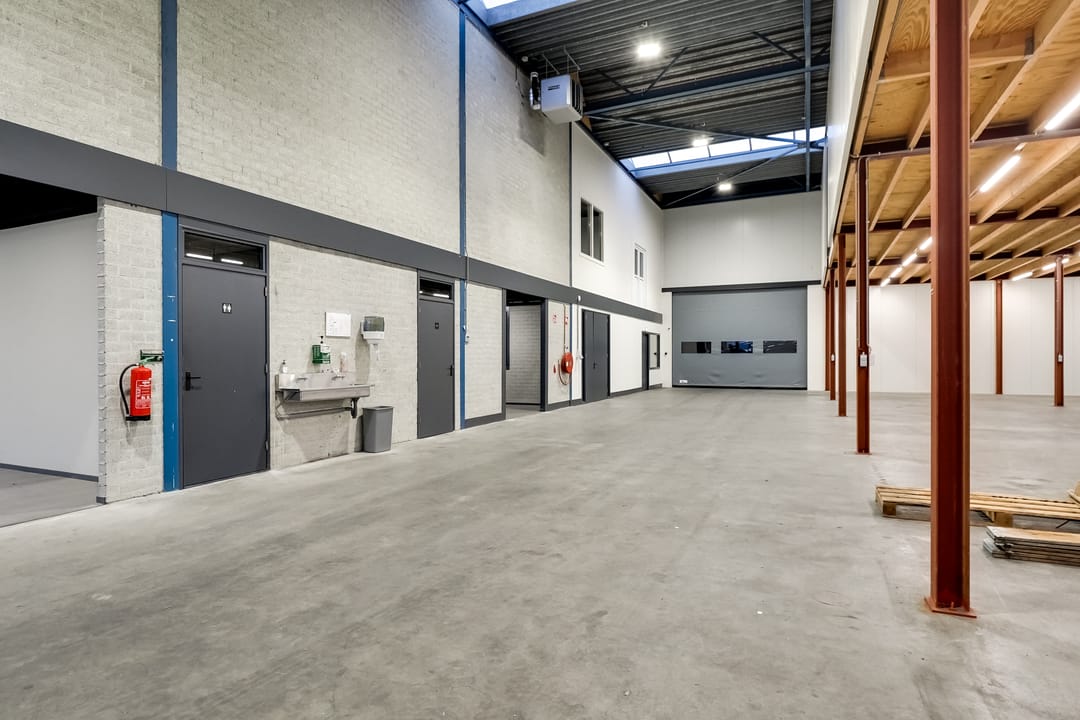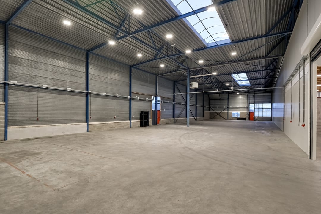 - Lichtstraten, overheaddeuren, krachtstroom, betonvloer, heater, toilet, pantry, airconditioning, inbouwarmaturen en te openen ramen