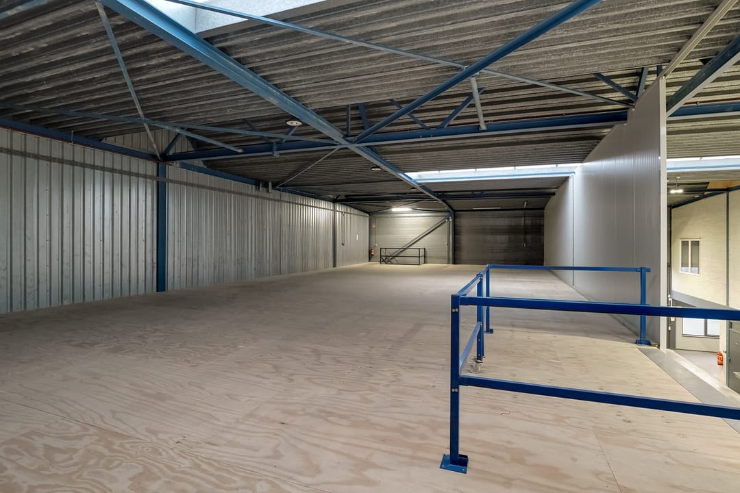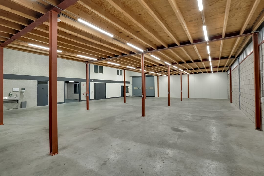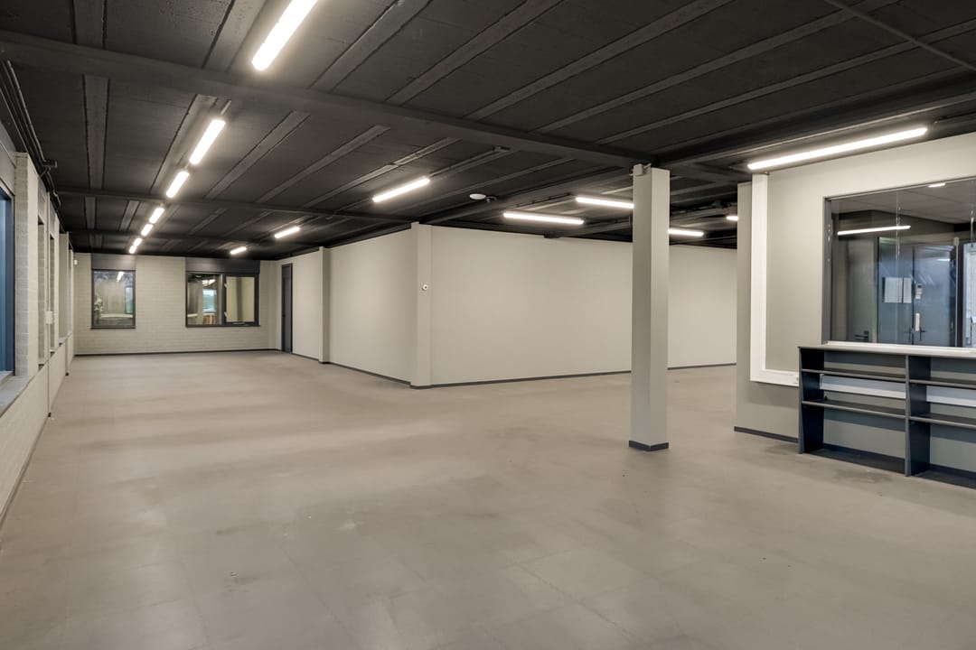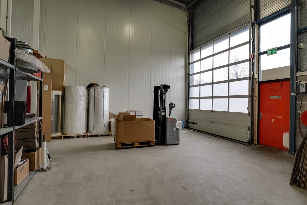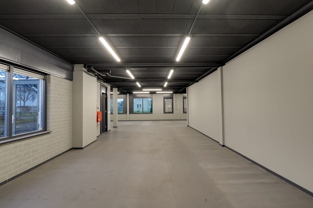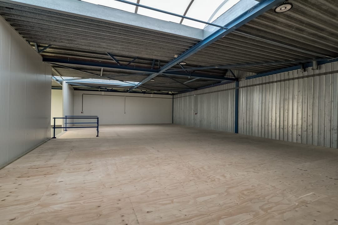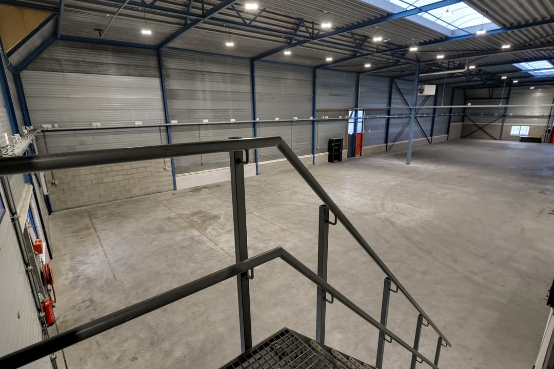 - Lichtstraten, overheaddeuren, krachtstroom, betonvloer, heater, toilet, pantry, airconditioning, inbouwarmaturen en te openen ramen
