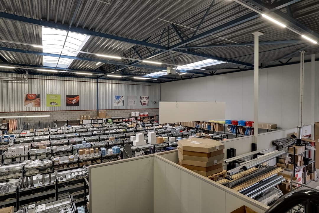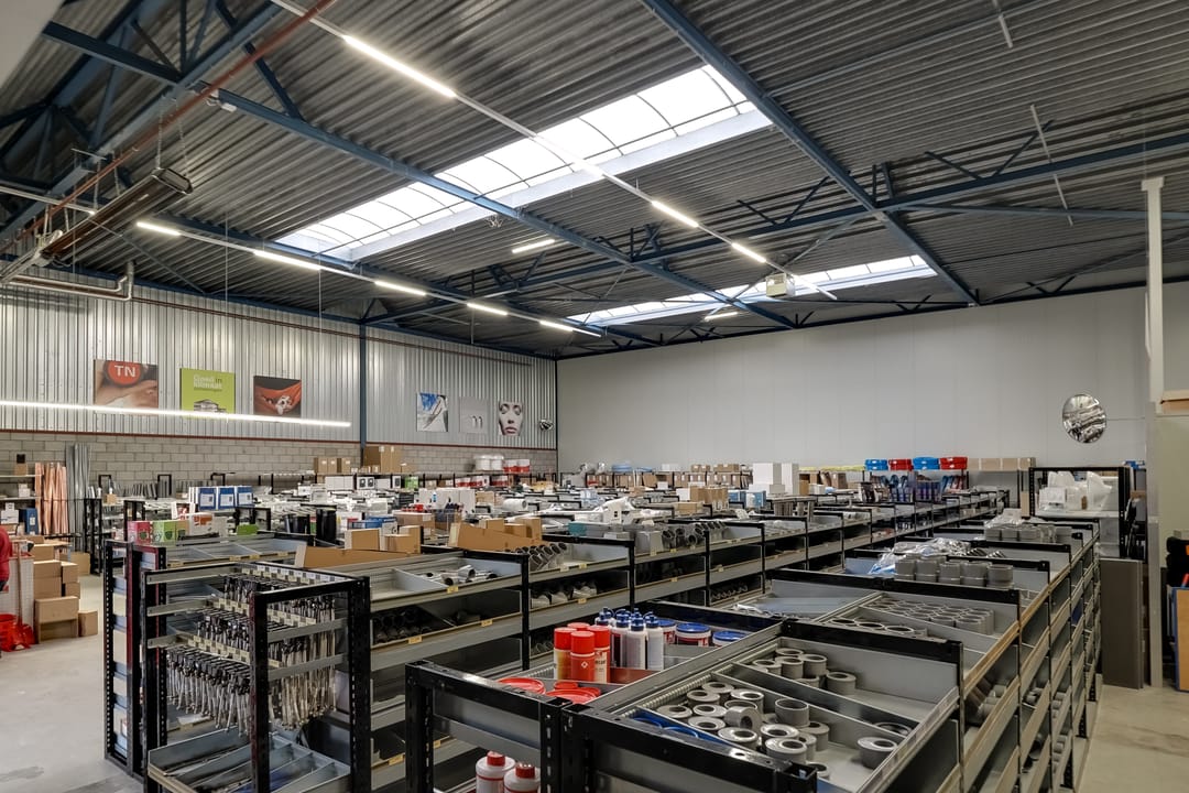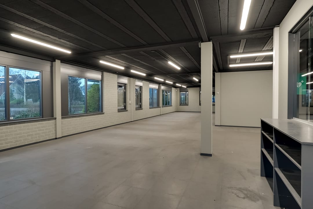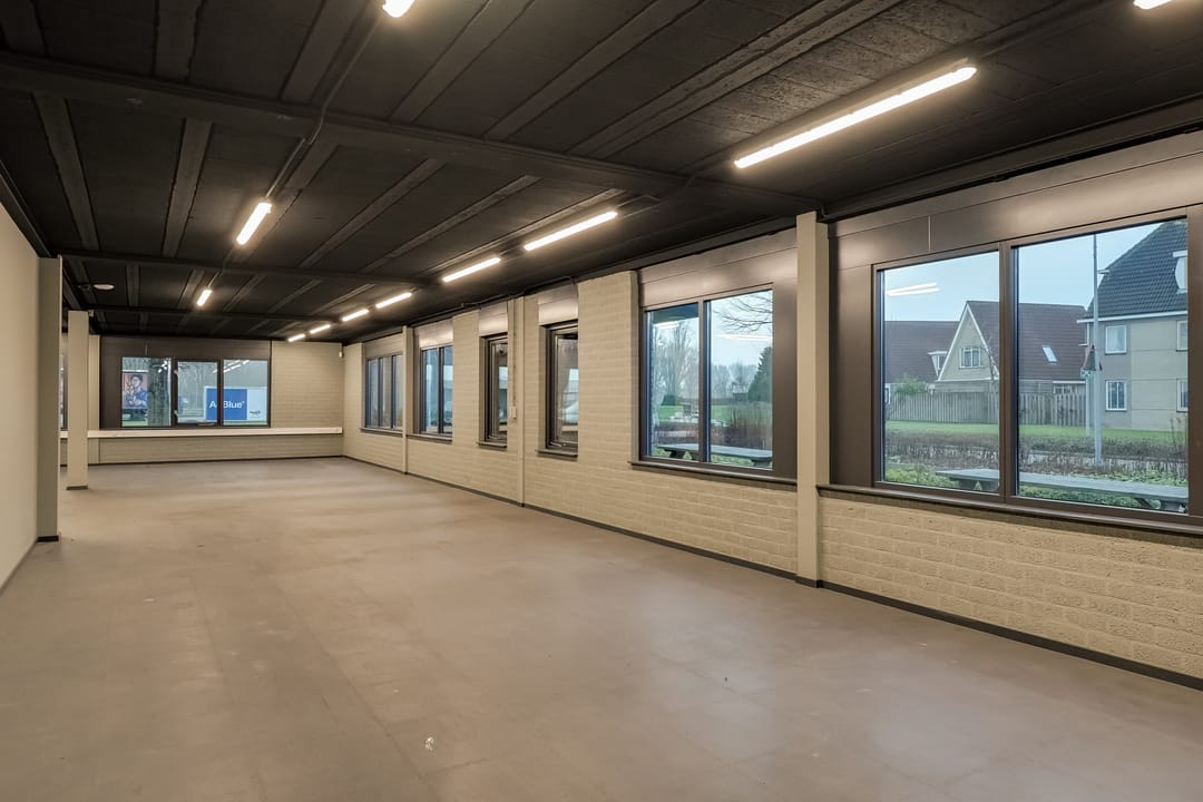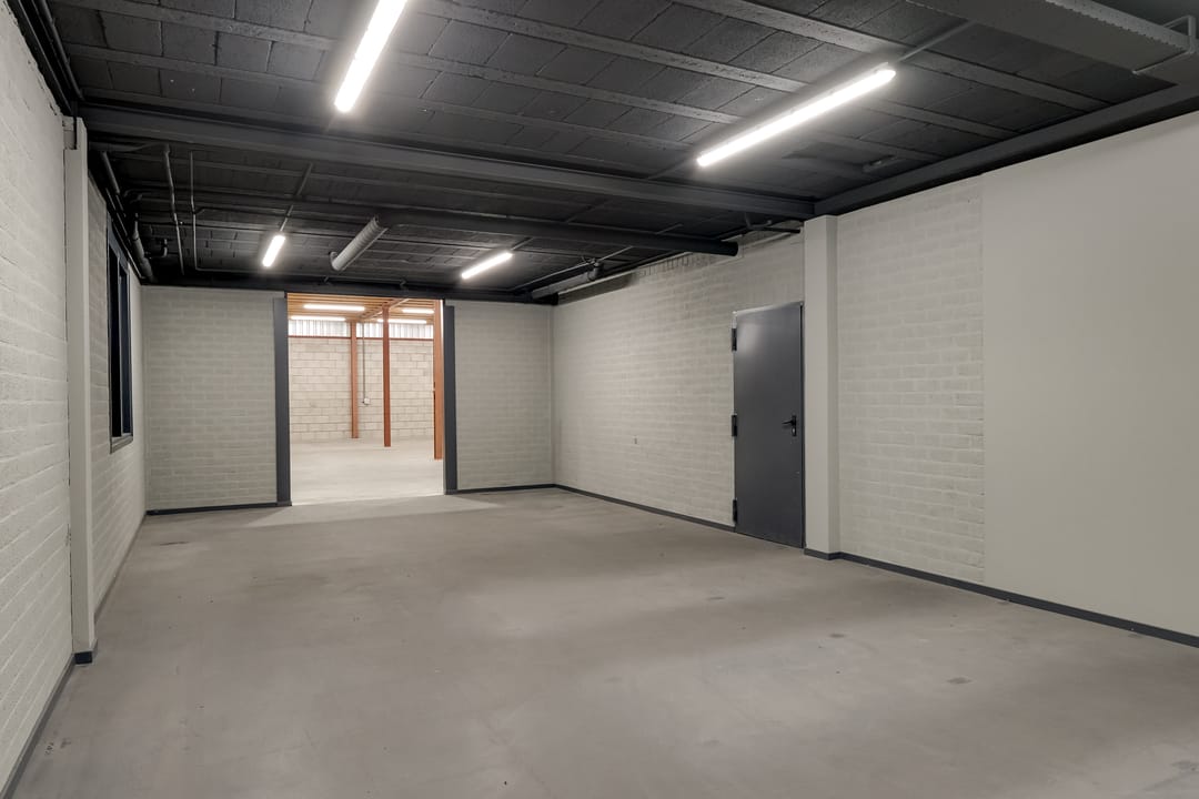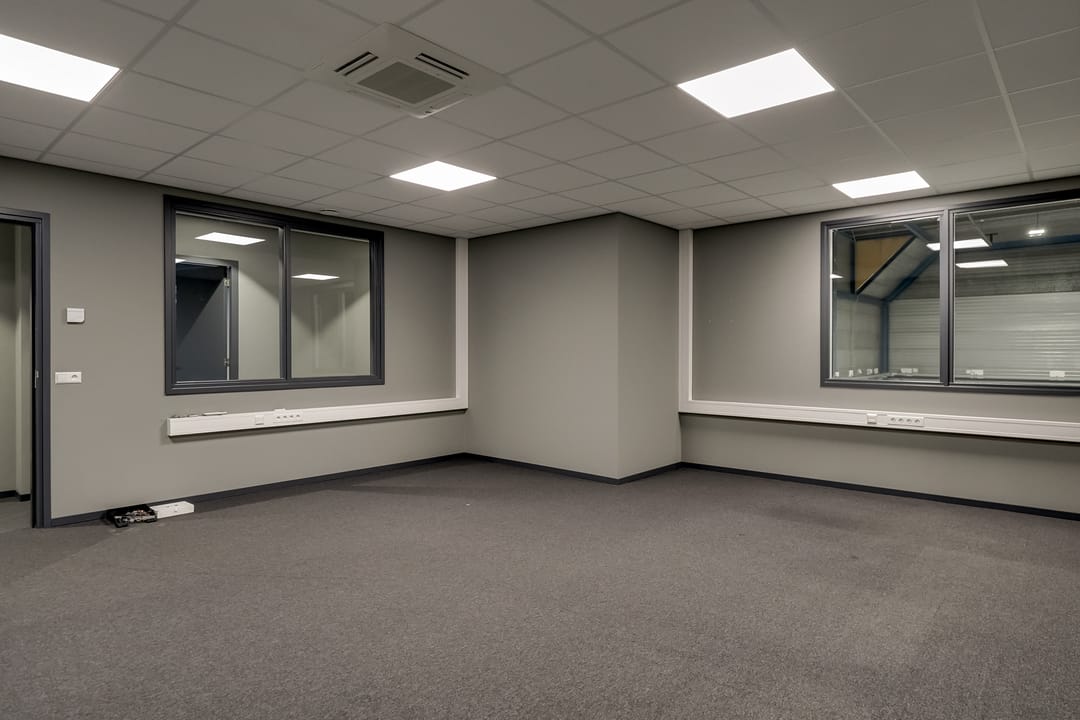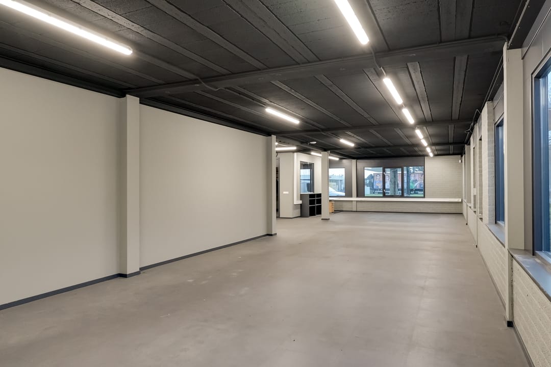 - Lichtstraten, overheaddeuren, krachtstroom, betonvloer, heater, toilet, pantry, airconditioning, inbouwarmaturen en te openen ramen