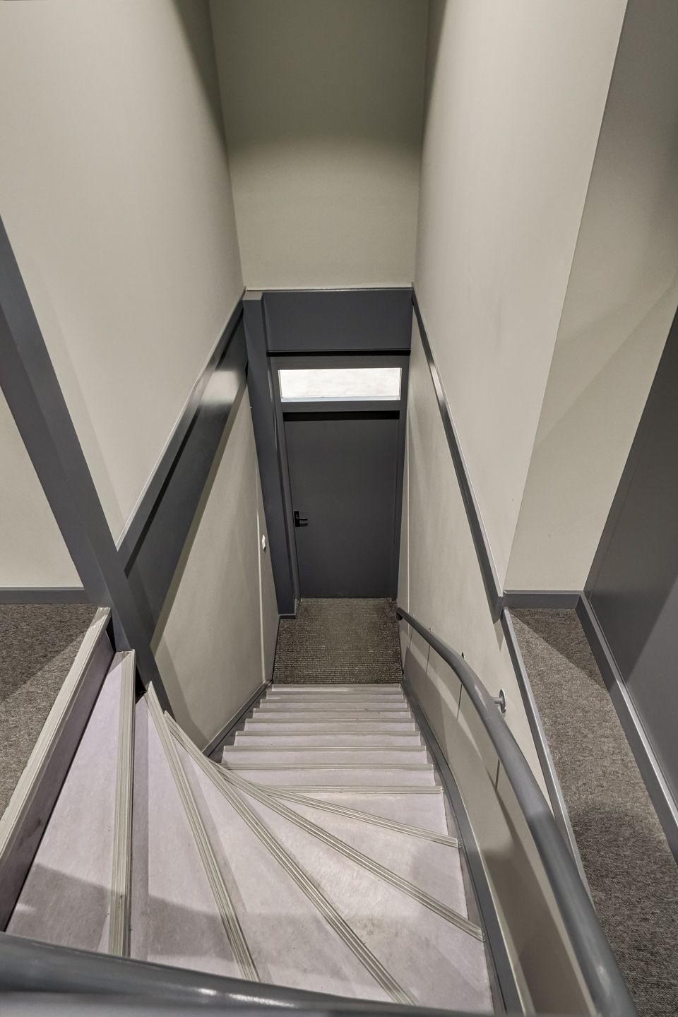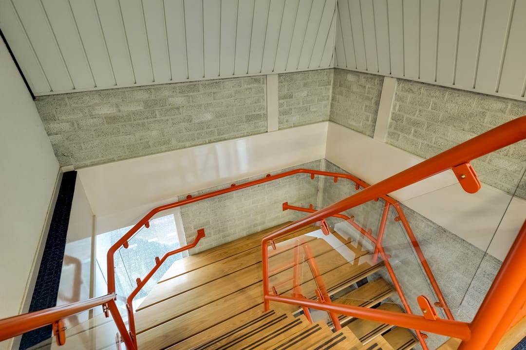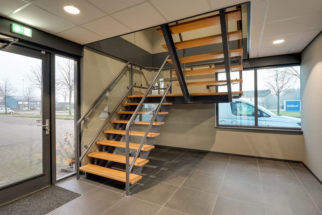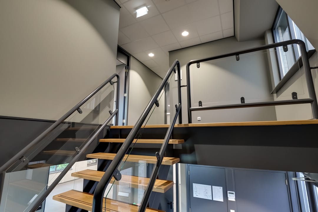 De verdieping biedt een functioneel instructielokaal, kantoorkamer en opslagruimte op een open entresolvloer.