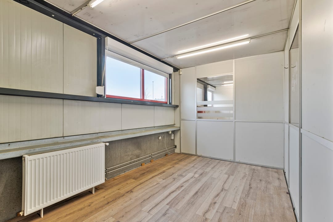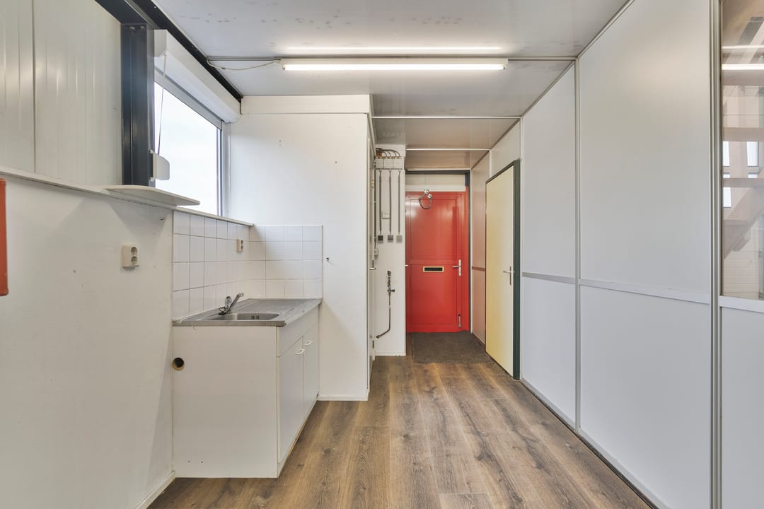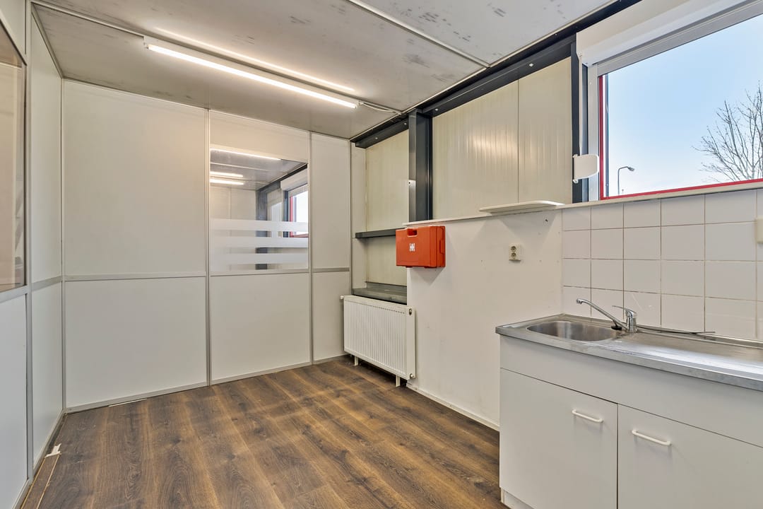 • eenvoudig kantoorvertrek met verwarming, keukenblok en toilet v.v. voorportaal