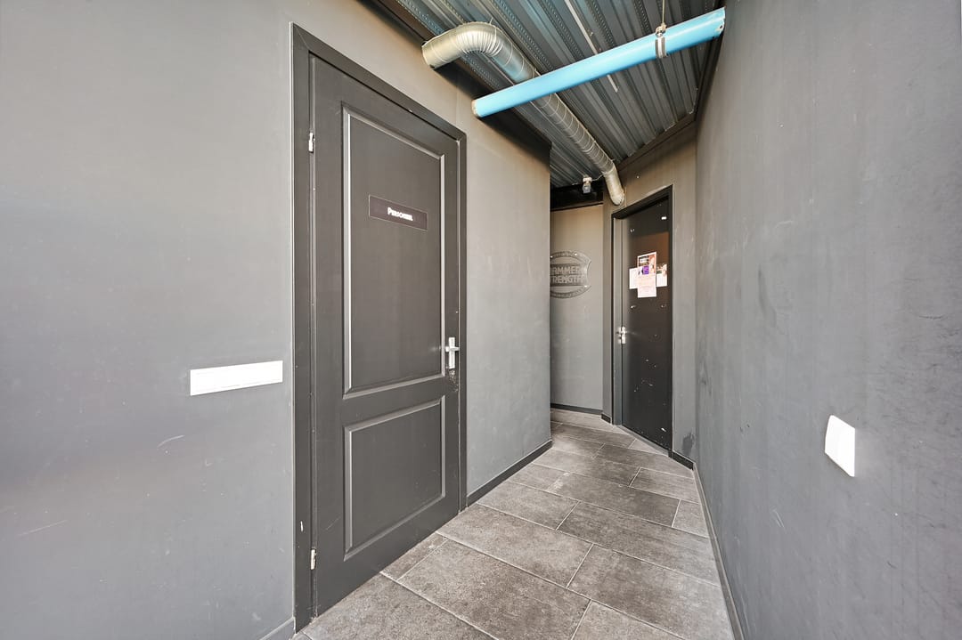 De eerste verdieping is bereikbaar via een vaste trap en heeft een oppervlakte van circa 265 m², eveneens voorzien van grote raampartijen met kiepramen. De ruimte is multifunctioneel in te richten. De twee aanwezige vides zorgen voor extra licht en een ruimtelijk gevoel. Ze kunnen worden afgesloten, waardoor er ca. 47 m² extra vloerruimte ontstaat. Daarnaast bevinden zich op deze verdieping dames- en herentoiletten, een douchecabine en een wastafel.