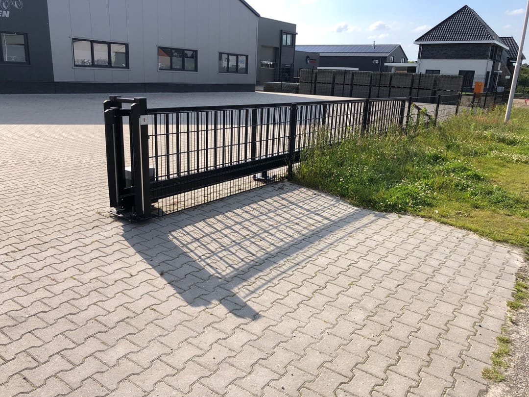 De toegang is via een op afstand te openen en te sluiten breed hek.