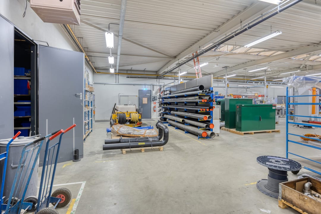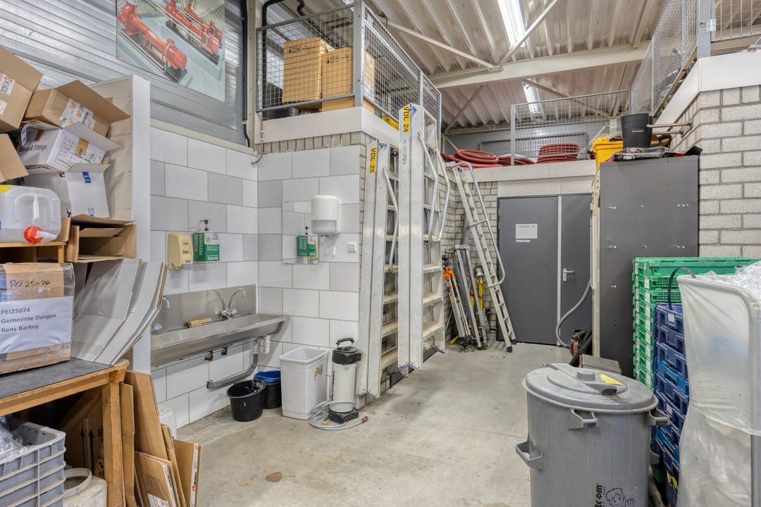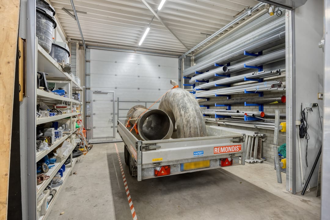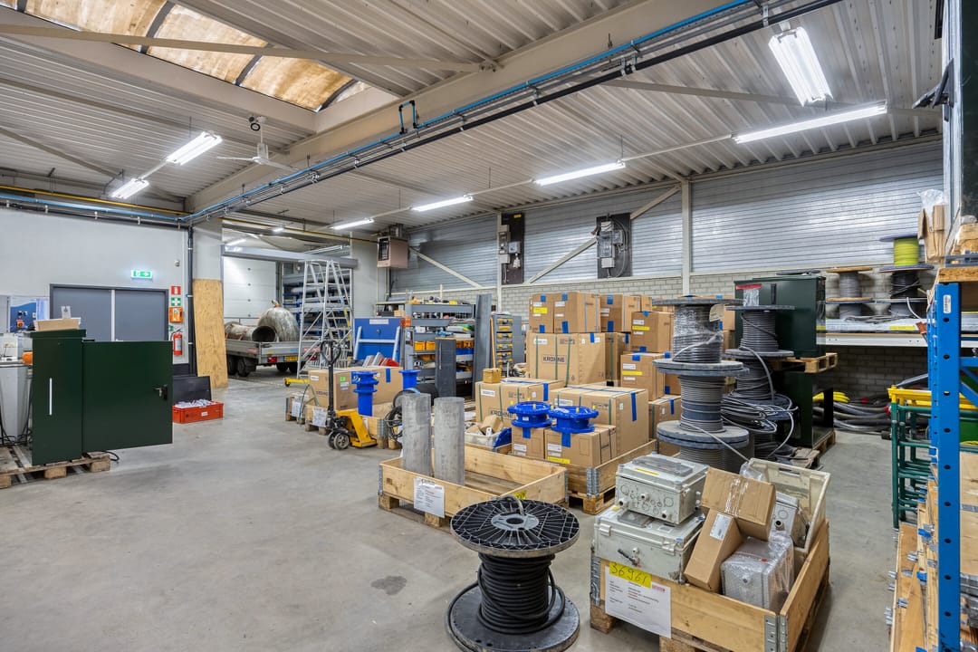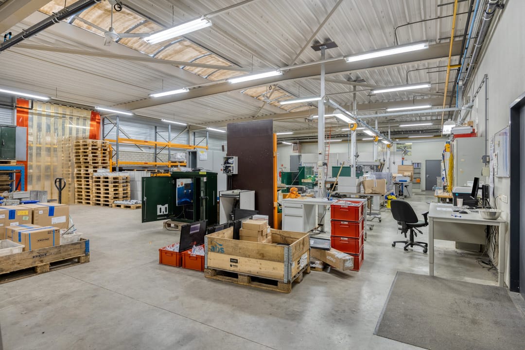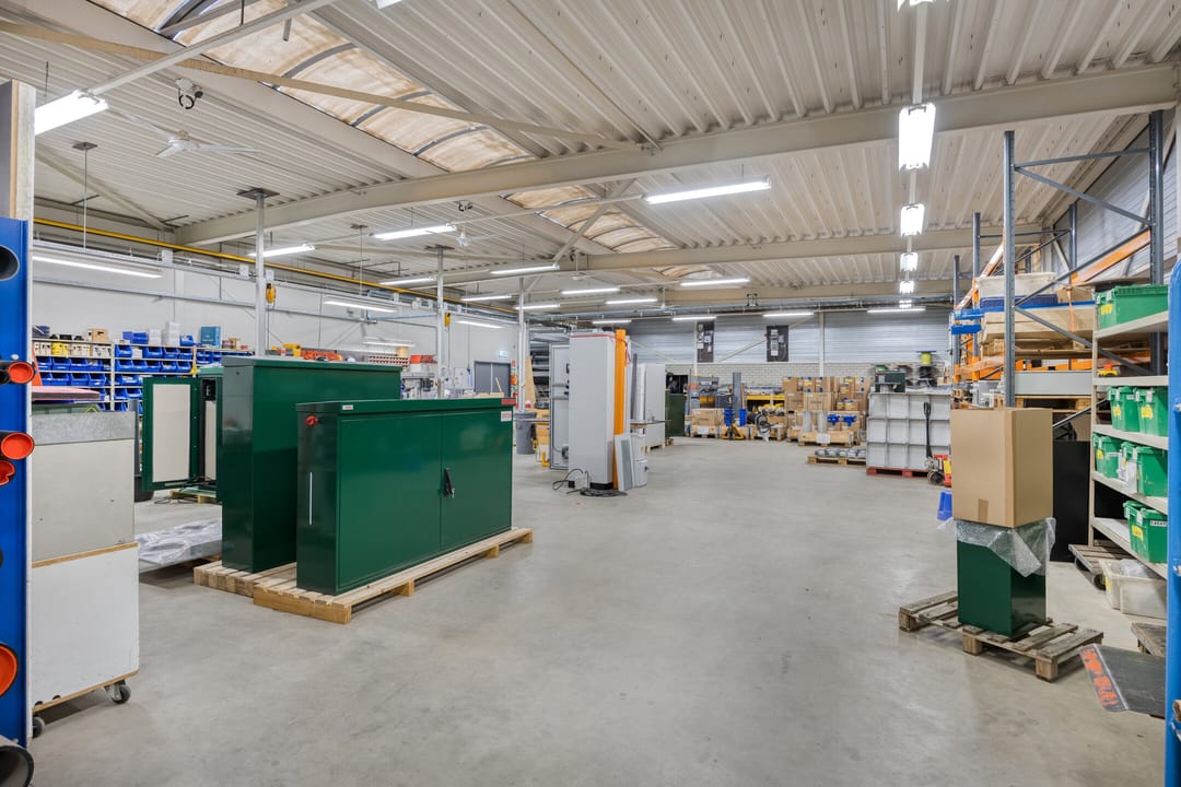 - Lichtstraten, overheaddeuren, betonvloer, heater, toilet, pantry, inbouwarmaturen en te openen ramen