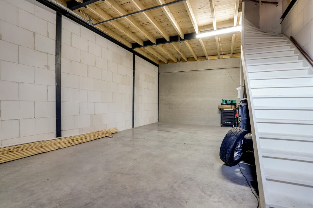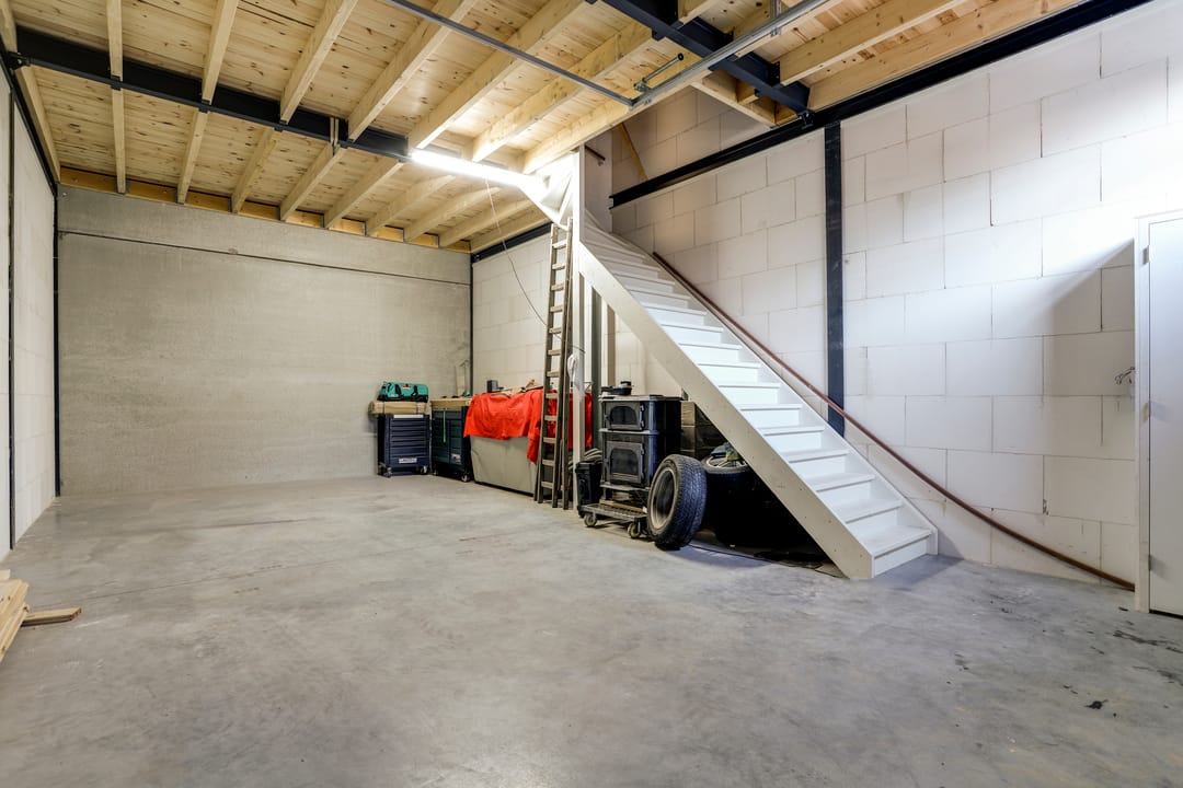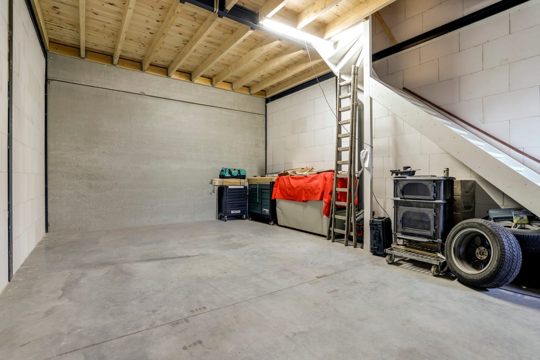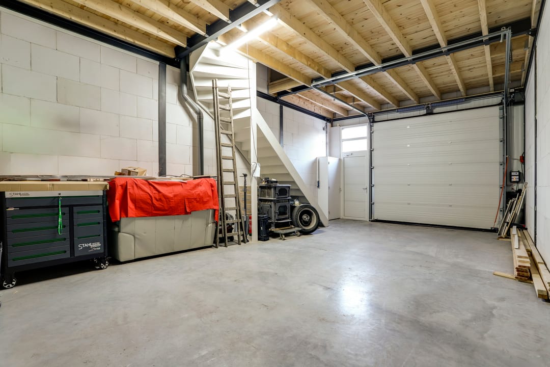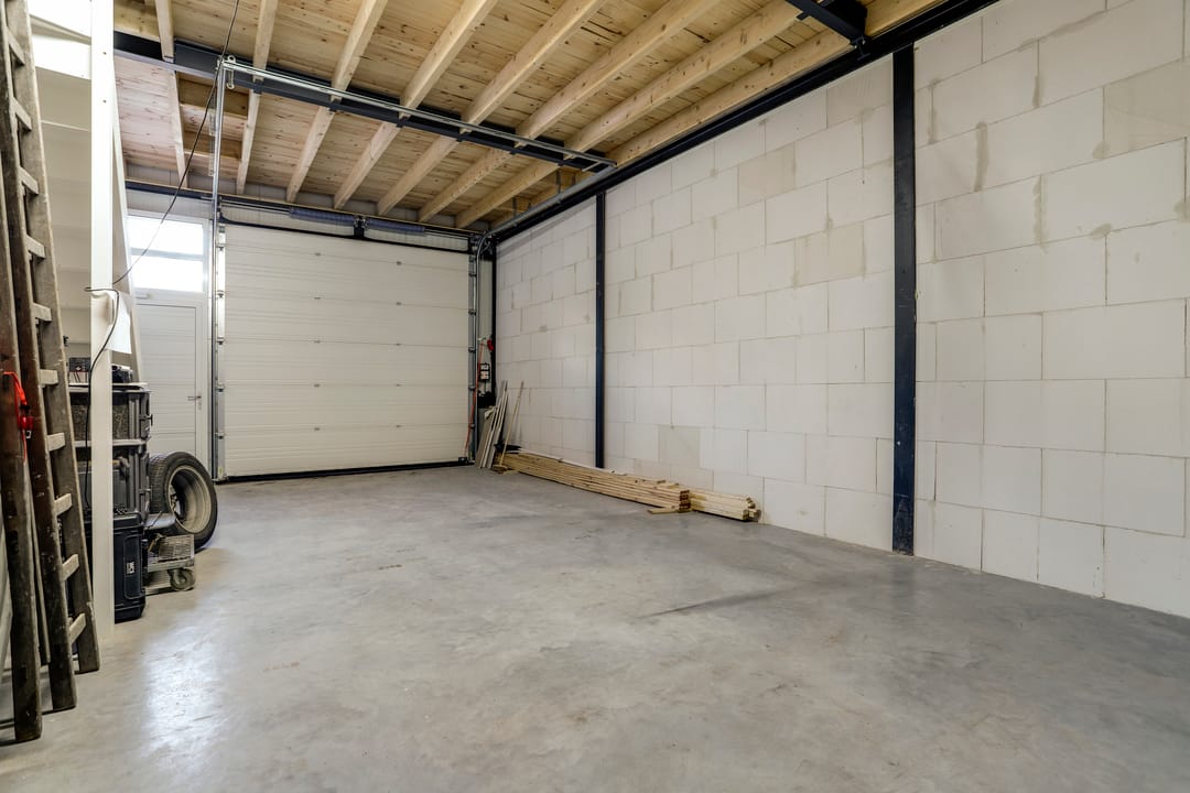 - Overheaddeuren, krachtstroom, betonvloer, toilet, pantry, inbouwarmaturen en te openen ramen
