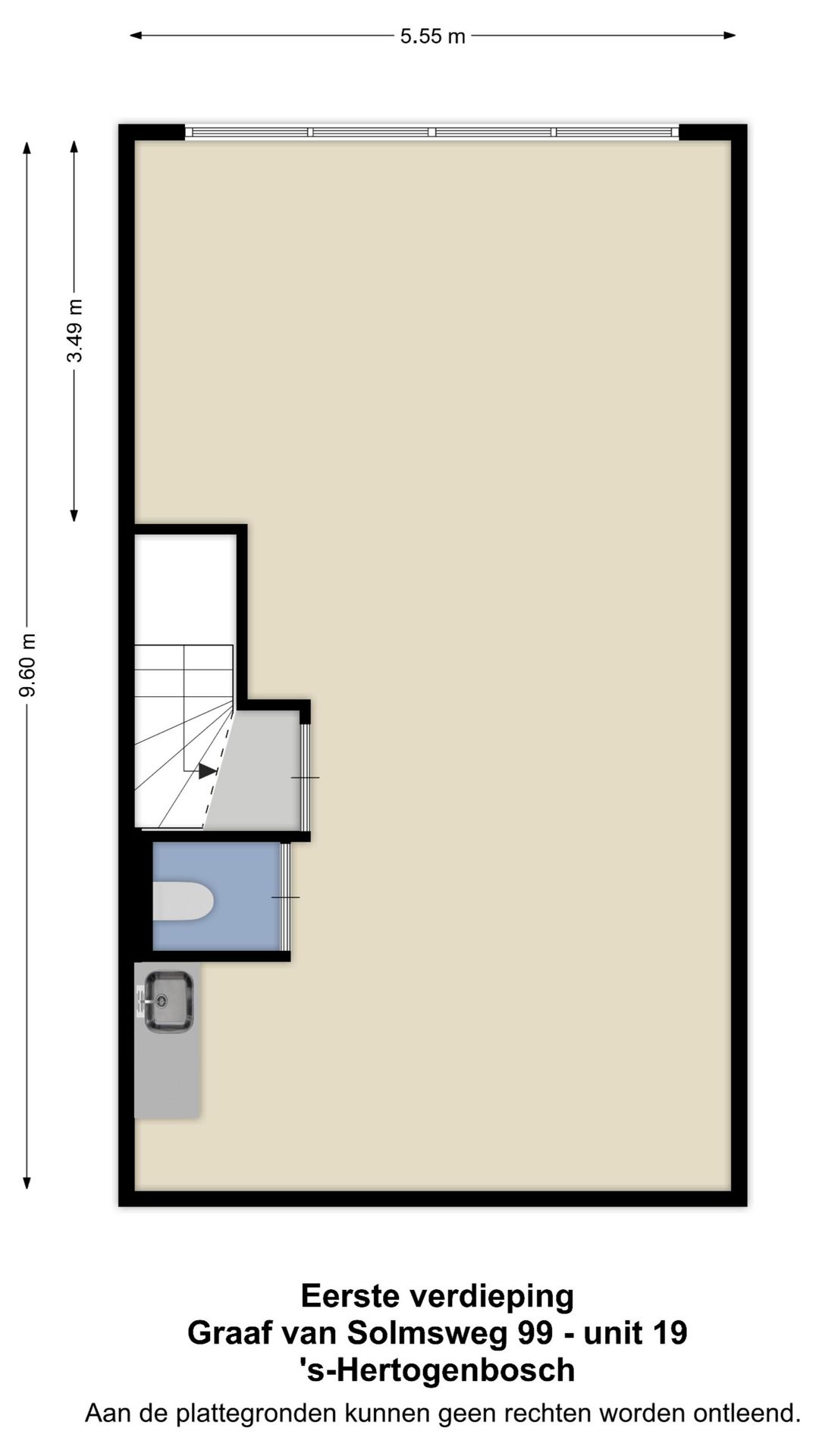 Nieuwe, in 2024 uitstekend afgewerkte bedrijfsunit op het bedrijventerrein De Rietvelden te 's-Hertogenbosch, aan de Graaf van Solmsweg 99 E, unit 19. Deze multifunctionele bedrijfsunit van circa 105 m² is verdeeld over een begane grond van 53 m² en circa 52 m² (kantoor)ruimte op de verdieping. De unit ligt op een goede locatie op het industrieterrein in Den Bosch en op zeer korte afstand van de uitvalswegen naar de A2 en A59. Op de Rietvelden zijn zowel industrie, allerlei groothandel- en detailhandelsbedrijven gevestigd.