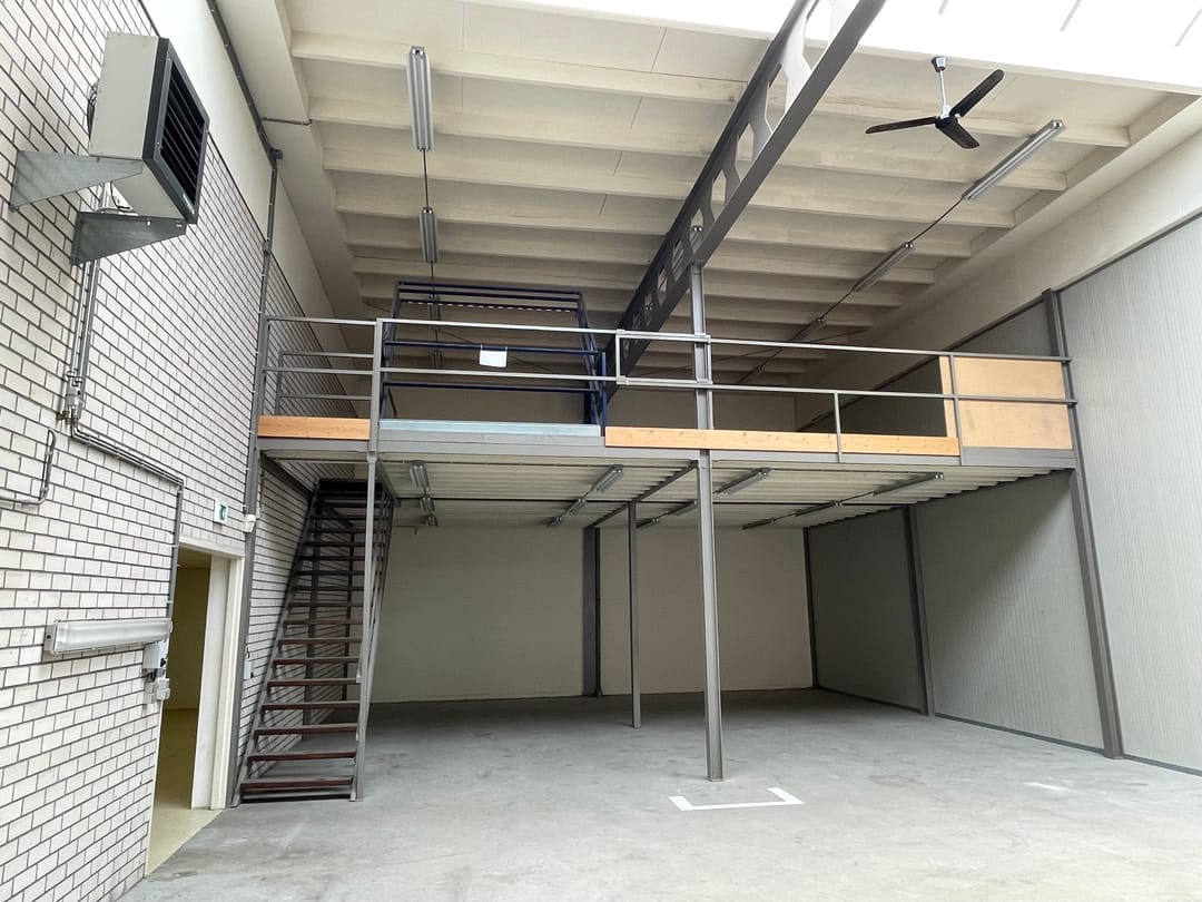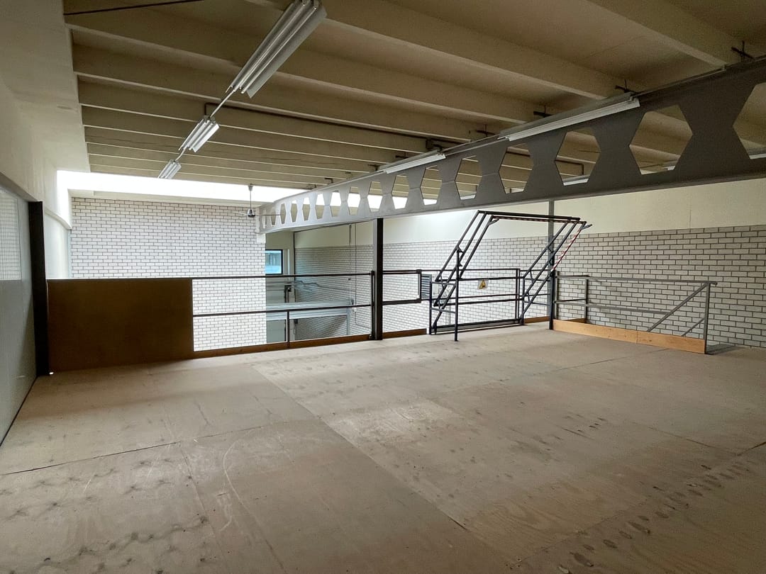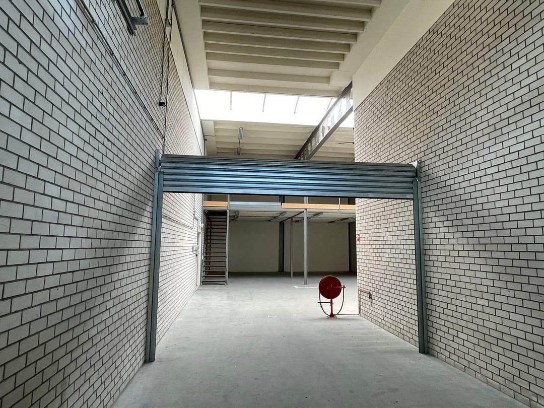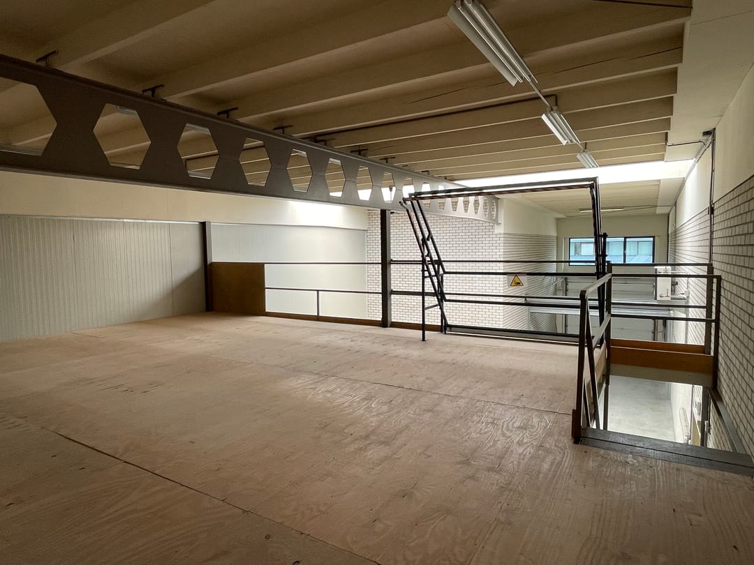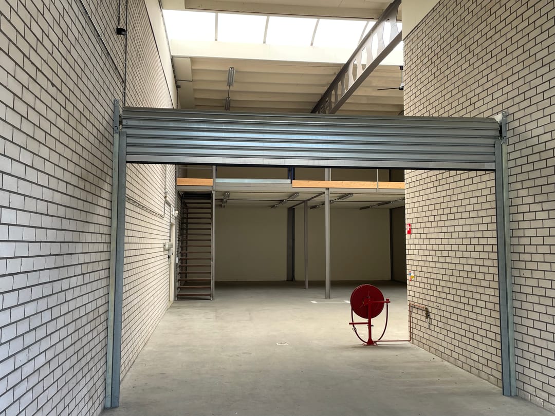 De bedrijfshal met vide heeft een grote lichtstraat en de ruimte is voorzien van elektrische overheaddeur, betonvloer, verlichting, toilet, heater.