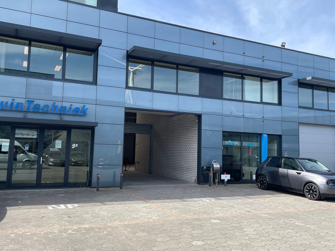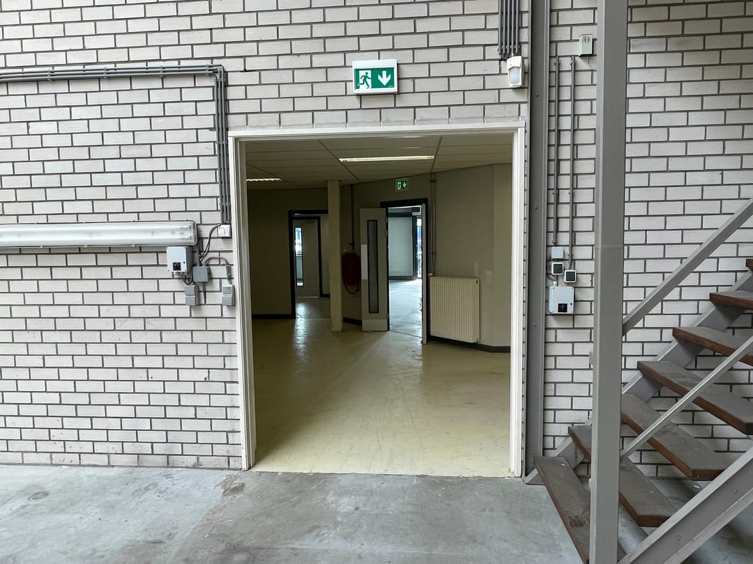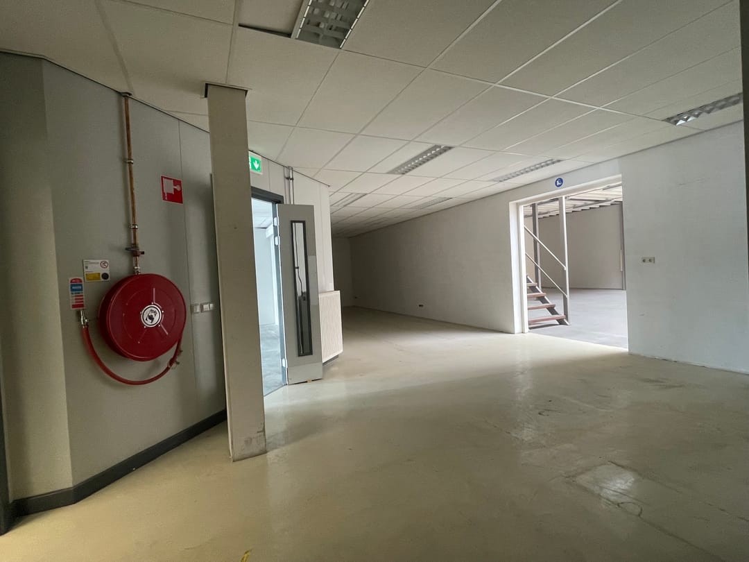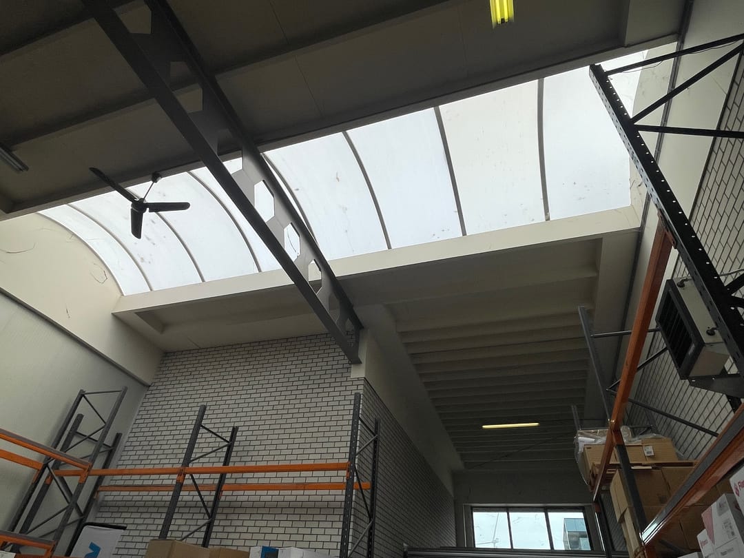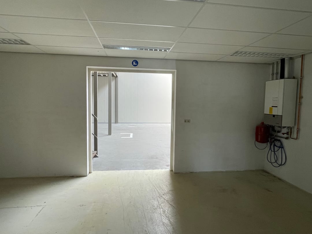 De bedrijfshal met vide heeft een grote lichtstraat en de ruimte is voorzien van elektrische overheaddeur, betonvloer, verlichting, toilet, heater.