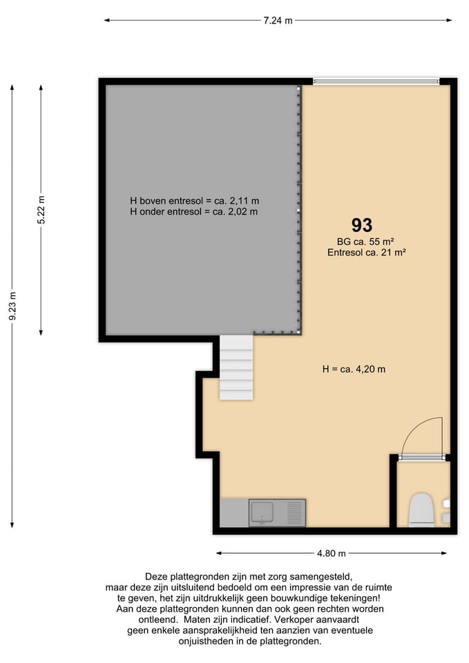 - Vrije hoogte onder entresol ca. 2,02 m en op het entresol ca. 2,11 m.