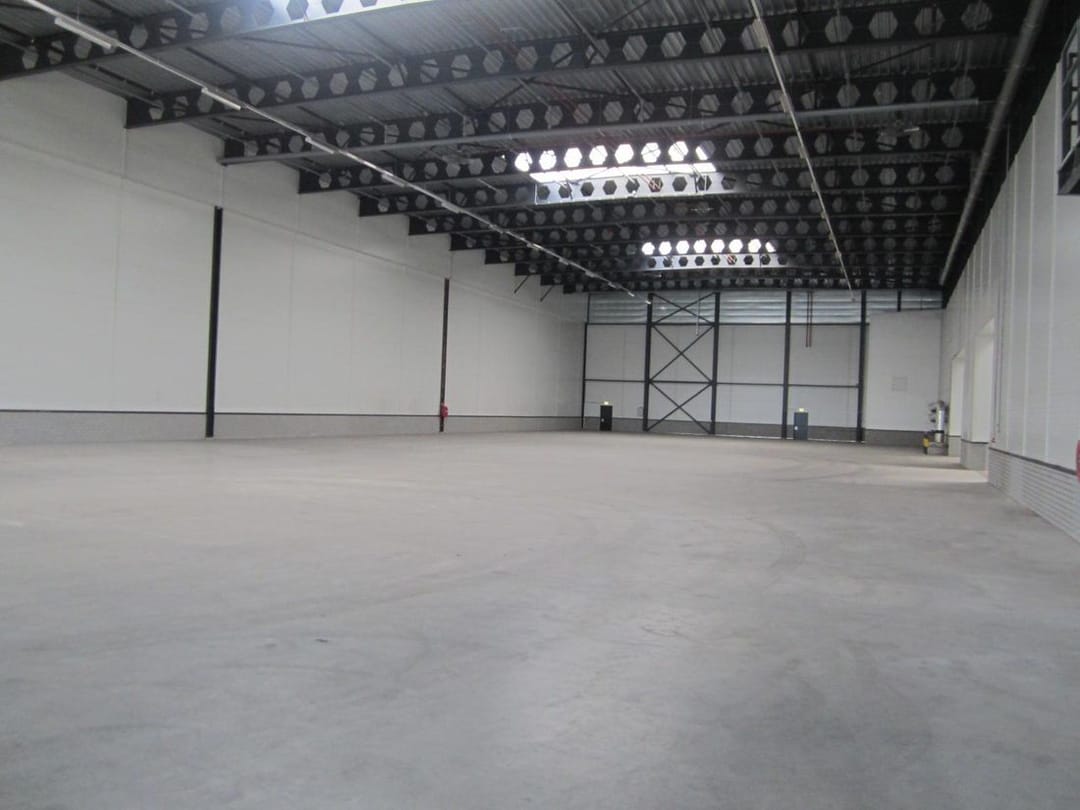 - Lichtstraten, overheaddeuren, krachtstroom, betonvloer, sprinkler, toilet, pantry, airconditioning en inbouwarmaturen