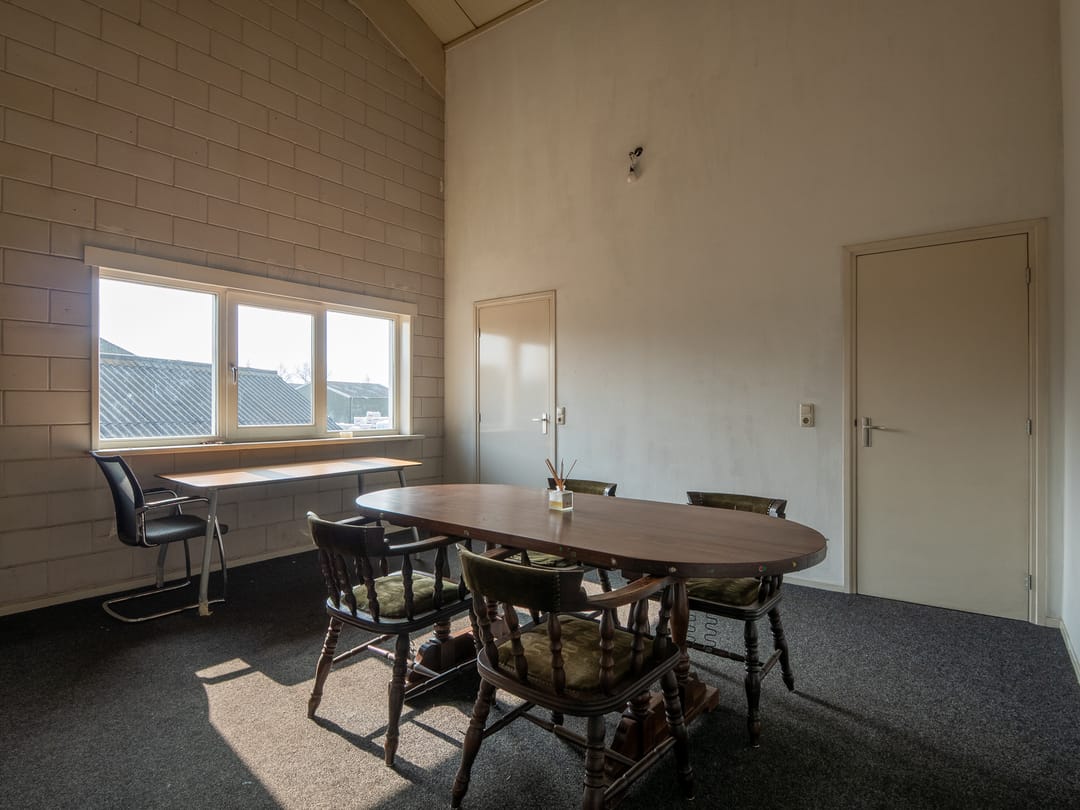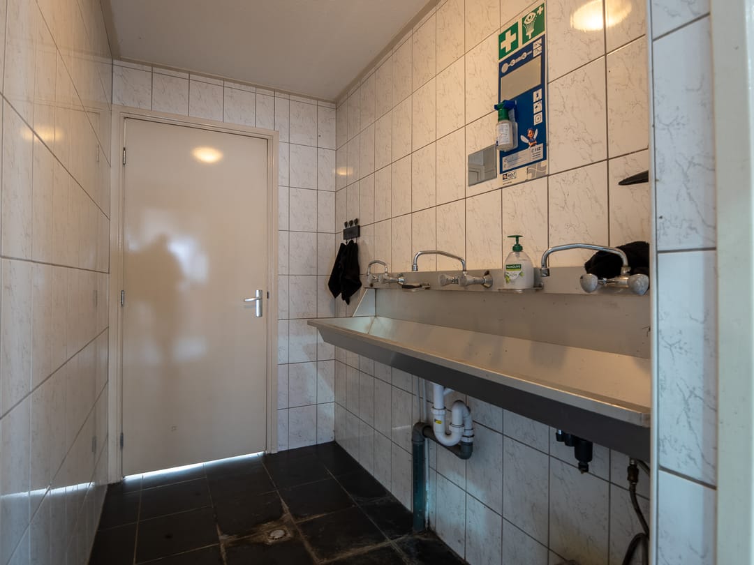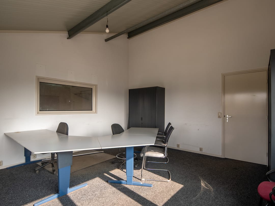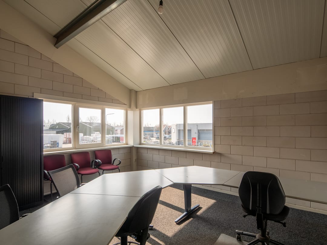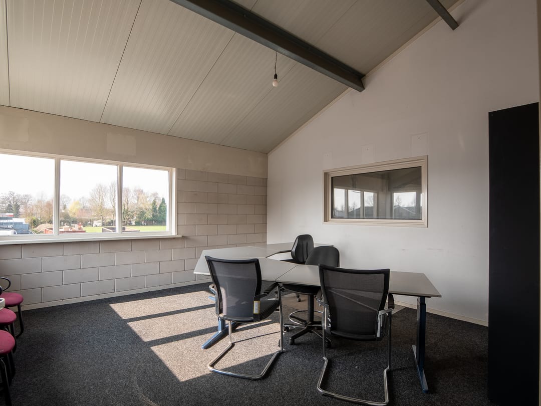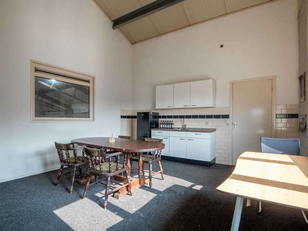 1e verdieping: de stalen trap biedt toegang tot de 1e verdieping waar aan de ene zijde een kantoorruimte en aan de andere zijde een kantineruimte te bereiken is. De grote raampartijen maken beide ruimtes aangenaam licht. De kantine beschikt over een keukenblok met wastafel en biedt toegang tot een bergruimte, die vanuit de werkplaats ook te bereiken is. Zo kunnen er eventueel met een heftruck spullen makkelijk naar boven gebracht worden.