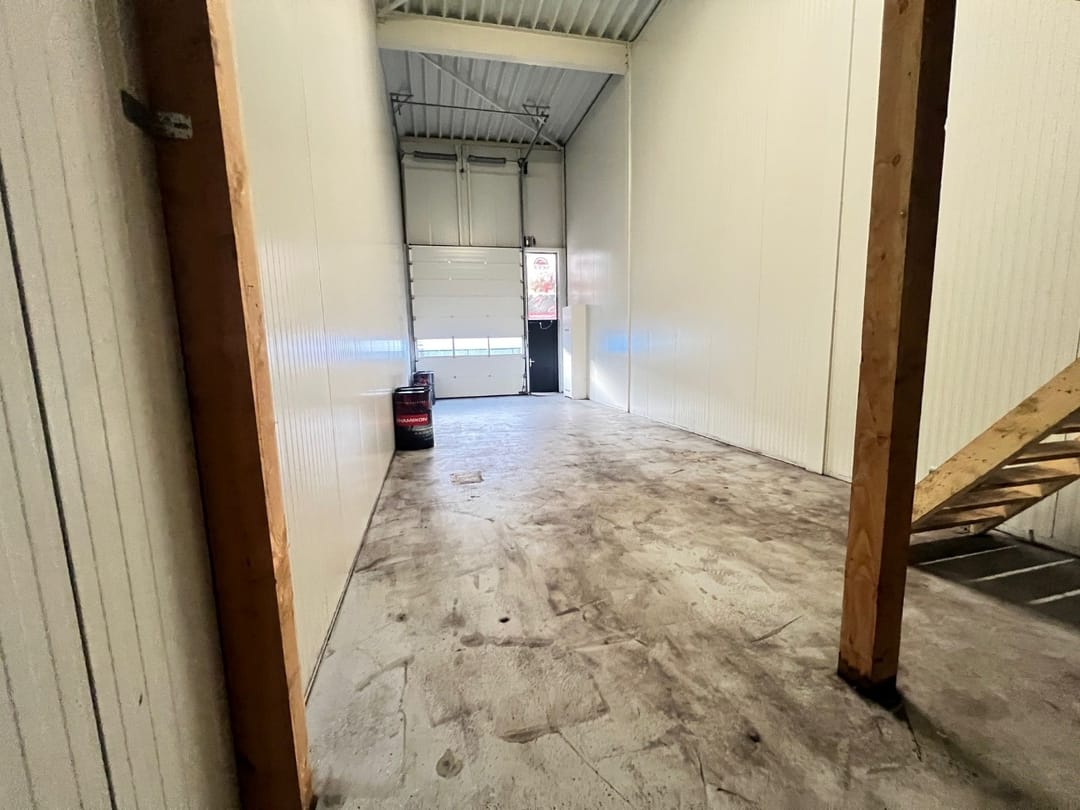 De hal heeft aan de voorzijde een vier meter hoge sectional roldeur alsmede een loopdeur. In de hal is achterin een toiletruimte aanwezig alsmede een entresol vloer van circa 12 m2. De vloer is uitgevoerd middels een vloeistofdichte gevlinderde betonvloer.
