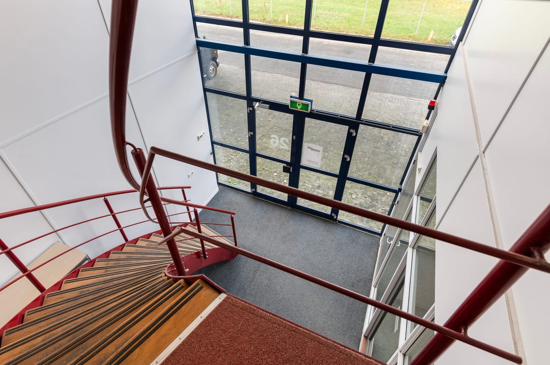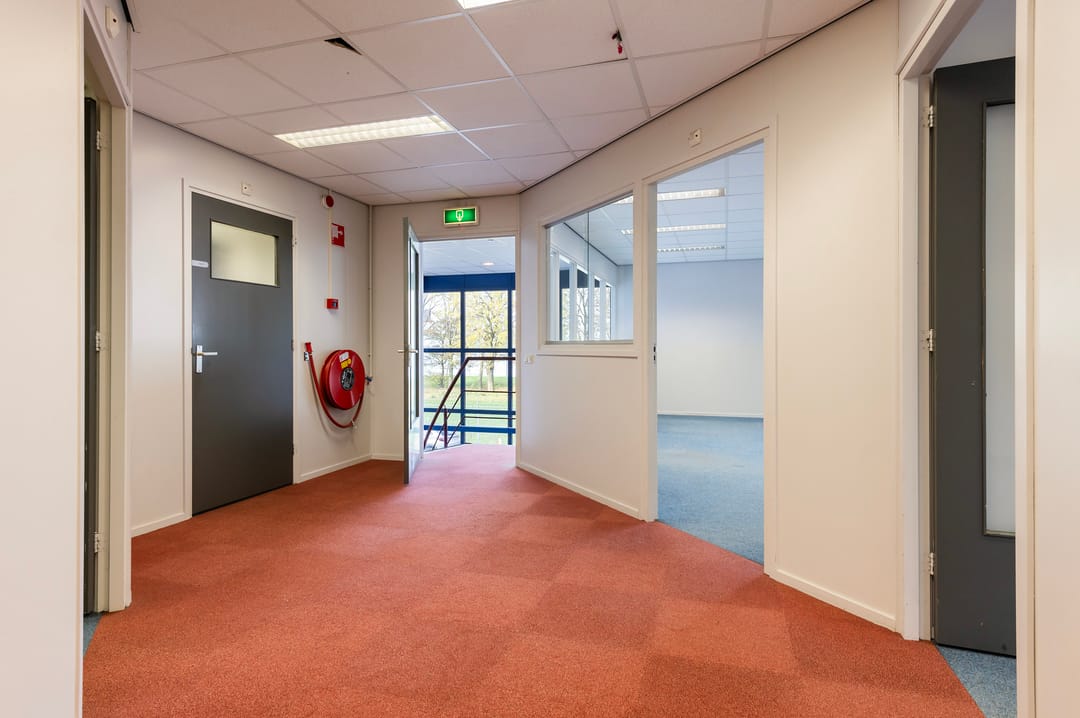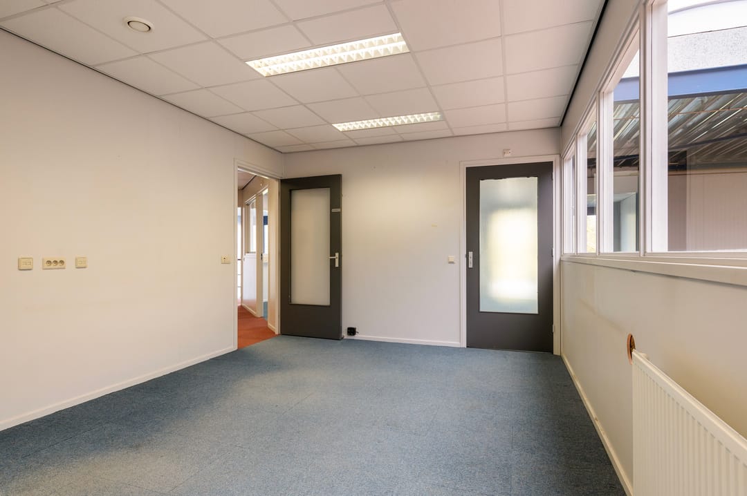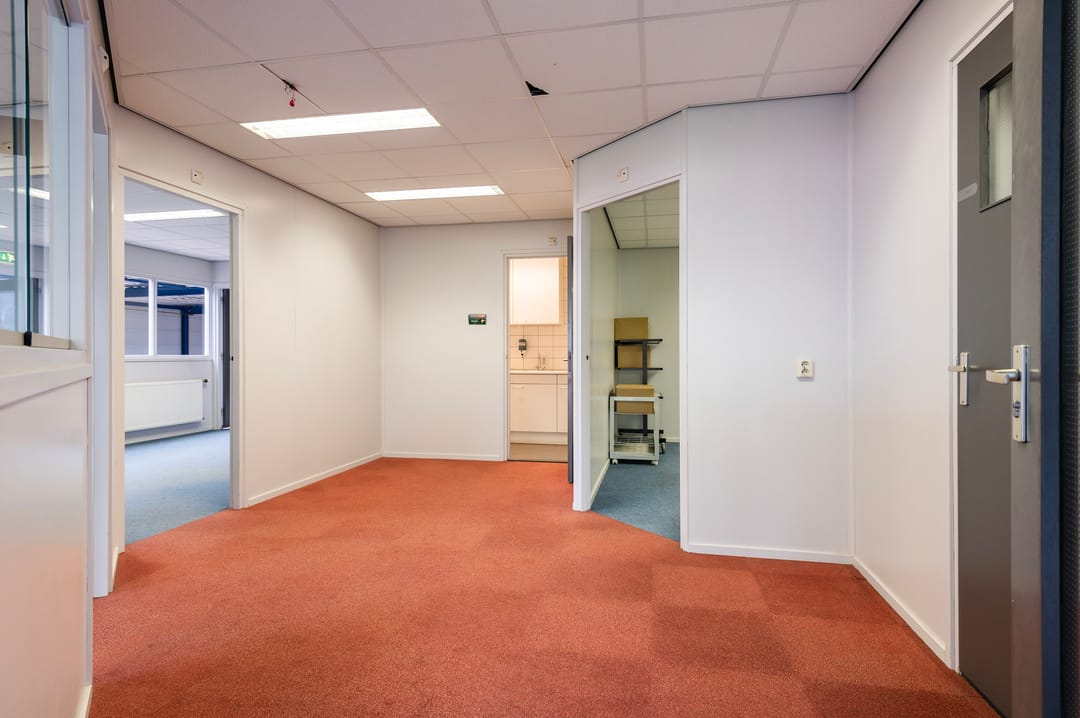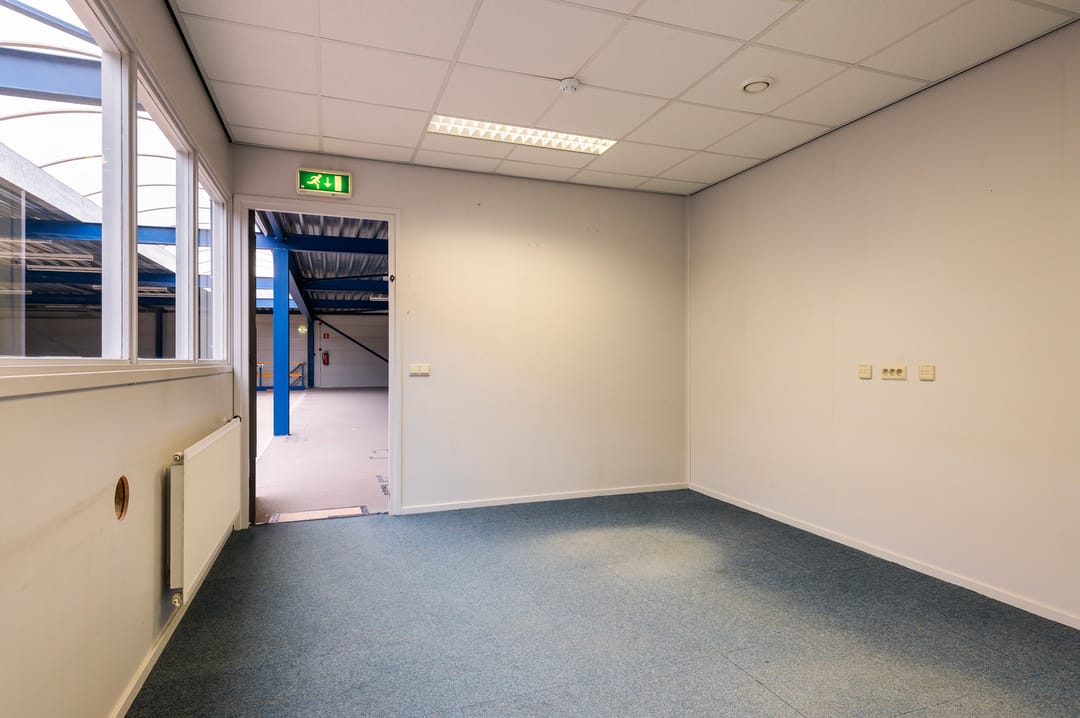 Indeling: entree, hal met loopdeur naar bedrijfshal en vaste trap naar kantoorruimte op de 1e verdieping. De hal is voorzien van verlichting en 2 sectorale roldeuren en is grotendeels geïsoleerd.