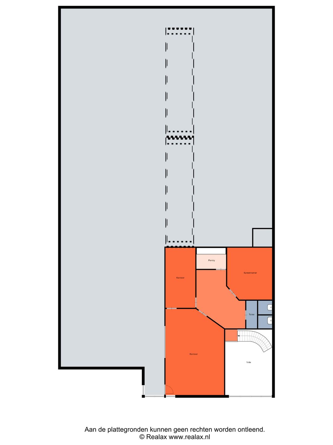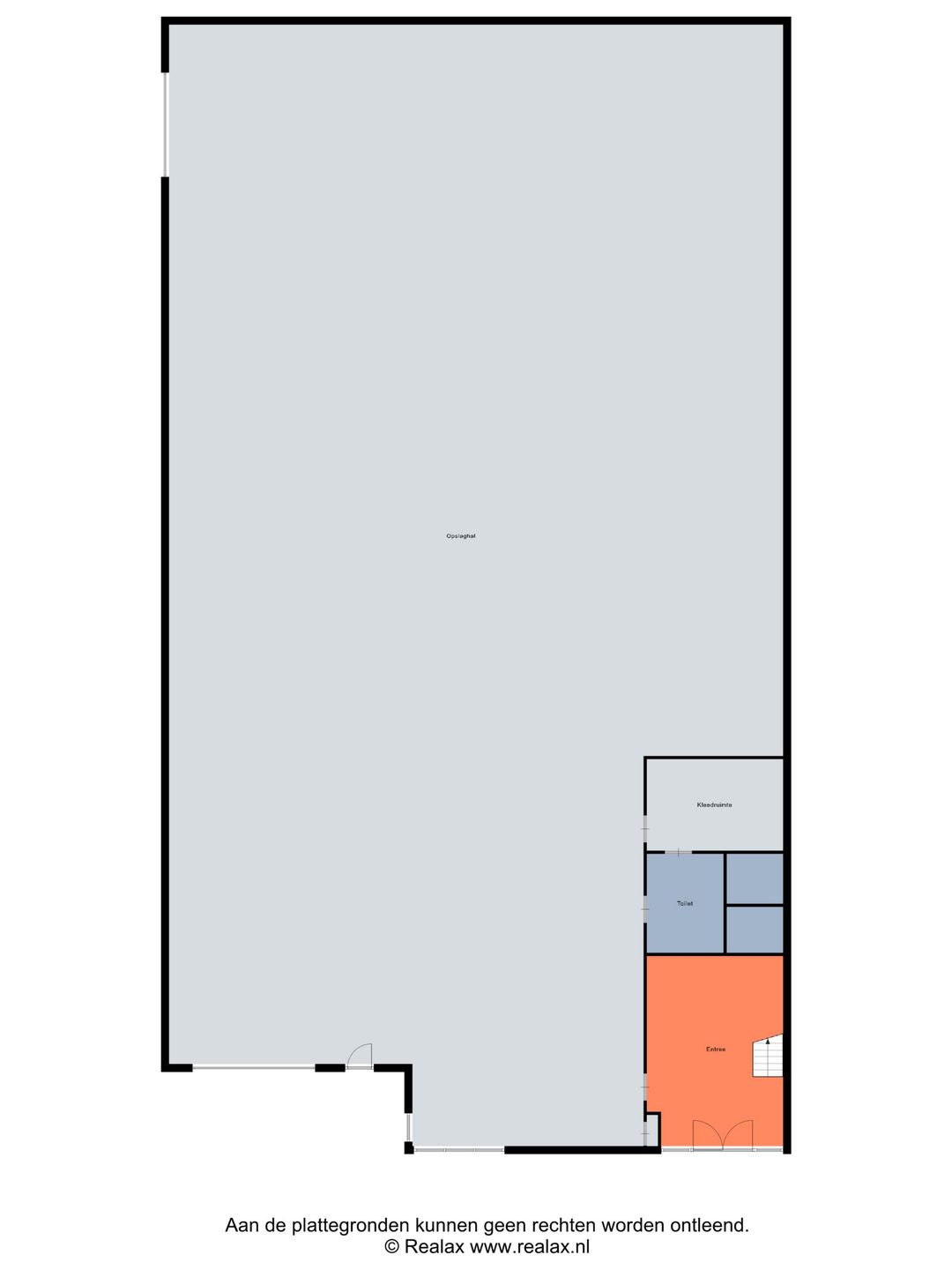 Begane grond: Ca. 590 m2 hal (vrije hoogte gedeeltelijk 3,6 m2 en 3 m2), toiletruimte ca. 20 m² en een ontvangsthal van ca. 17 m2