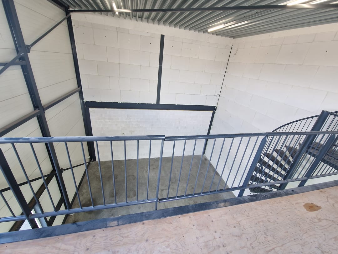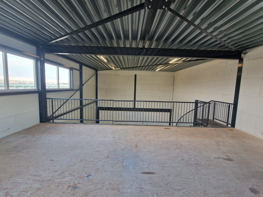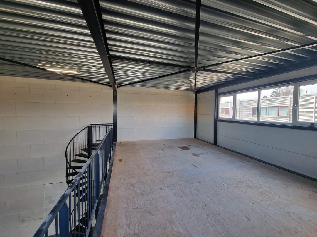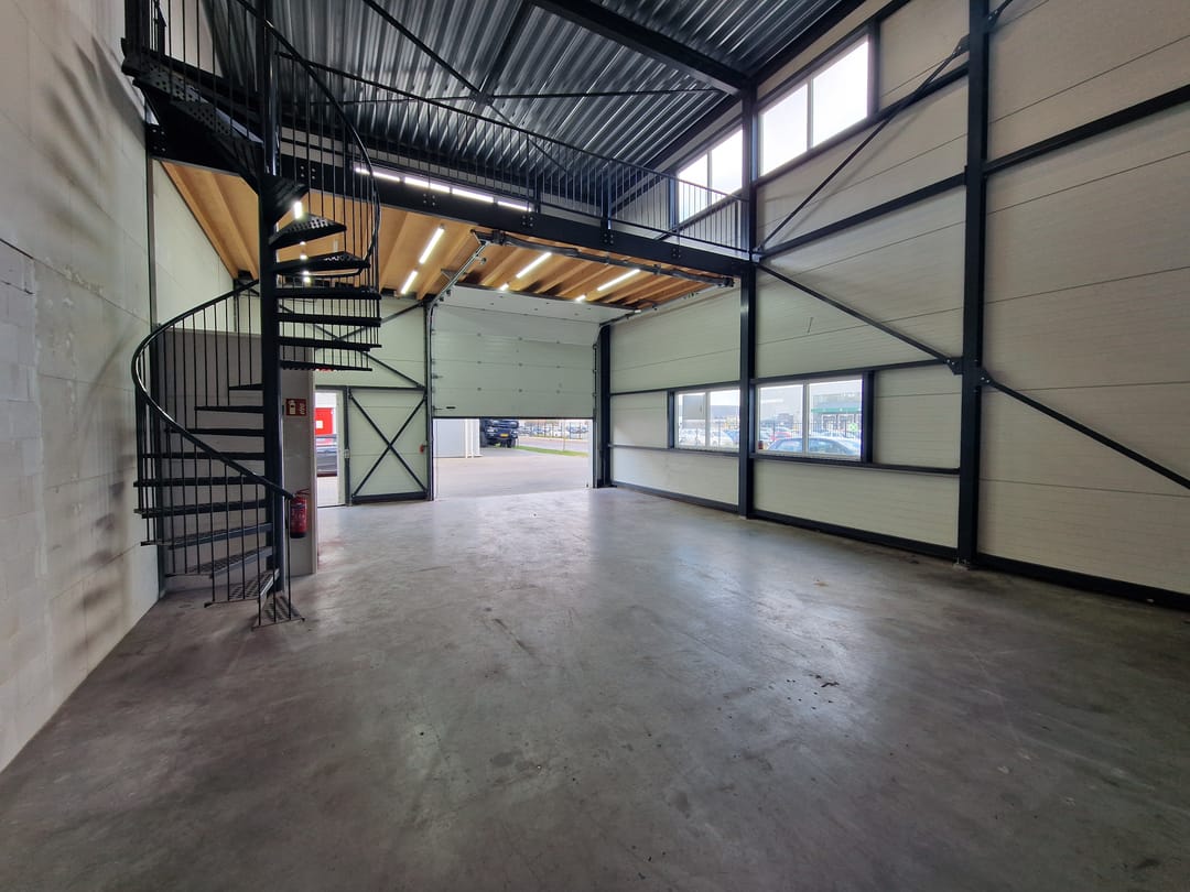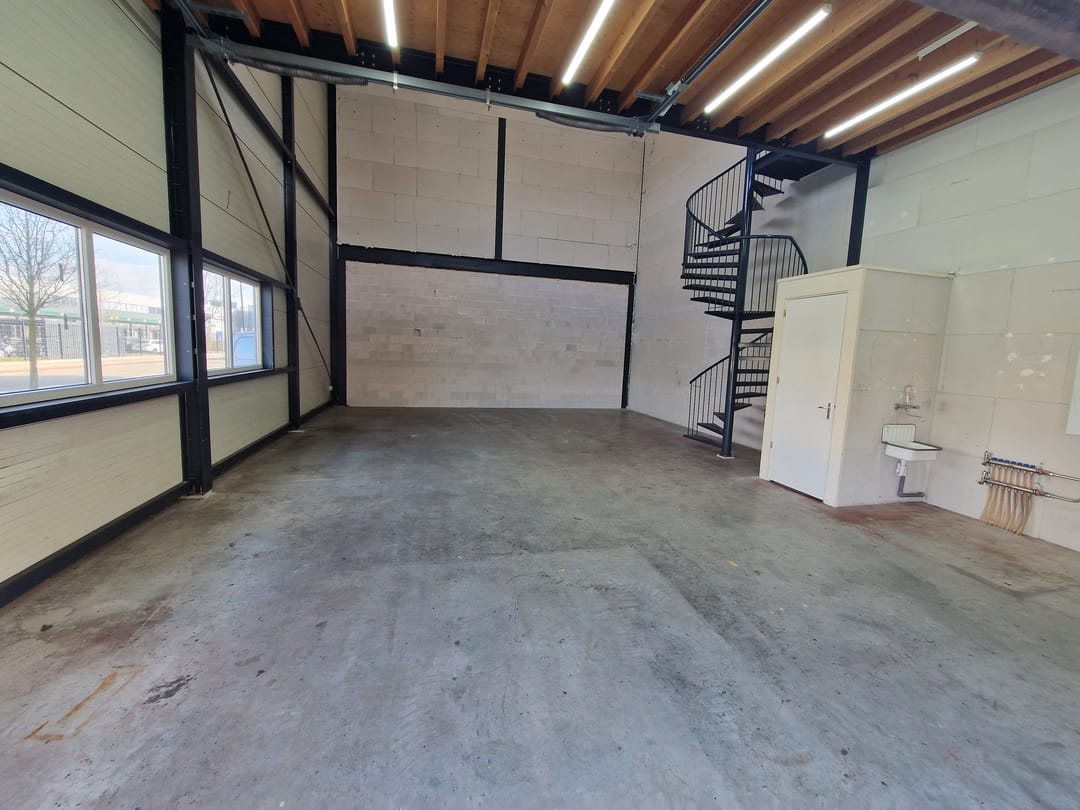 - Lichtstraten, overheaddeuren, betonvloer, toilet en te openen ramen